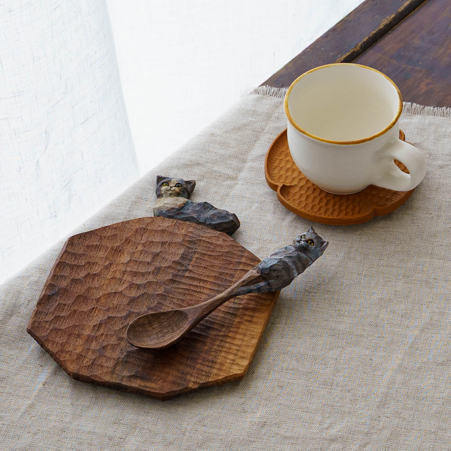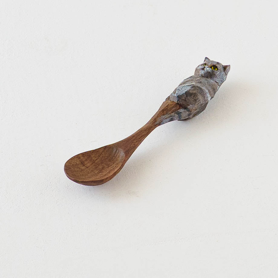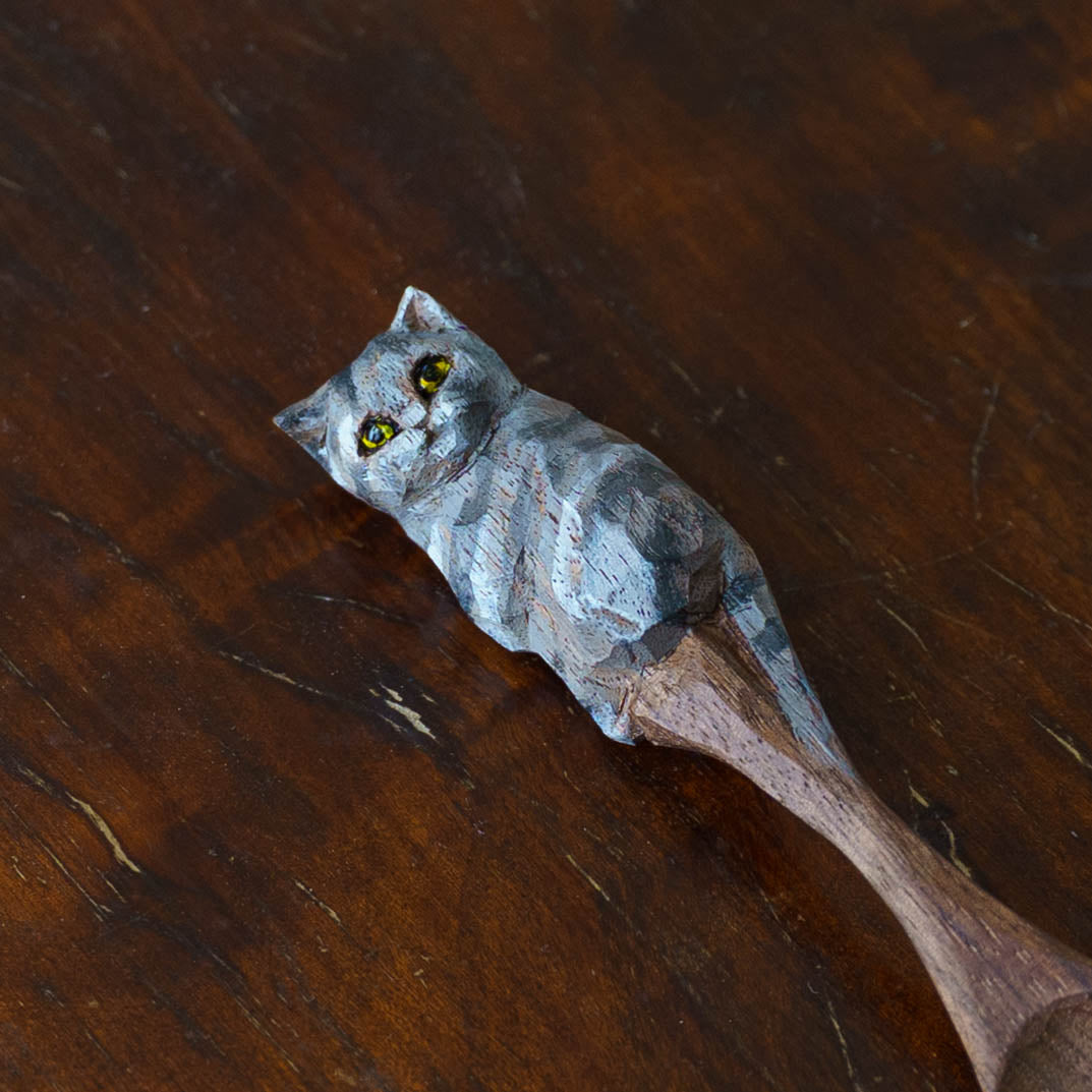 表情豊かな木彫りの猫から、のびやかな猫のポーズやふわふわの毛並みが軽やかに描かれたうつわやガラスへの絵付け。木彫りと絵付け、行き来する制作の中で、互いに刺激を受けながら猫の世界は少しずつ広がっています。
