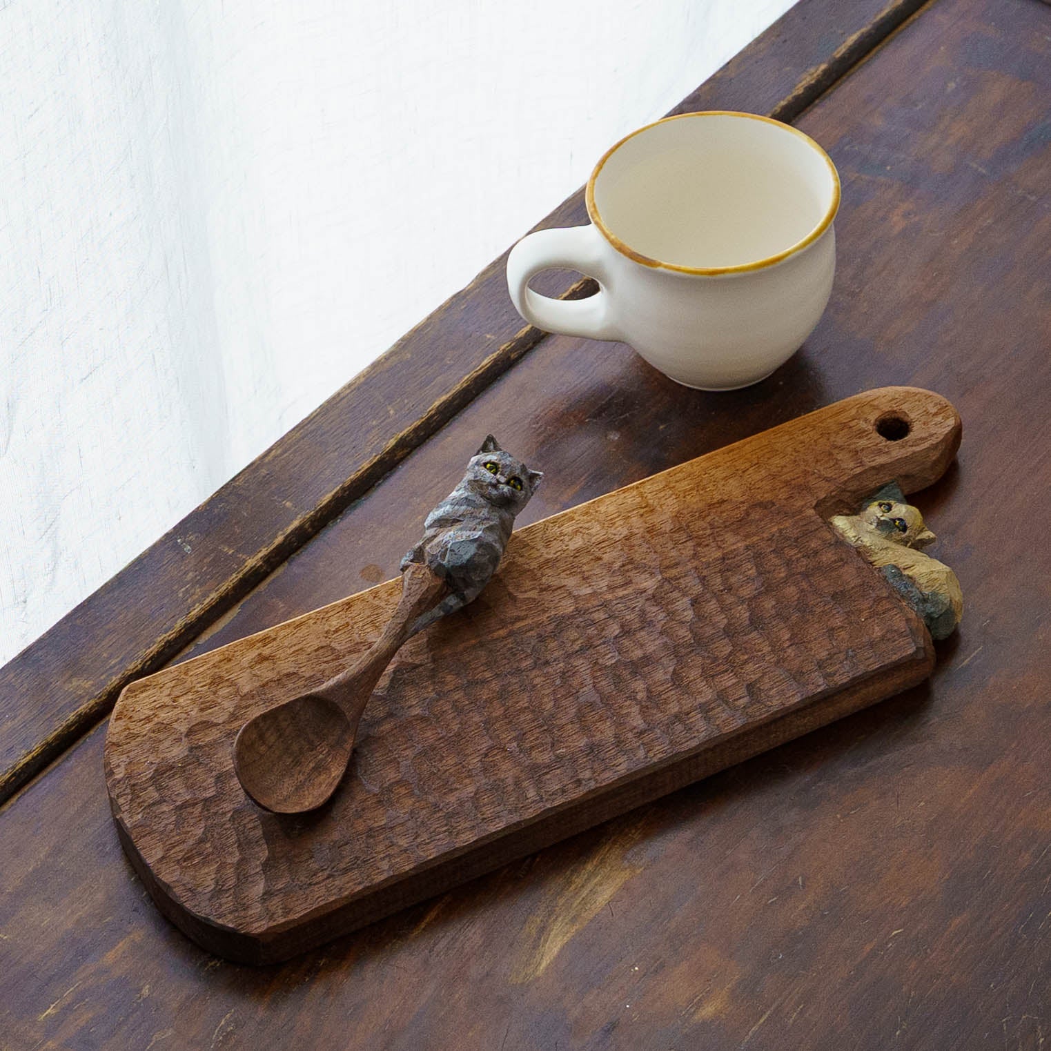 〇食品衛生法に適合した塗料を使用しております 〇食器用の中性洗剤をご使用いただいて問題ございません 〇猫の部分以外はガサガサと白っぽくなってきましたら、紙やすりで磨いていただいてから胡桃オイルやアマニオイルを塗っていただくと長くご愛用いただけます。オイルだけ塗るだけでも大丈夫です。猫の部分が気になるようでしたら、紙やすりの使用は控えていただいて、オイルを少しつける程度でお願いします |