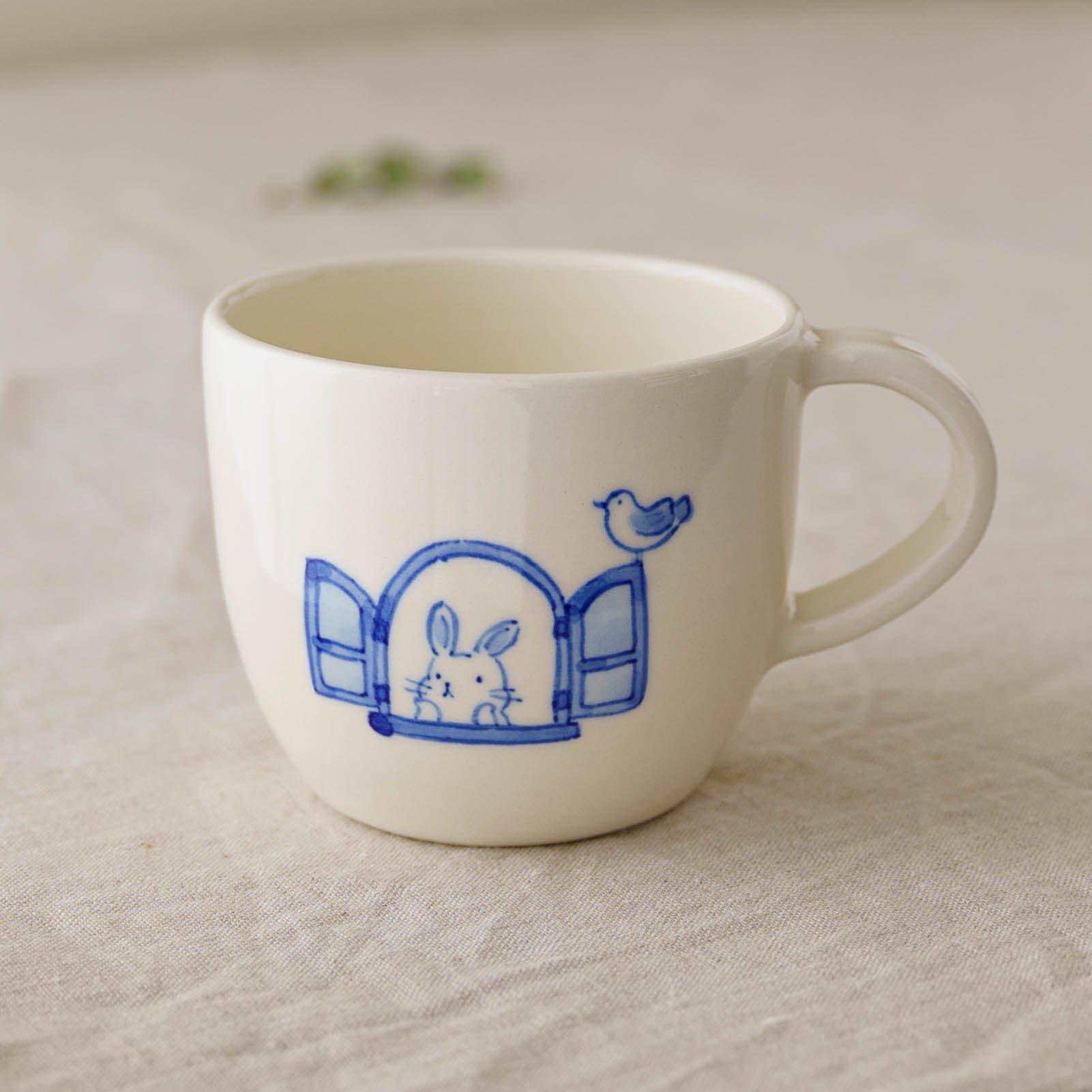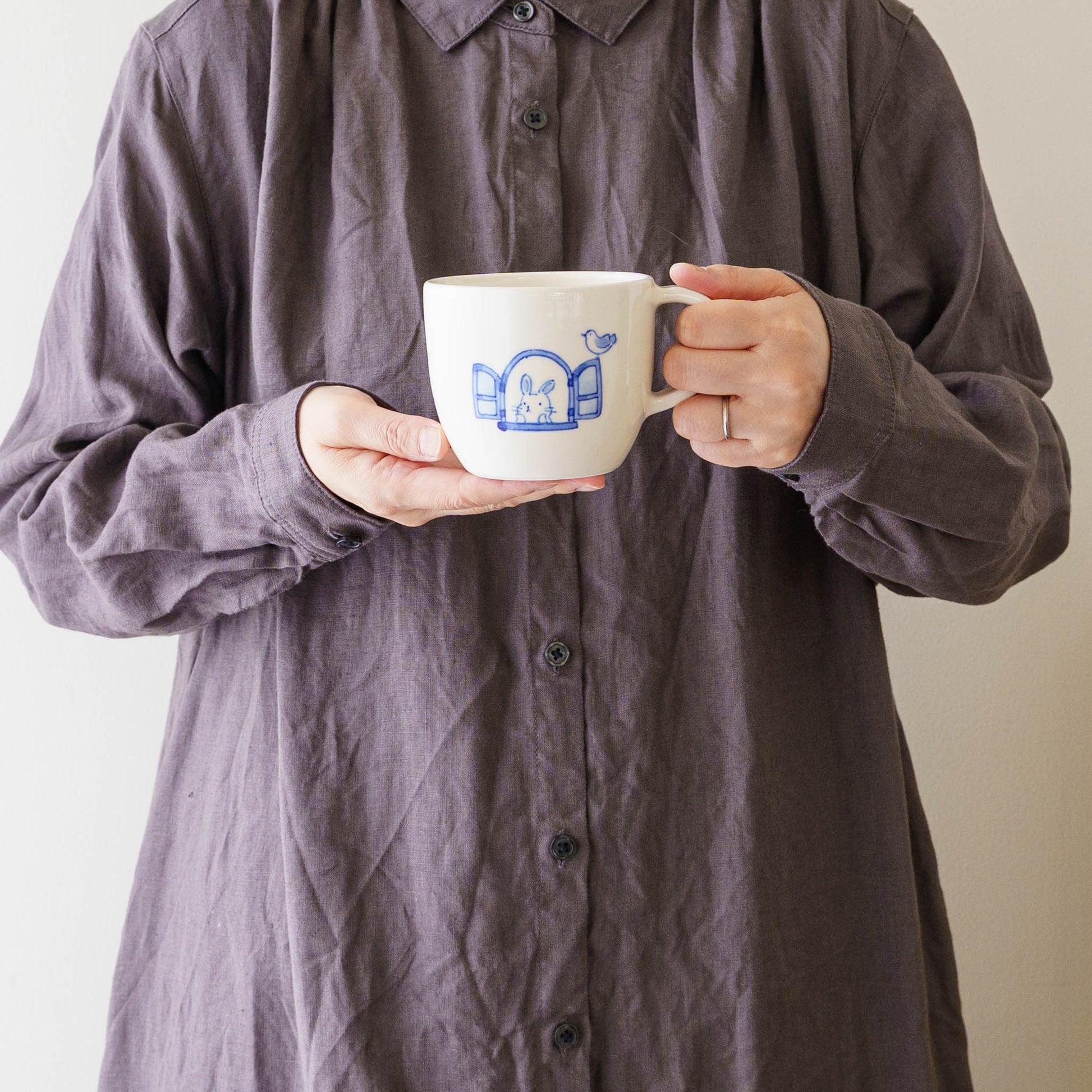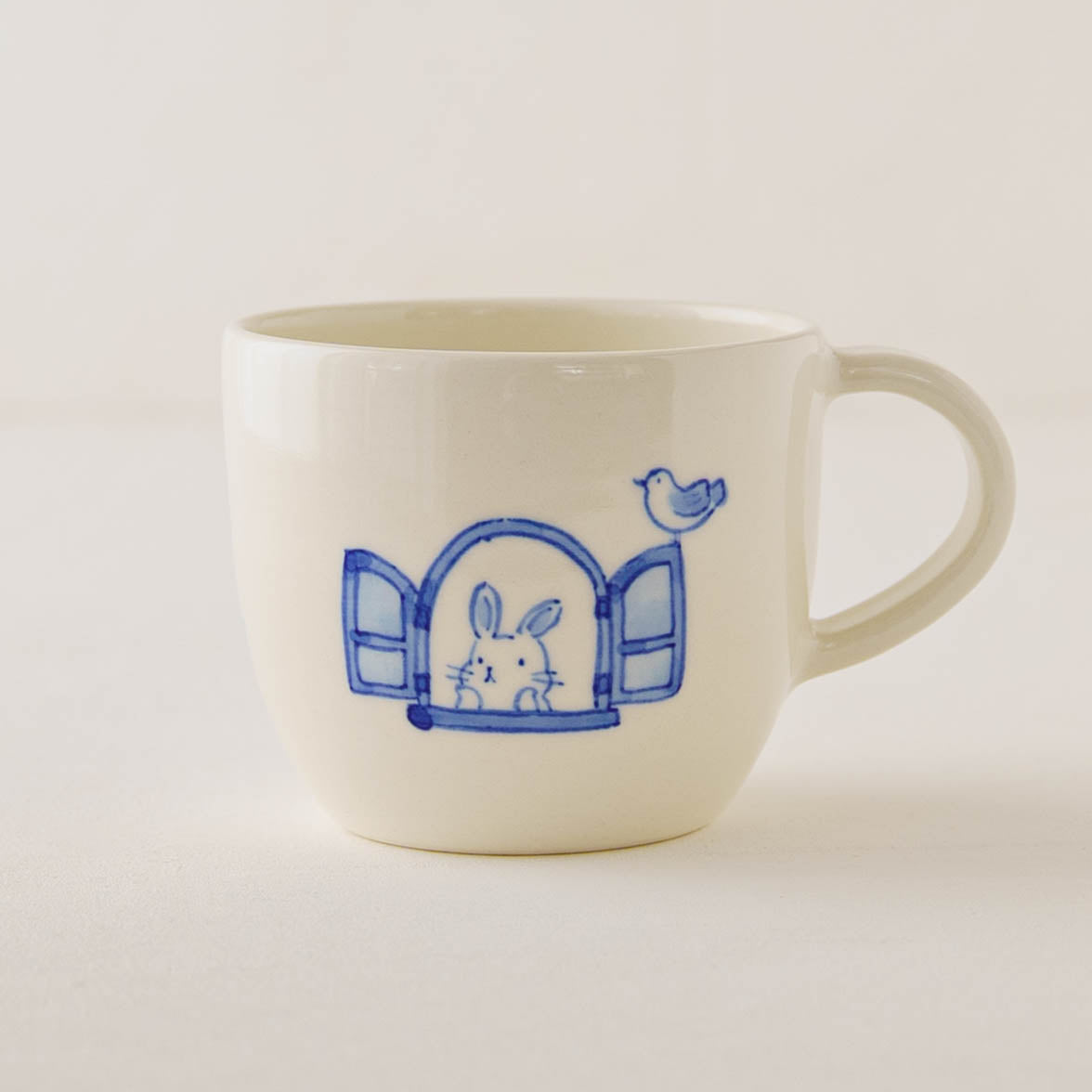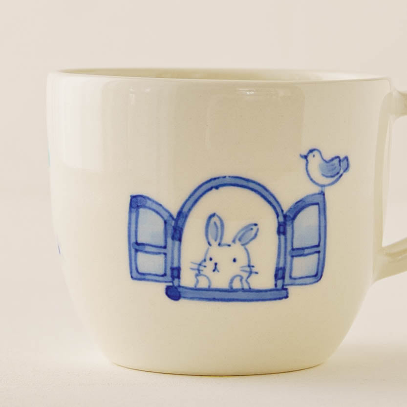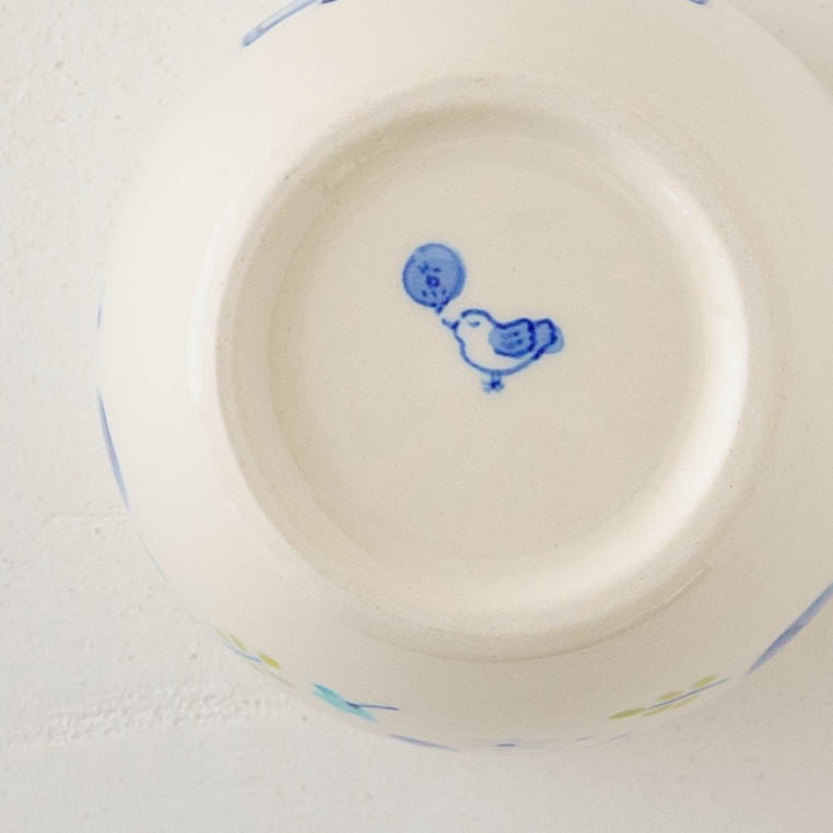 2匹の愛猫と暮らすなかで生まれた発想と、古い染め付けのうつわに対する愛情を大切にしながら、染め付け技法を用いてやさしいタッチでのびやかに描いています。どこかお茶目な表情のどうぶつたちが、いたるところに描かれ、まるでかくれんぼしているような面白さが散りばめられています。手に取るたびにほっこりあたたかな気持ちにしてくれます。