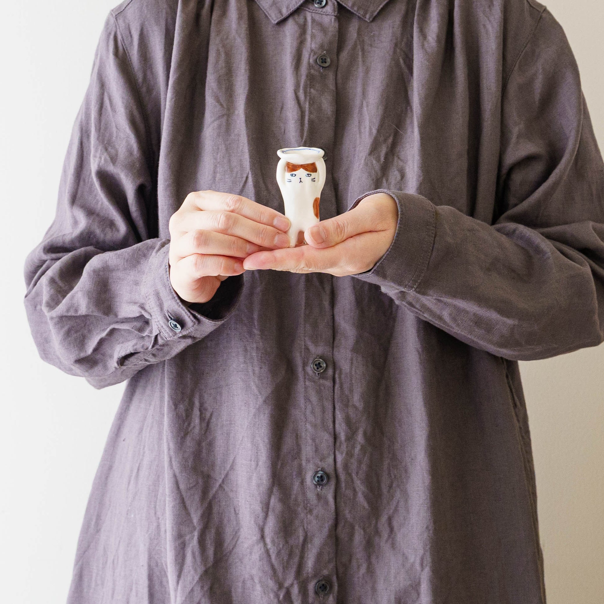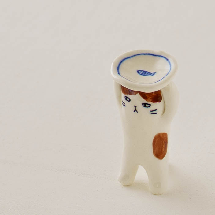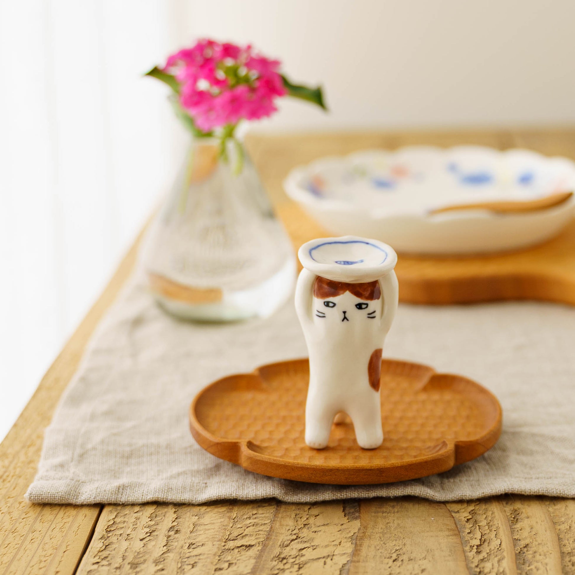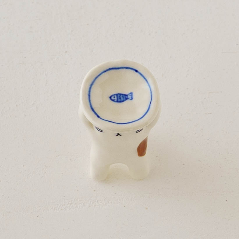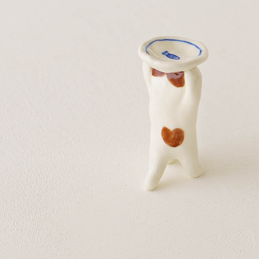 2匹の愛猫と暮らすなかで生まれた発想と、古い染め付けのうつわに対する愛情を大切にしながら、染め付け技法を用いてやさしいタッチでのびやかに描いています。どこかお茶目な表情のどうぶつたちが、いたるところに描かれ、まるでかくれんぼしているような面白さが散りばめられています。手に取るたびにほっこりあたたかな気持ちにしてくれます。