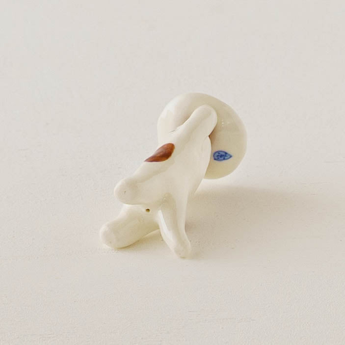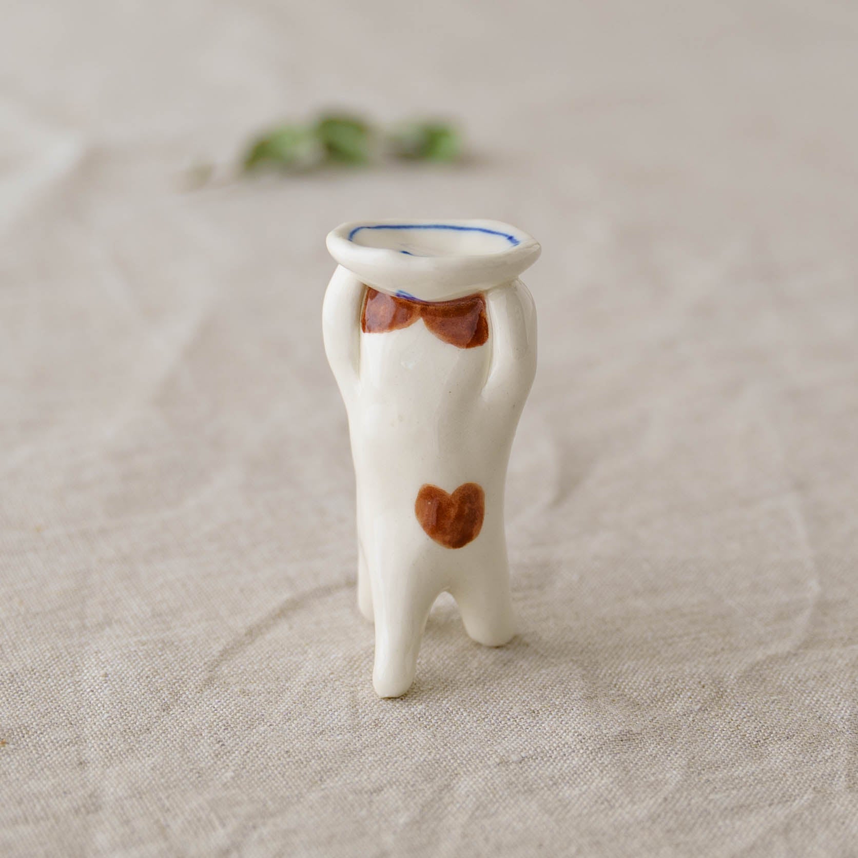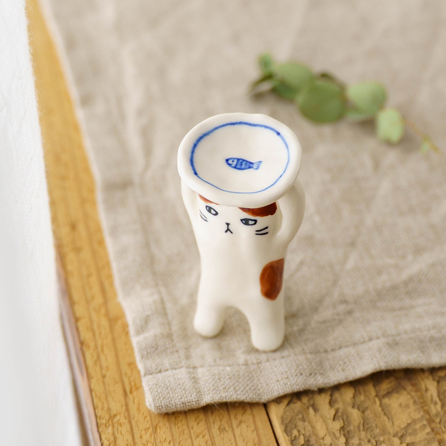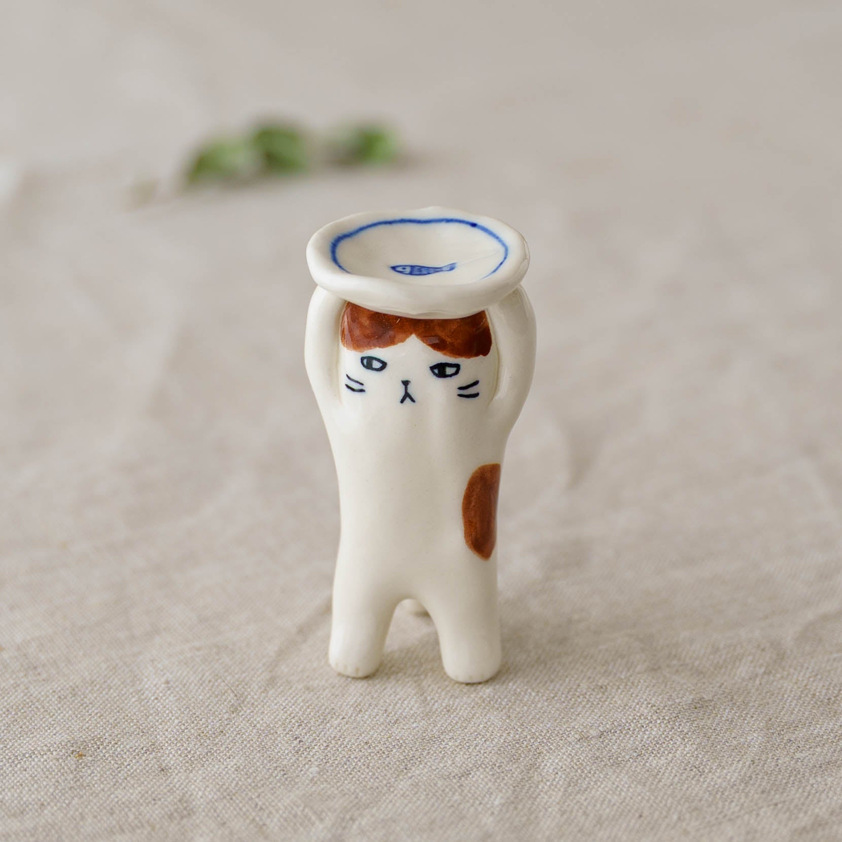 2匹の愛猫と暮らすなかで生まれた発想と、古い染め付けのうつわに対する愛情を大切にしながら、染め付け技法を用いてやさしいタッチでのびやかに描いています。どこかお茶目な表情のどうぶつたちが、いたるところに描かれ、まるでかくれんぼしているような面白さが散りばめられています。手に取るたびにほっこりあたたかな気持ちにしてくれます。