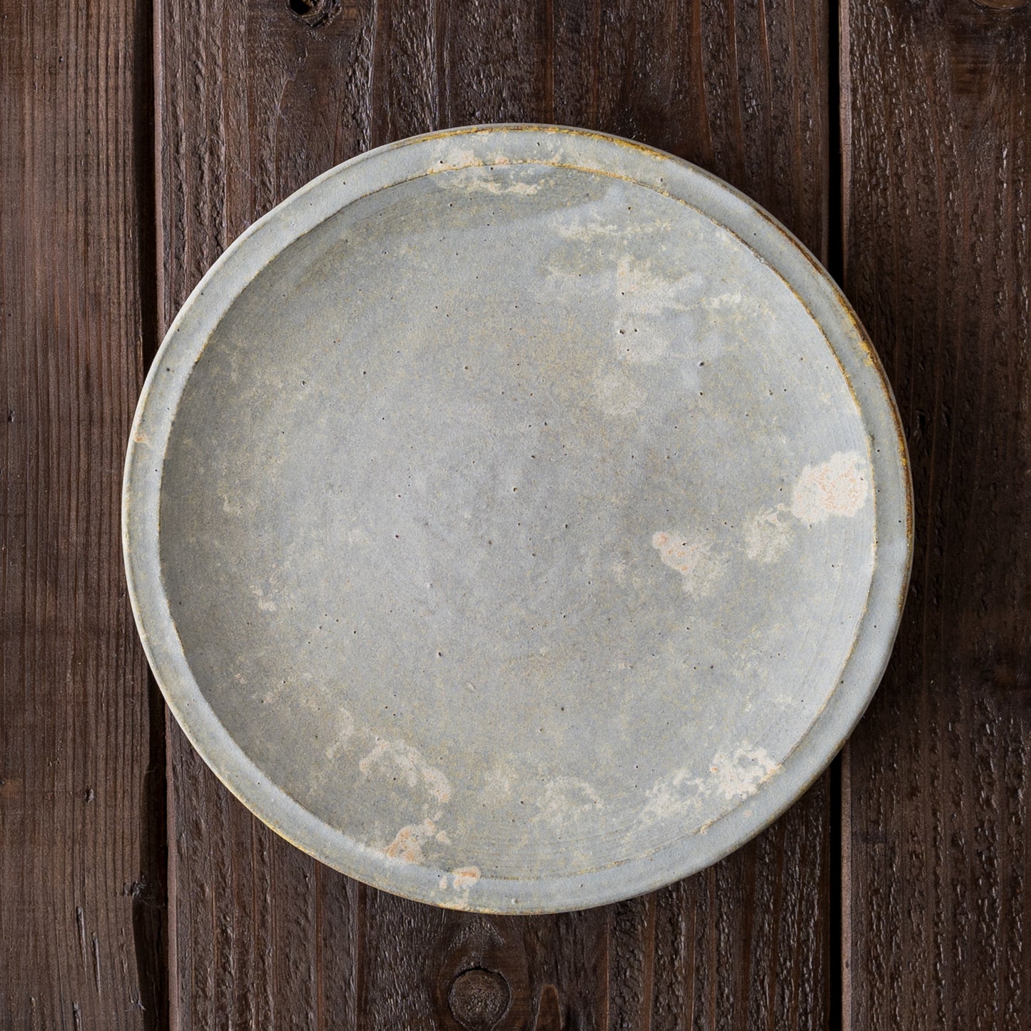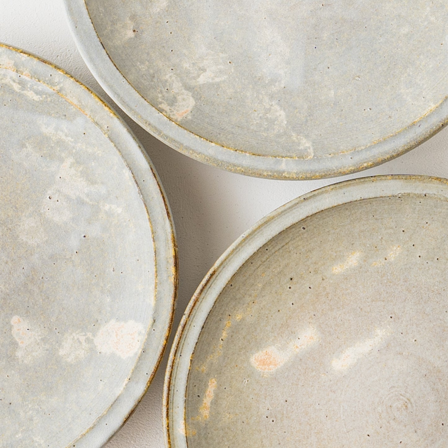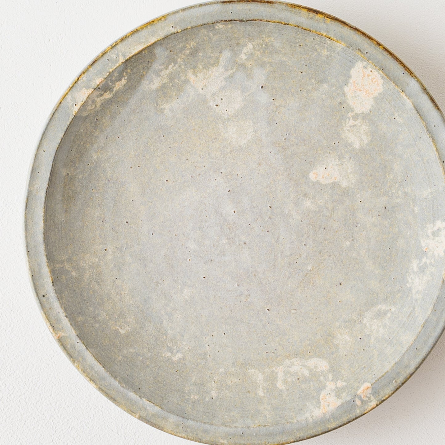 石の彫刻のような優雅で上品な佇まいのリム皿。うつわの表面に表れた泡のような幻想的な白。スポンジで釉薬をペタペタと塗り重ねて焼くことで、ひとつひとつ違った独特な表情が生まれます。山吹色のような色やほのかな赤みの焼き色も表れたりと味わいのある細リム皿です。