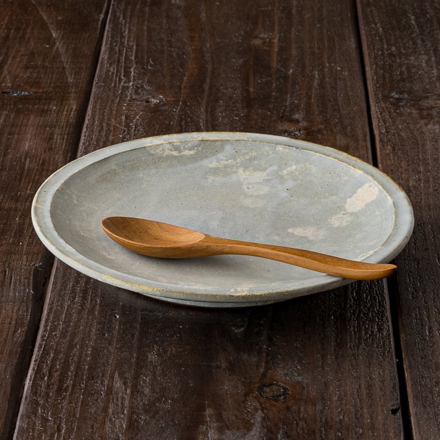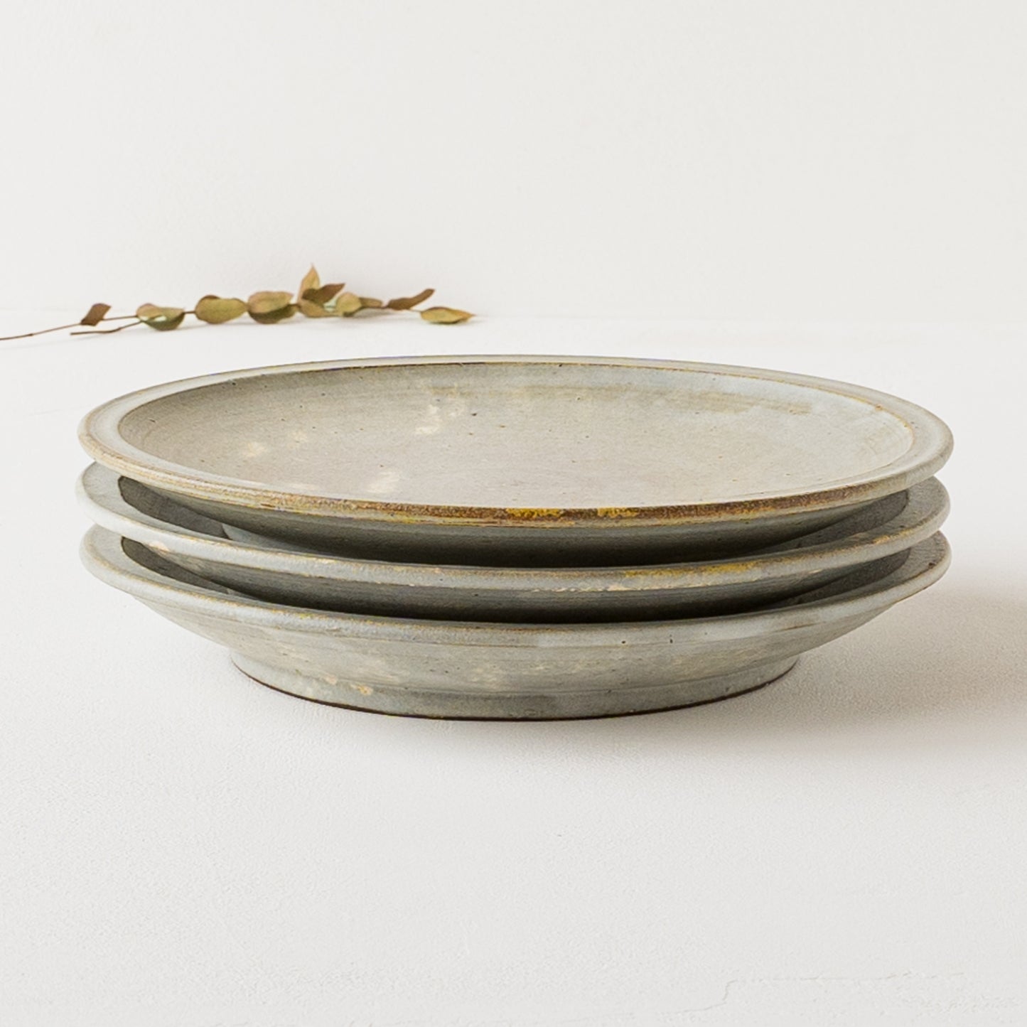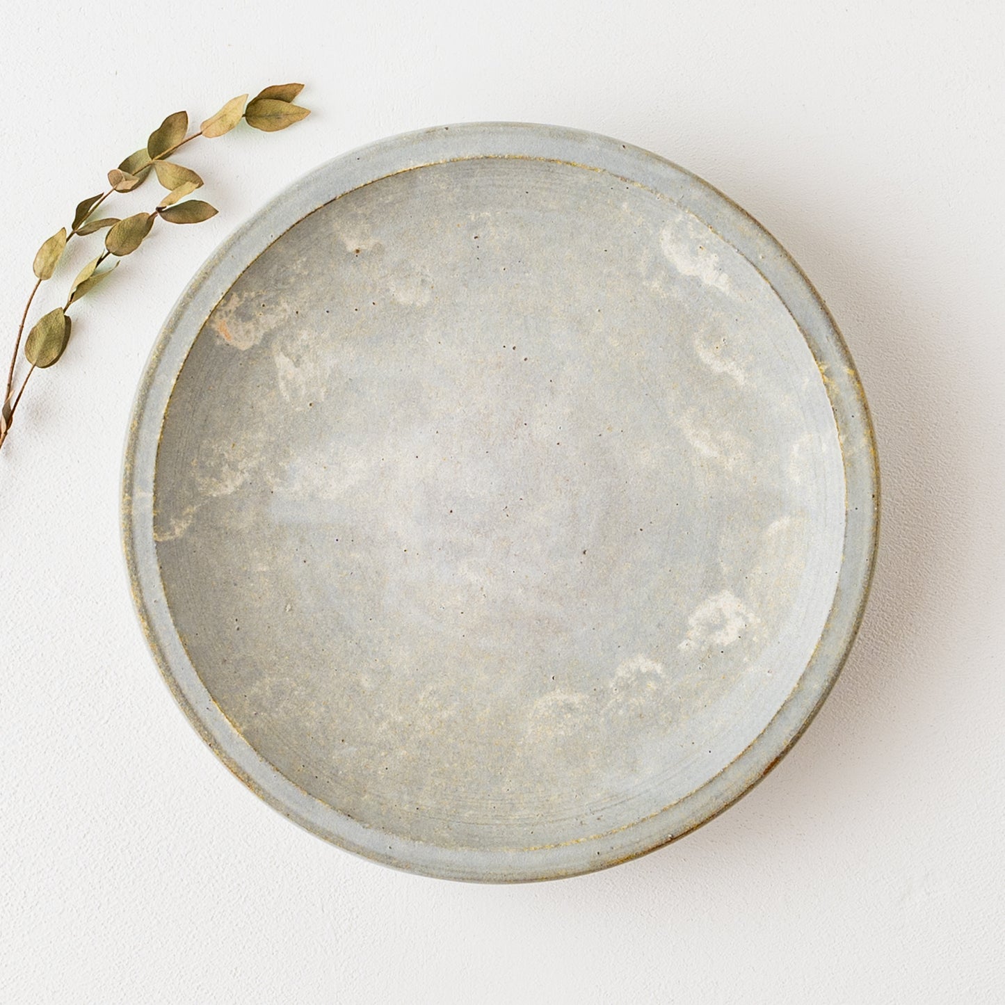 石の彫刻のような優雅で上品な佇まいのリム皿。うつわの表面に表れた泡のような幻想的な白。スポンジで釉薬をペタペタと塗り重ねて焼くことで、ひとつひとつ違った独特な表情が生まれます。山吹色のような色やほのかな赤みの焼き色も表れたりと味わいのある細リム皿です。