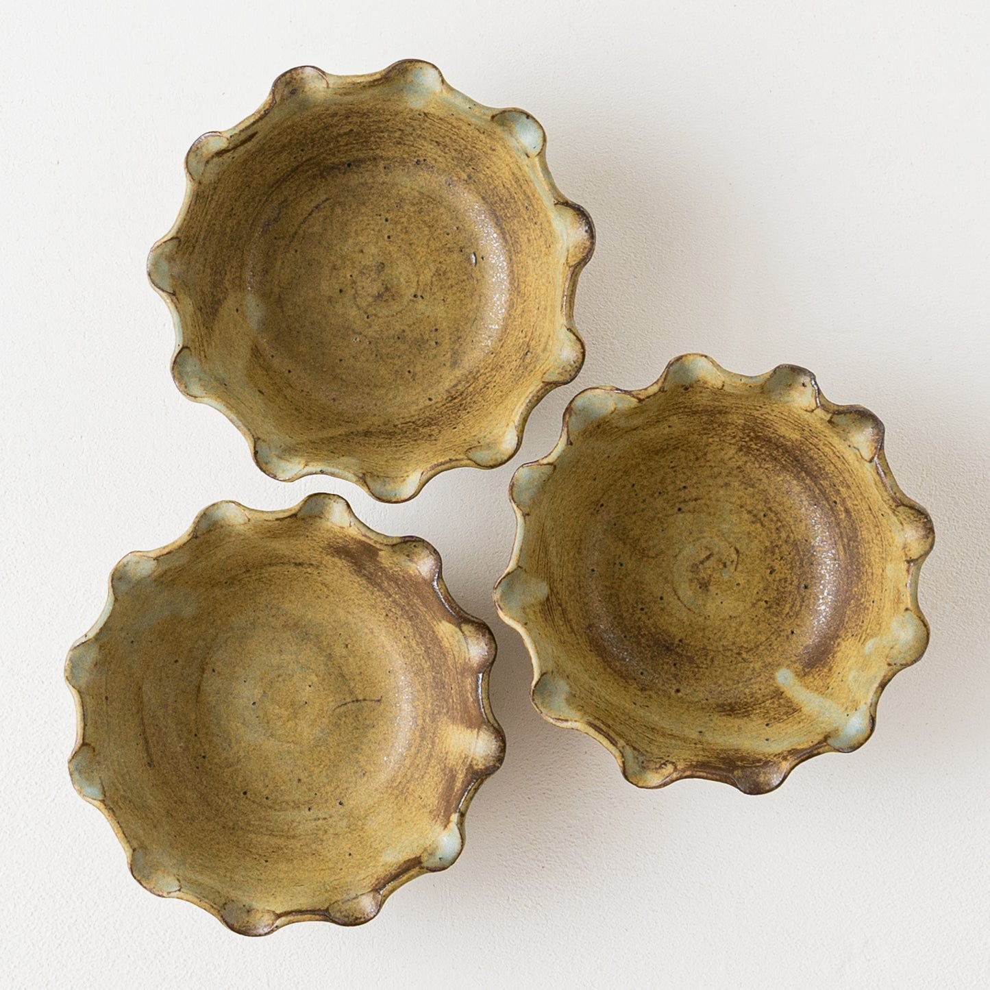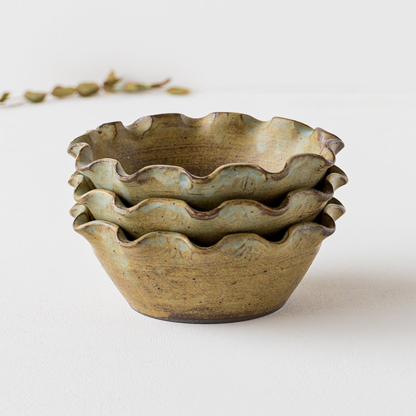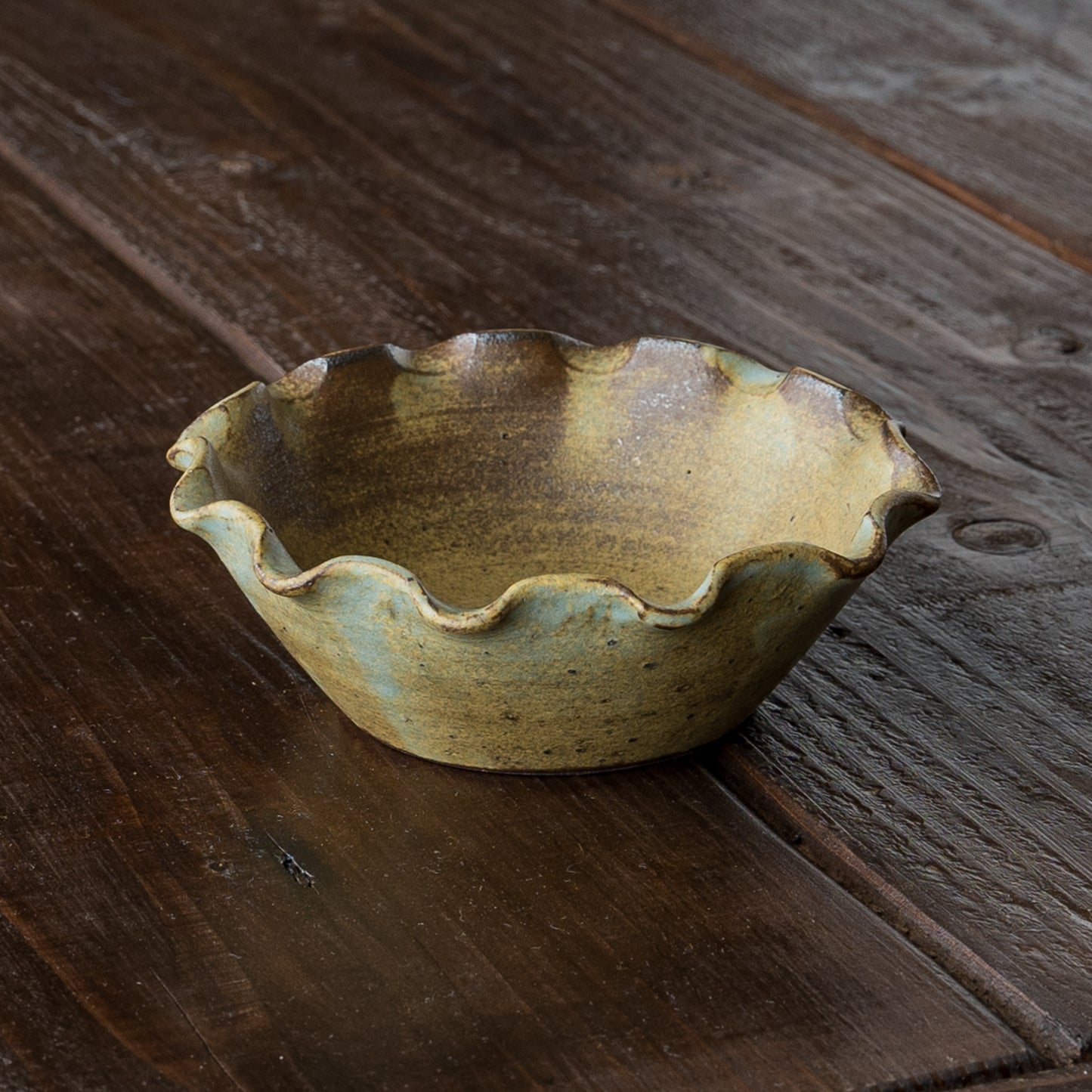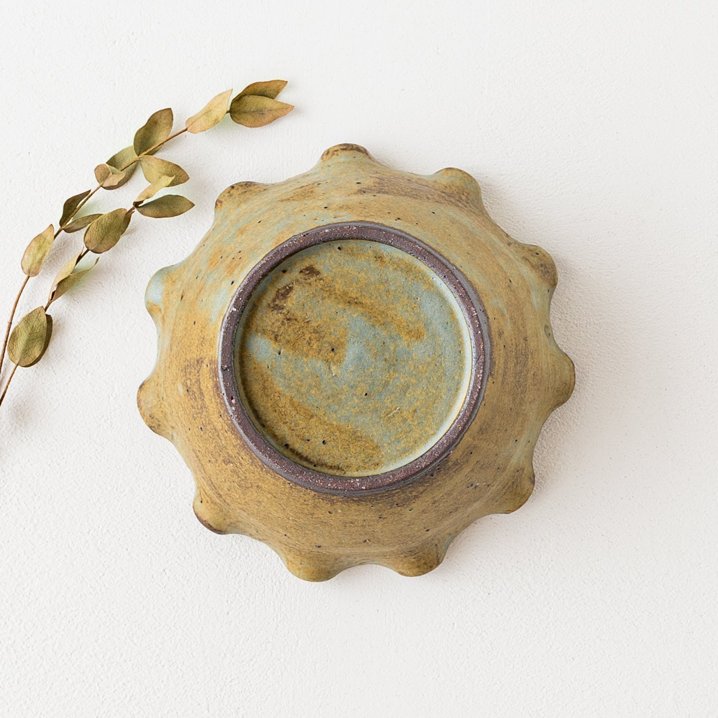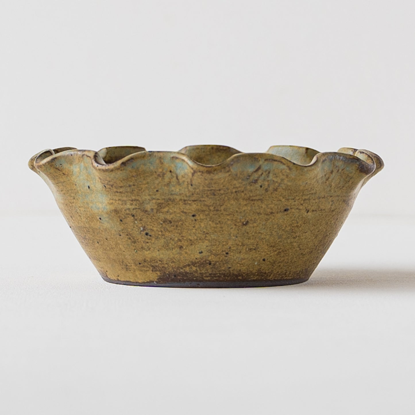 モス(Moss)とは苔(こけ)のこと。苔のように深くて渋いモスグリーンの小鉢。釉薬を筆で塗り重ねているので、ひとつひとつ違った独特の表情が生まれます。鉄分を多く含む赤土を使用しているので錆色の出方も趣きがあって素敵です。