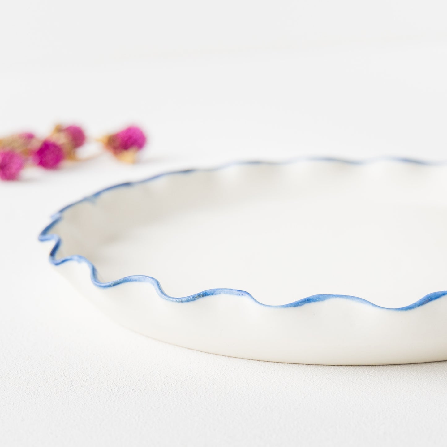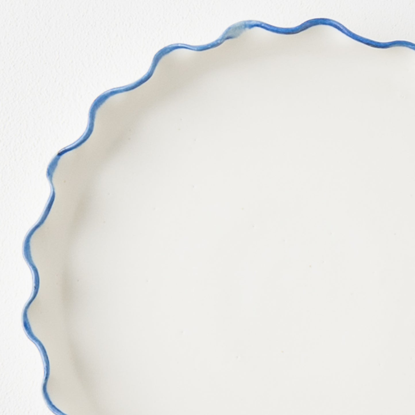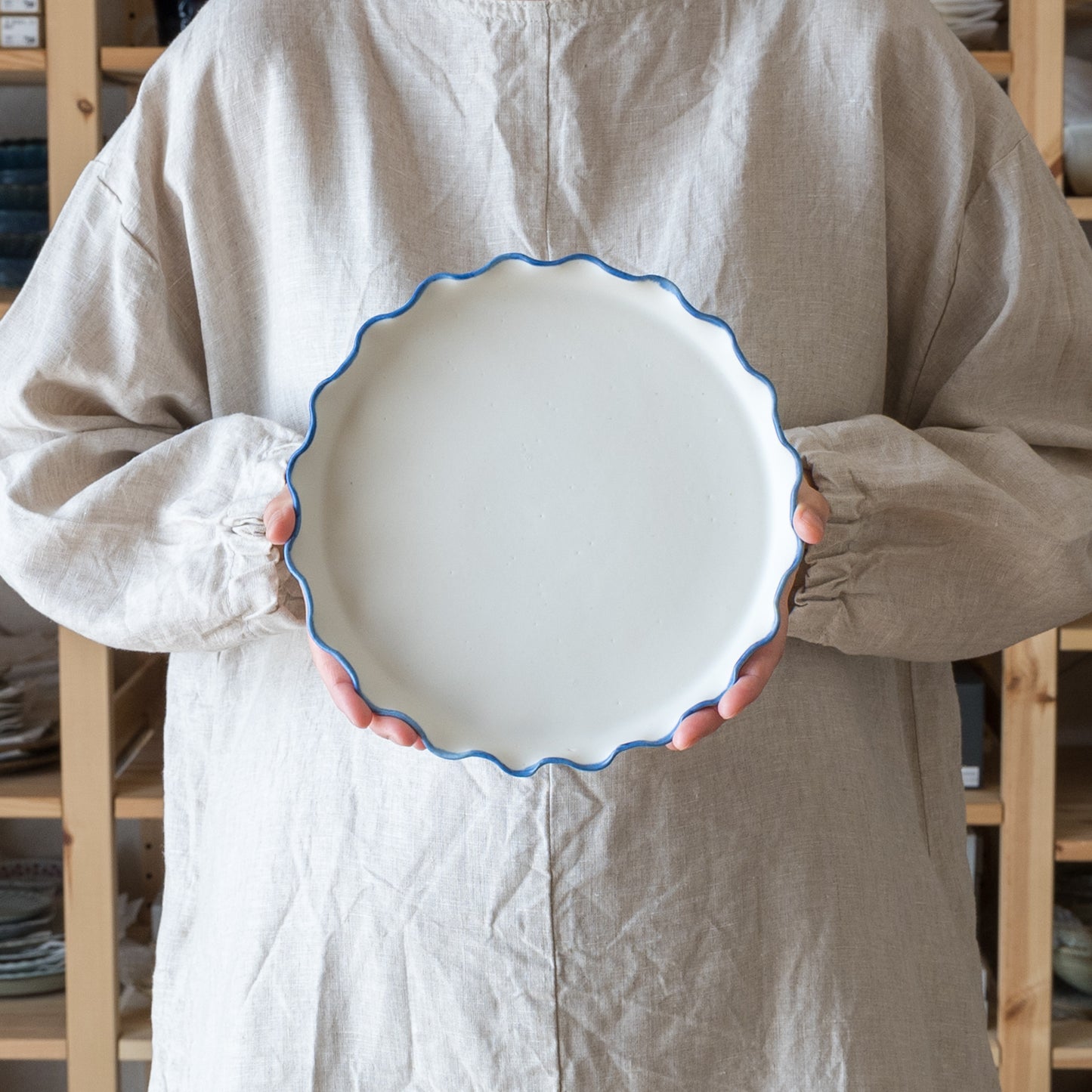 縁が波を打ったデザインのなみなみのプレート。指先の感覚でひとつひとつの「なみ」を等間隔に作り上げているので手づくりならではの個性と味わいを感じます。縁取りに施された爽やかなブルーがうつわ全体引き締めて素敵です。径は約22cmあり深みも約1.5cmあるので汁気のあるお料理を安心して盛り付けられます。