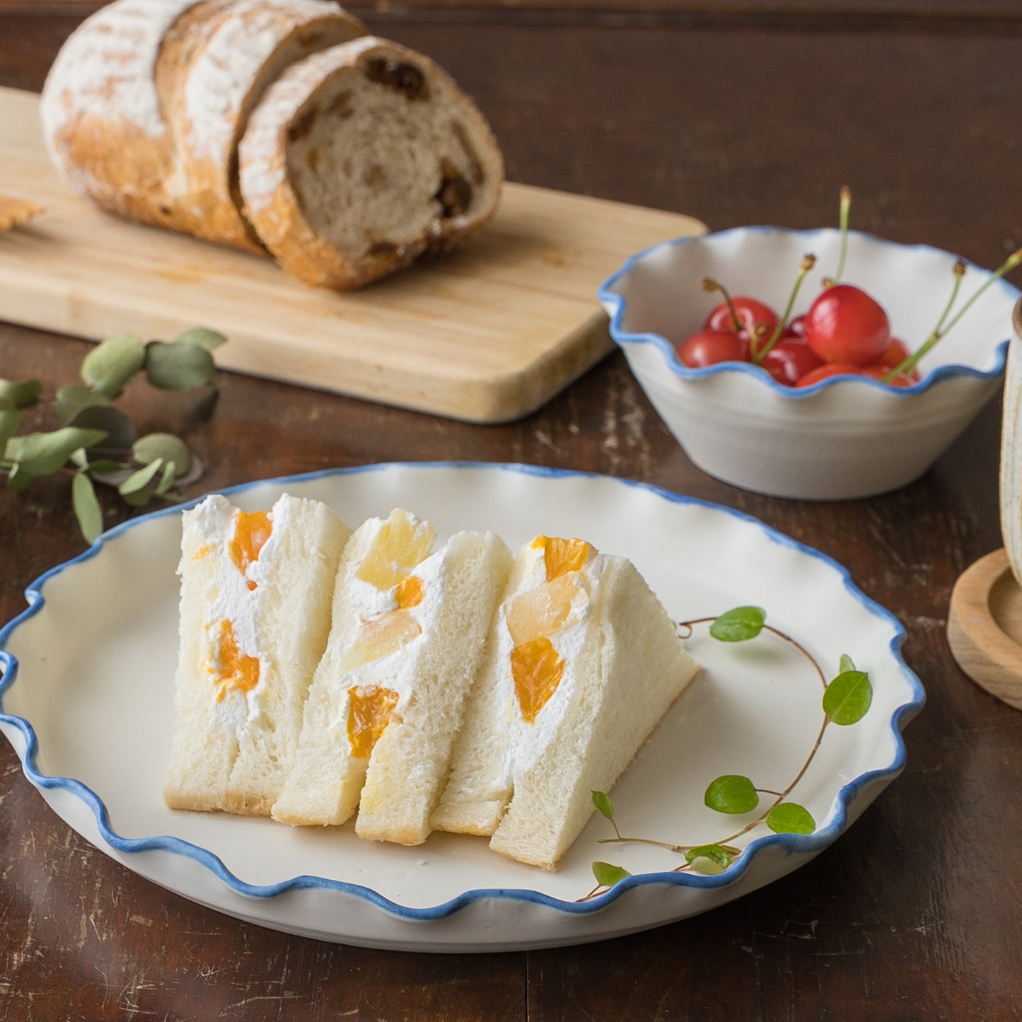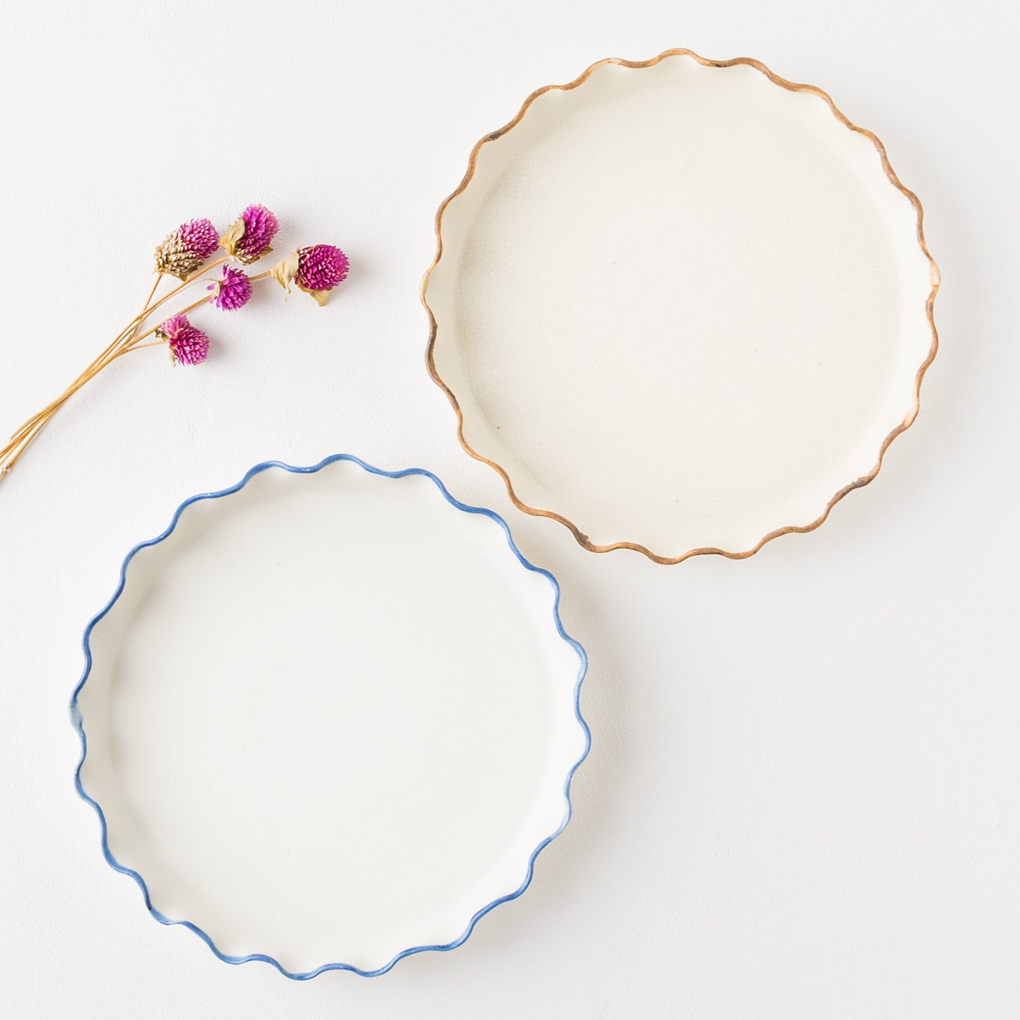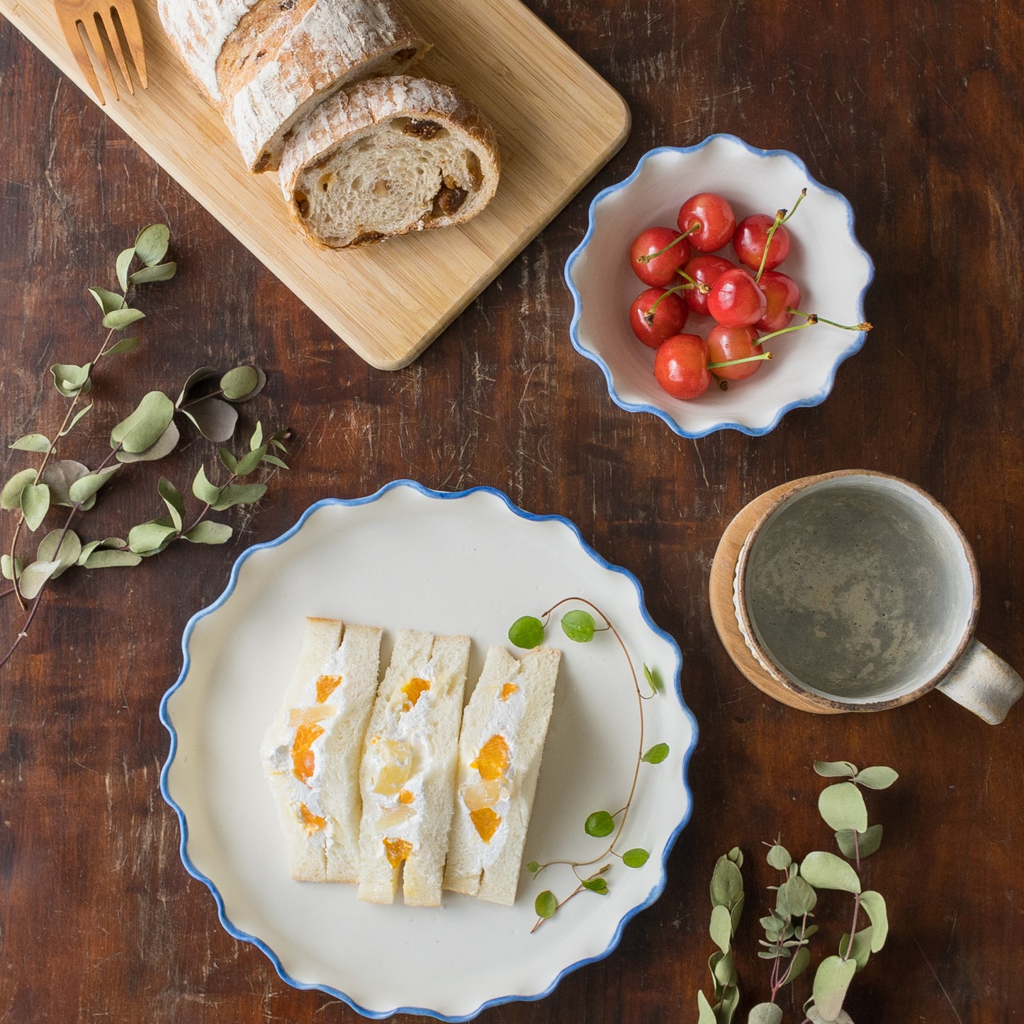 縁が波を打ったデザインのなみなみのプレート。指先の感覚でひとつひとつの「なみ」を等間隔に作り上げているので手づくりならではの個性と味わいを感じます。縁取りに施された爽やかなブルーがうつわ全体引き締めて素敵です。径は約22cmあり深みも約1.5cmあるので汁気のあるお料理を安心して盛り付けられます。