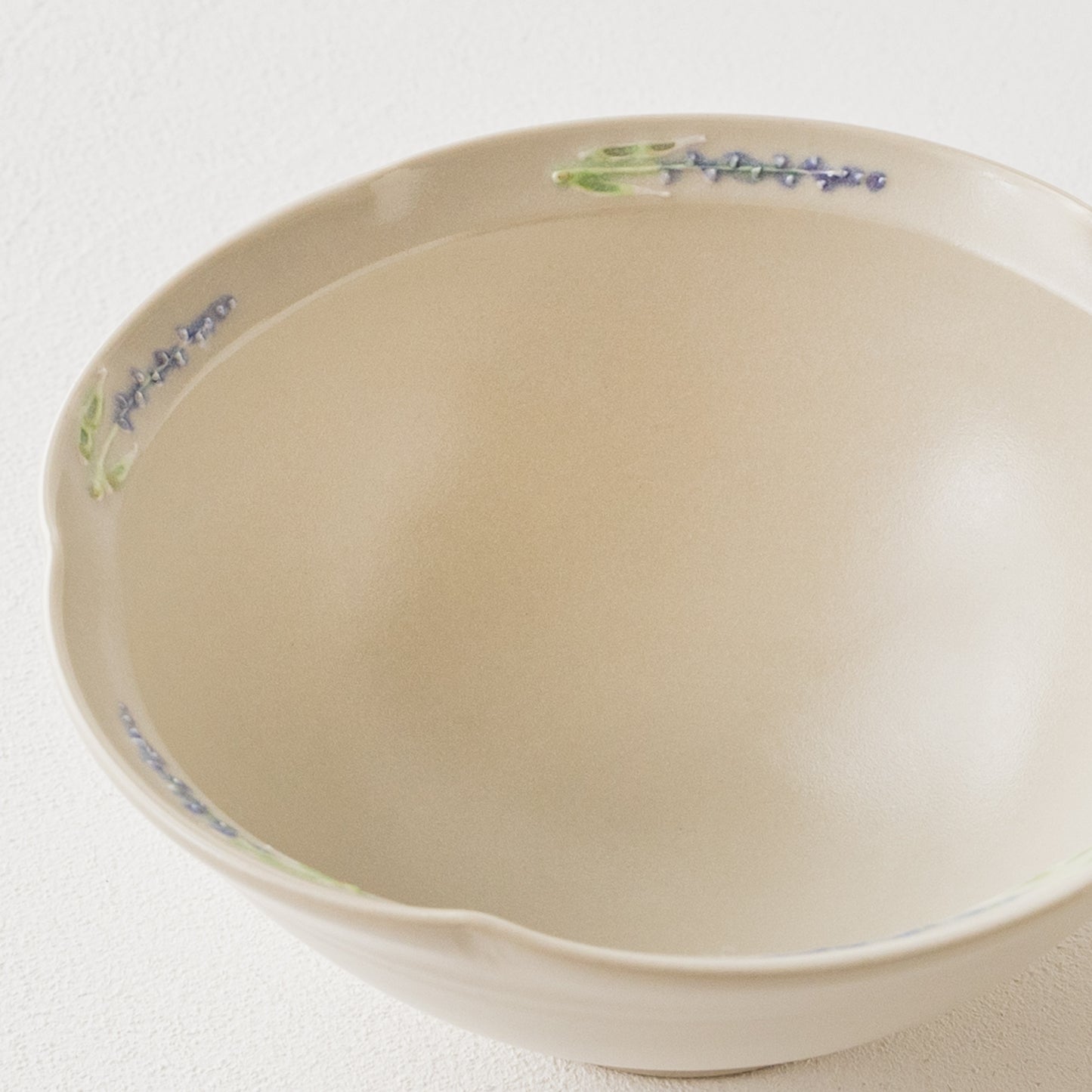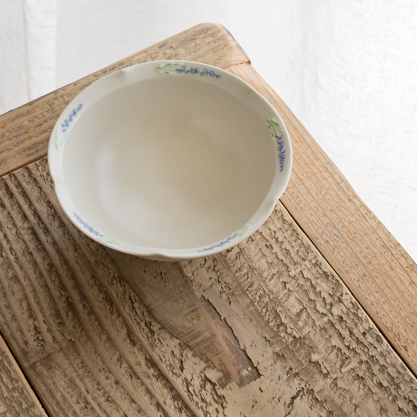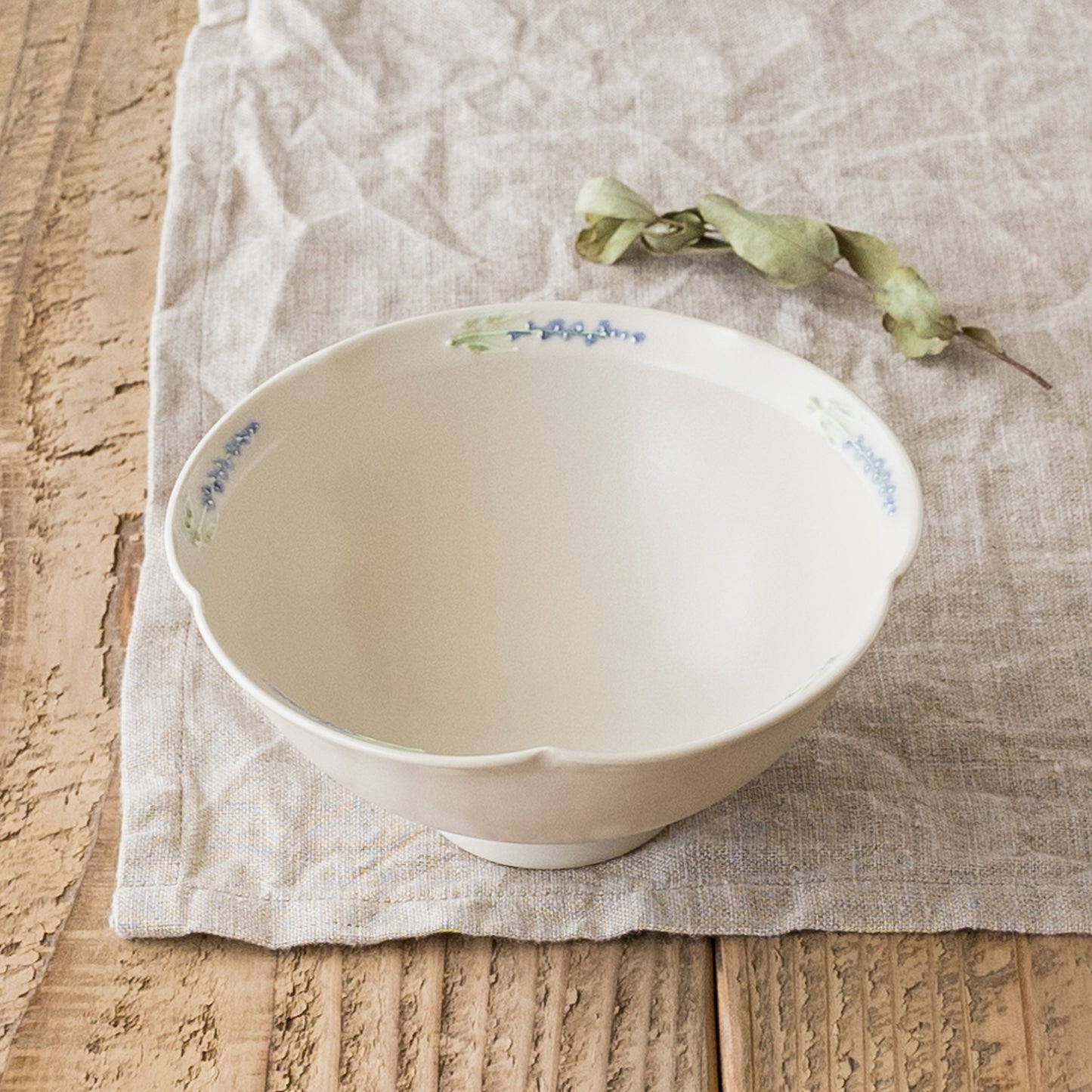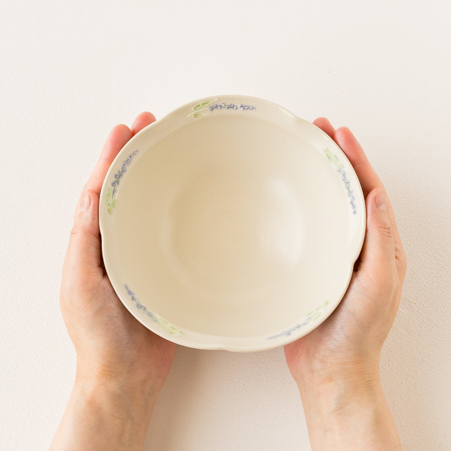 美しい輪花のフォルムに描かれた淡くやわらかな色合いのラベンダーが印象的な中鉢。眺めていると心穏やかにやさしい気持ちに包まれます。