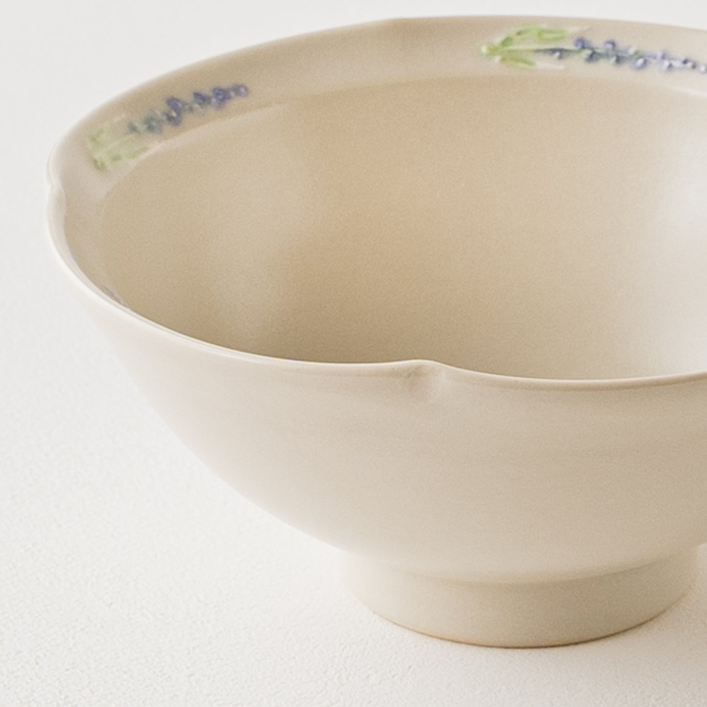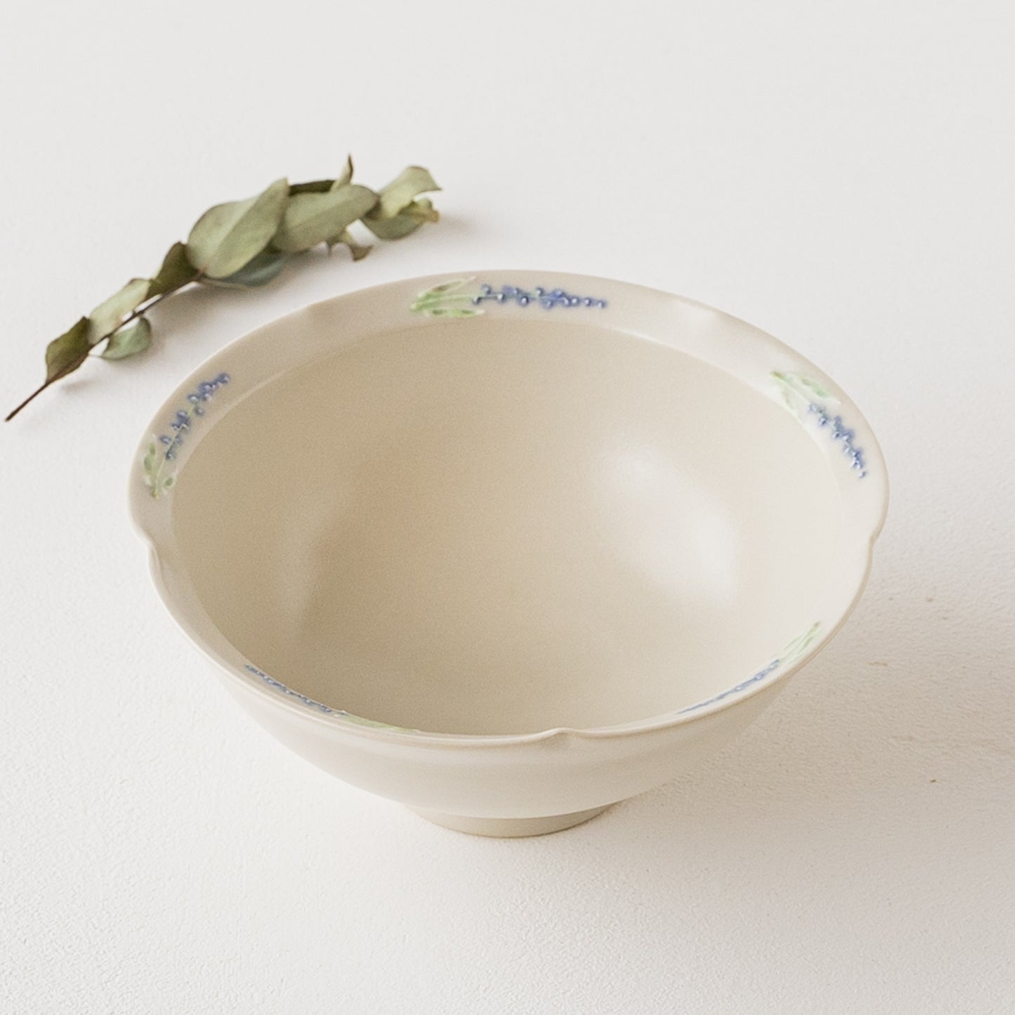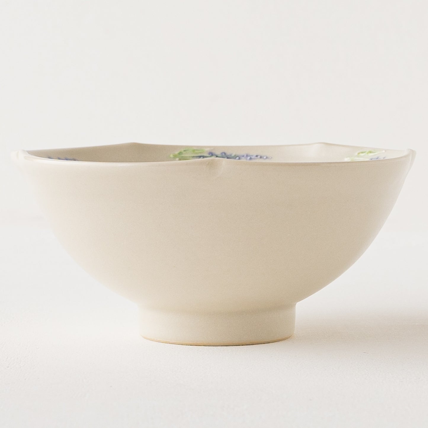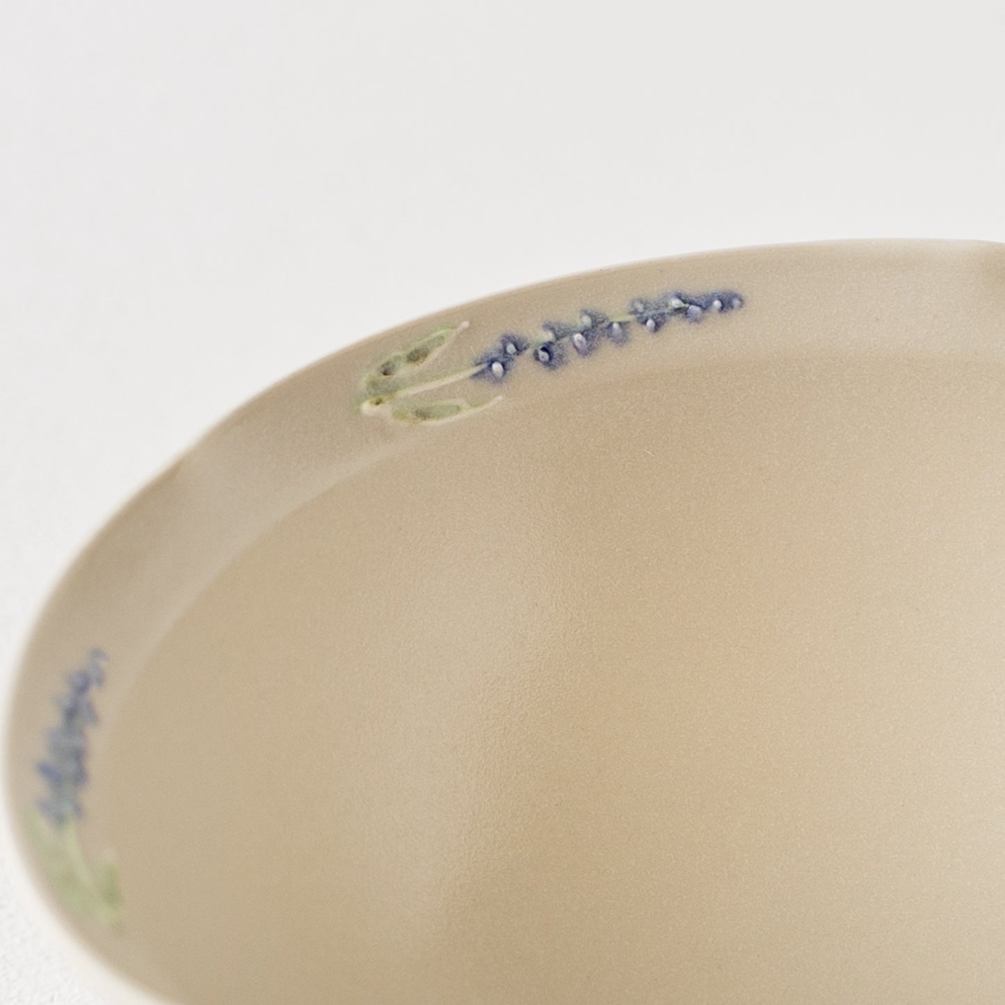 美しい輪花のフォルムに描かれた淡くやわらかな色合いのラベンダーが印象的な中鉢。眺めていると心穏やかにやさしい気持ちに包まれます。