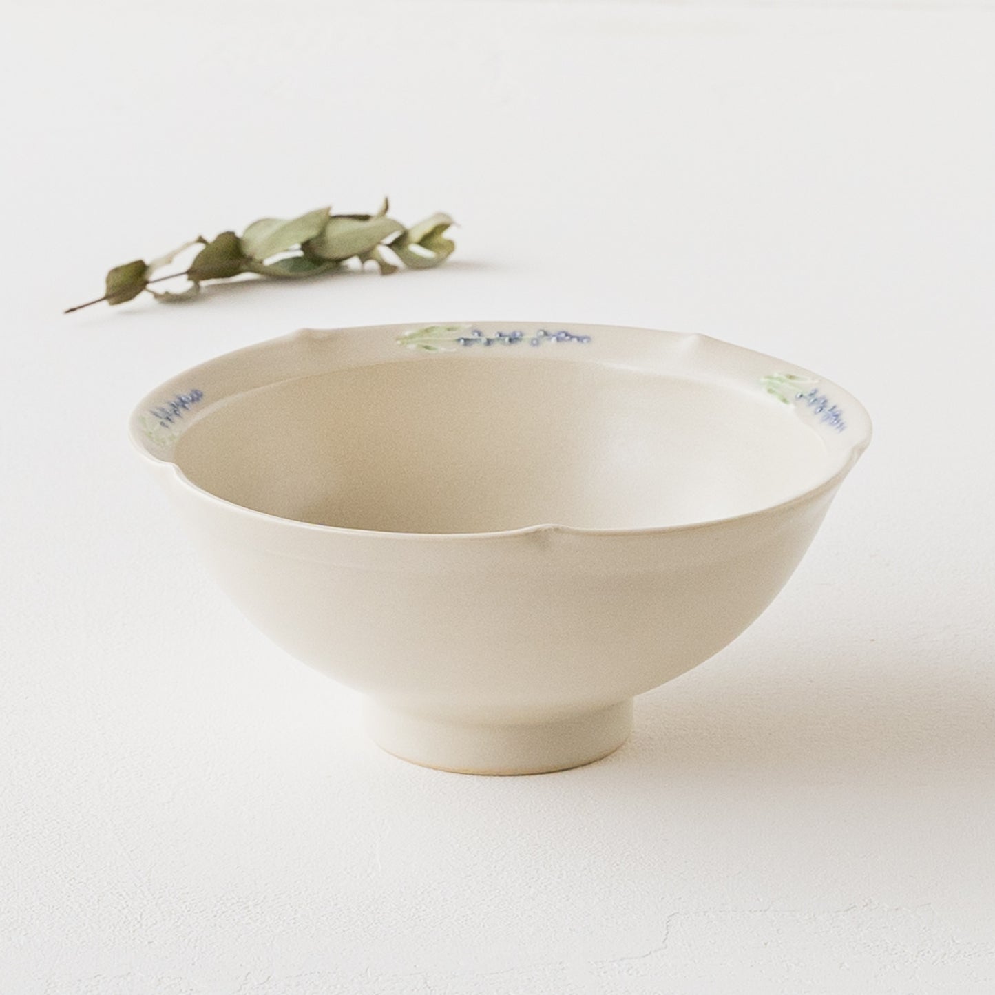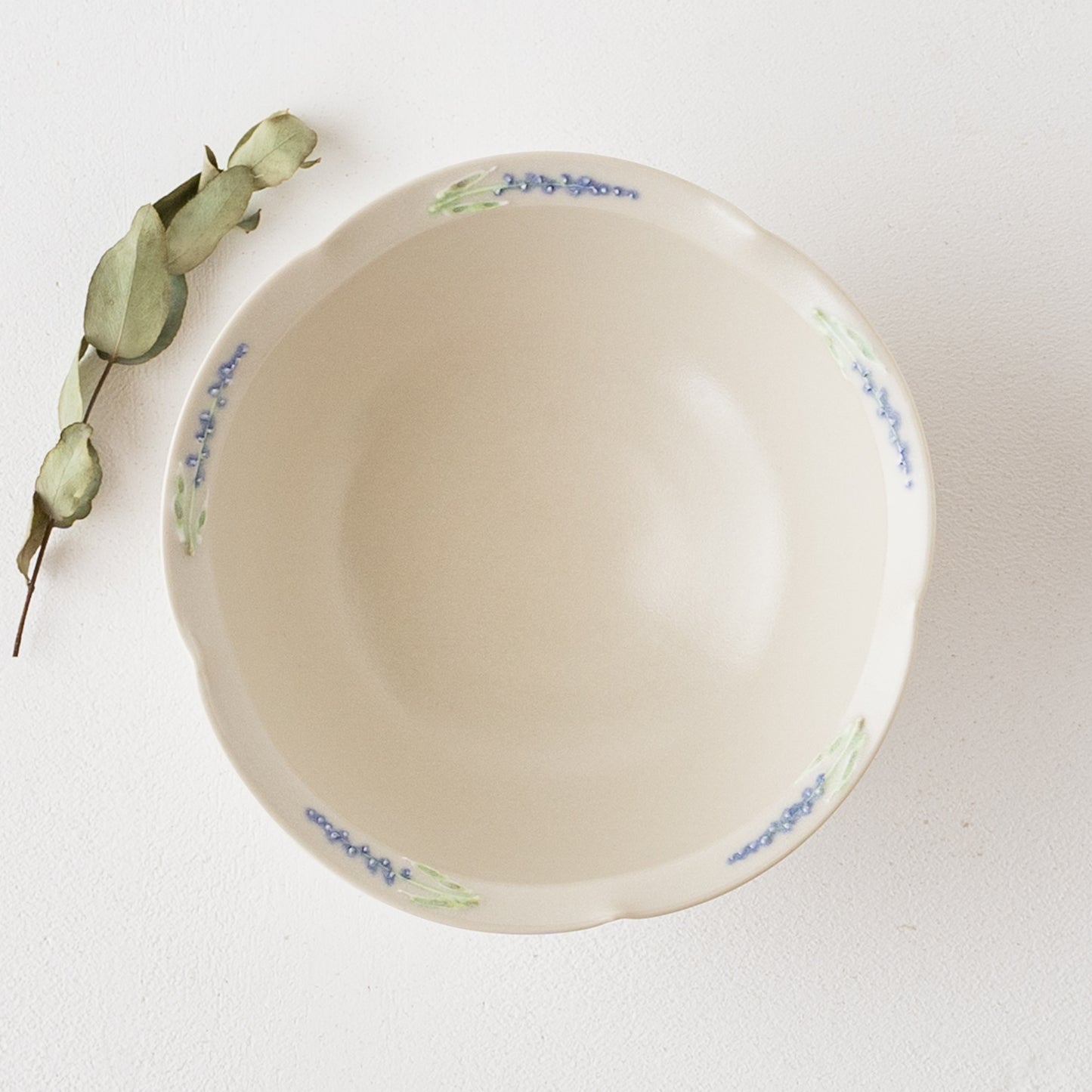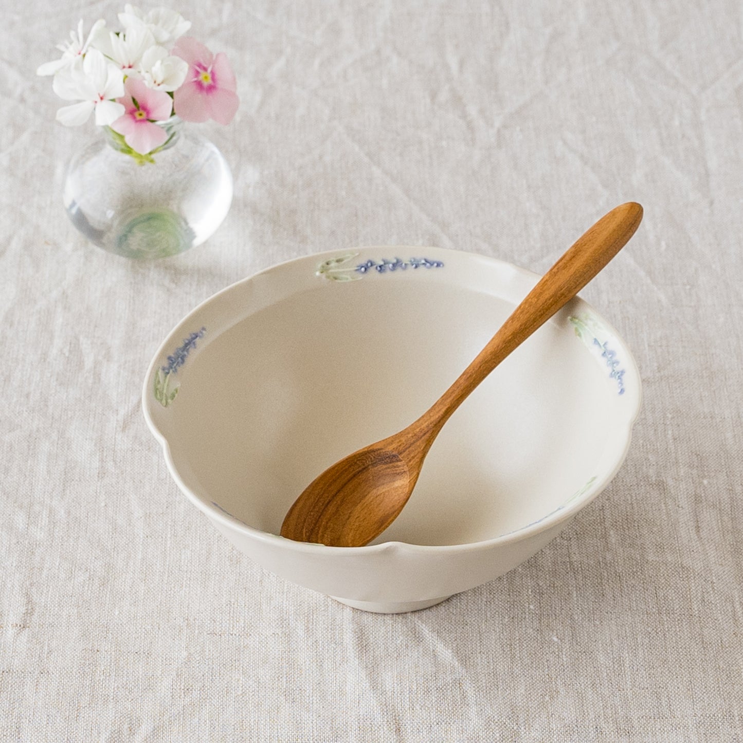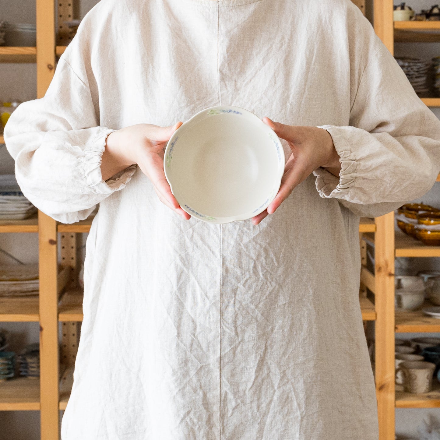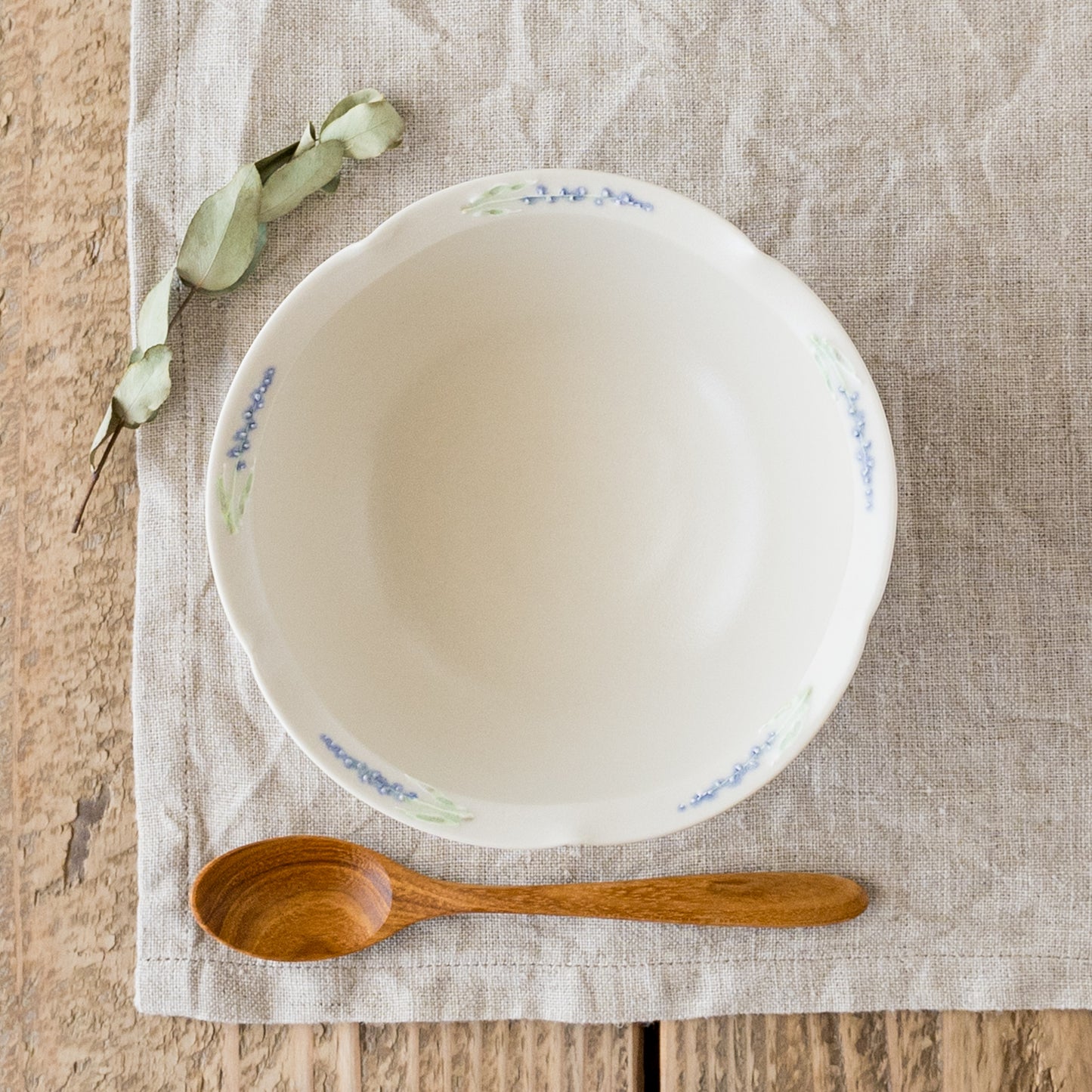 美しい輪花のフォルムに描かれた淡くやわらかな色合いのラベンダーが印象的な中鉢。眺めていると心穏やかにやさしい気持ちに包まれます。