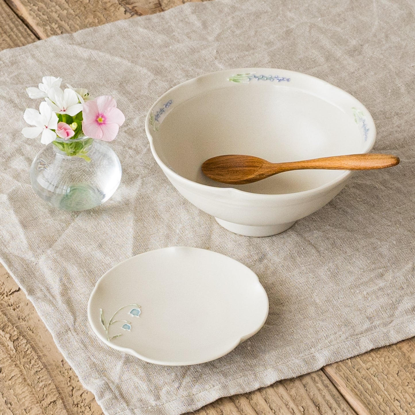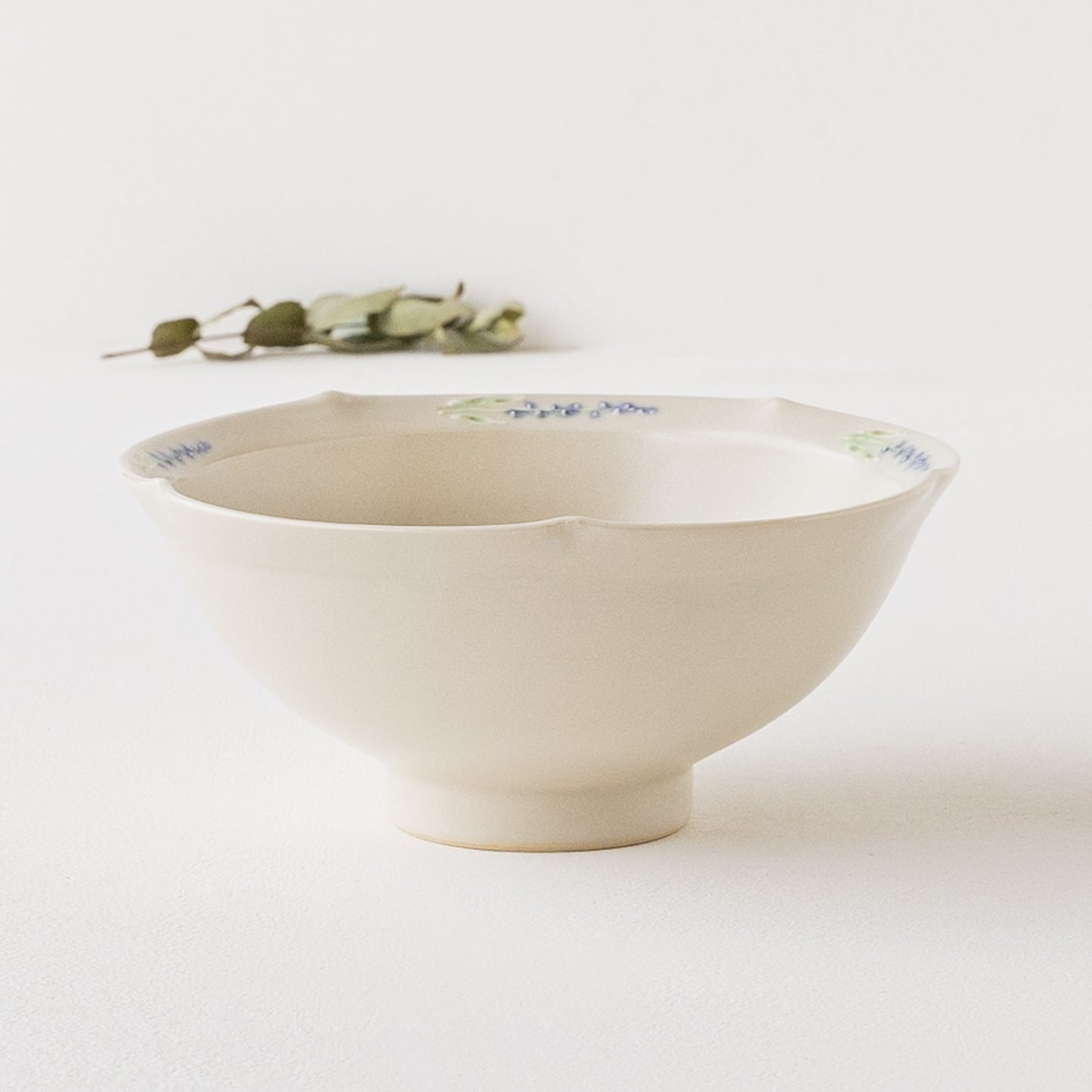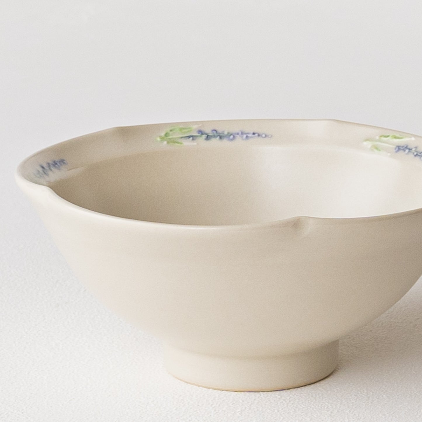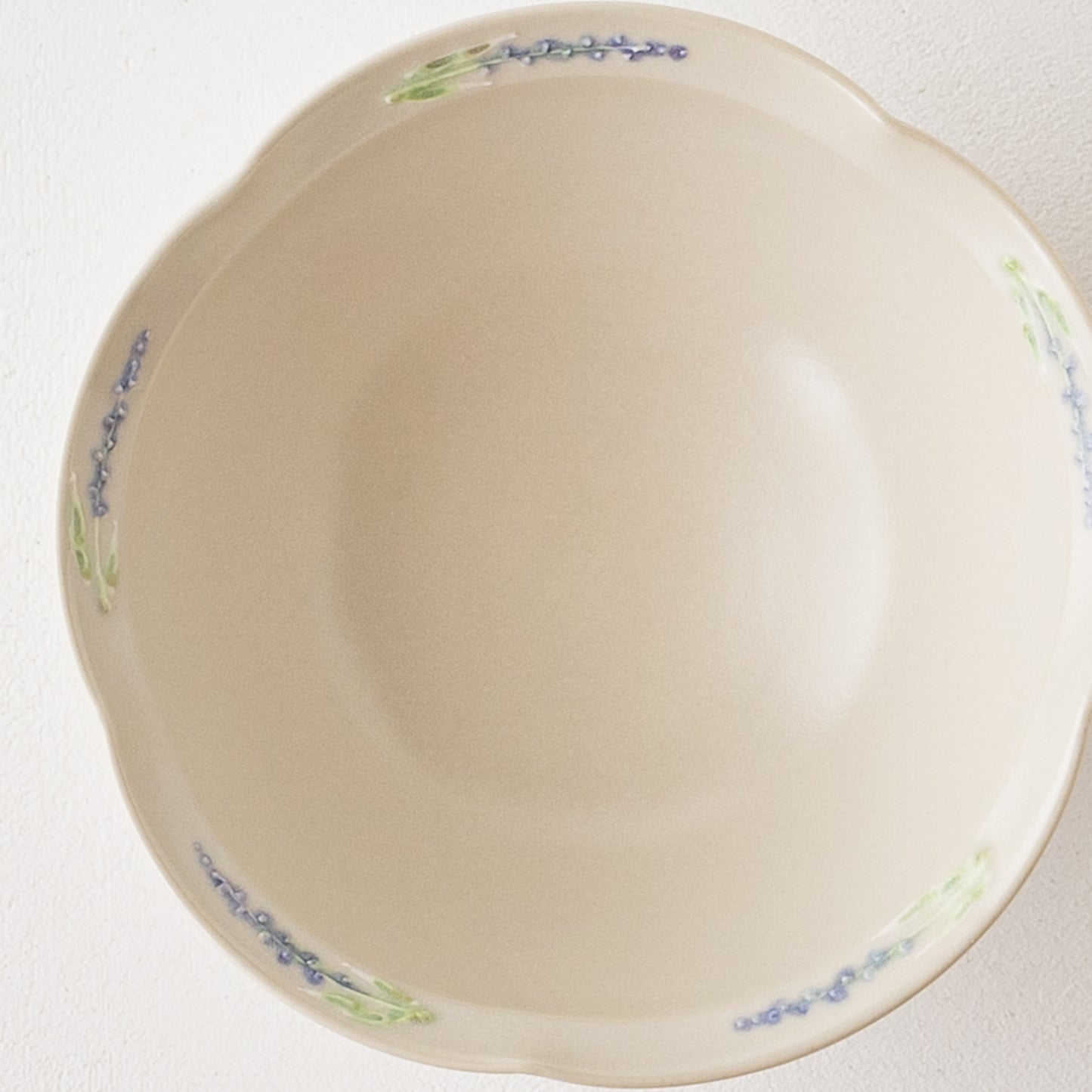 美しい輪花のフォルムに描かれた淡くやわらかな色合いのラベンダーが印象的な中鉢。眺めていると心穏やかにやさしい気持ちに包まれます。