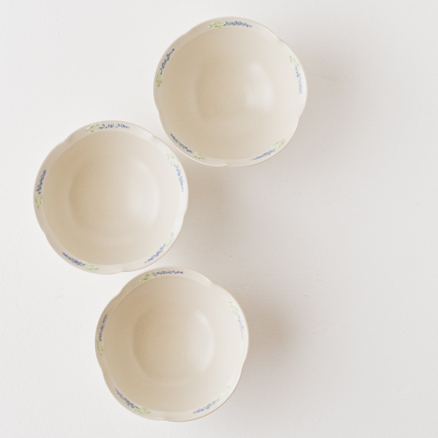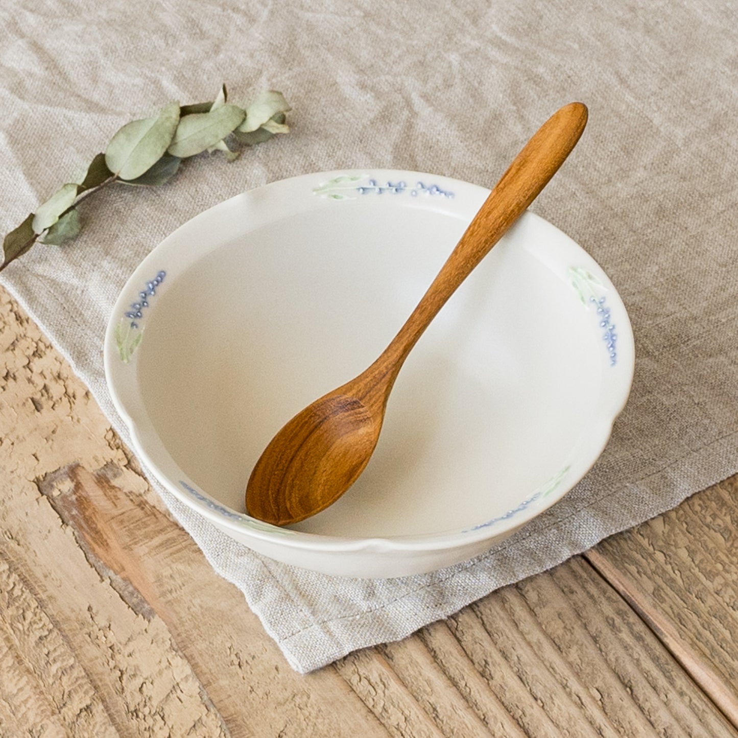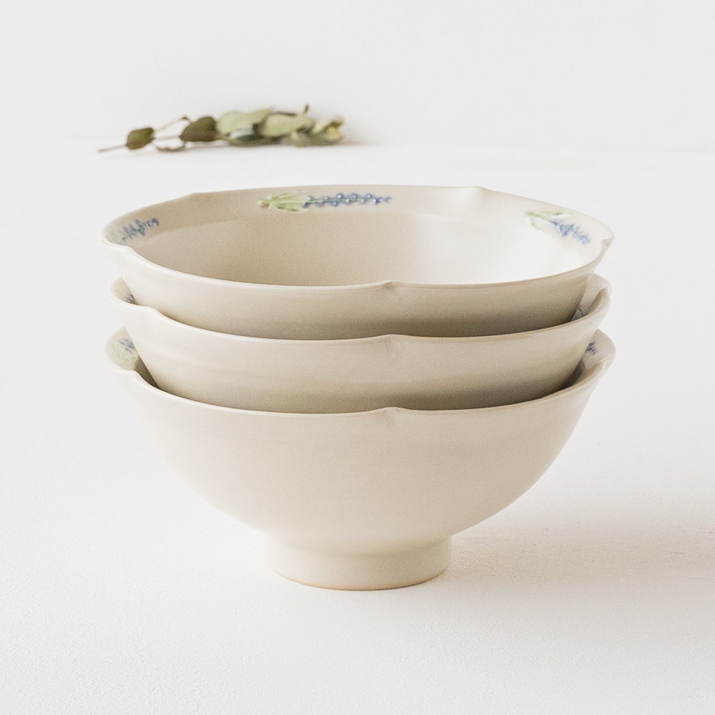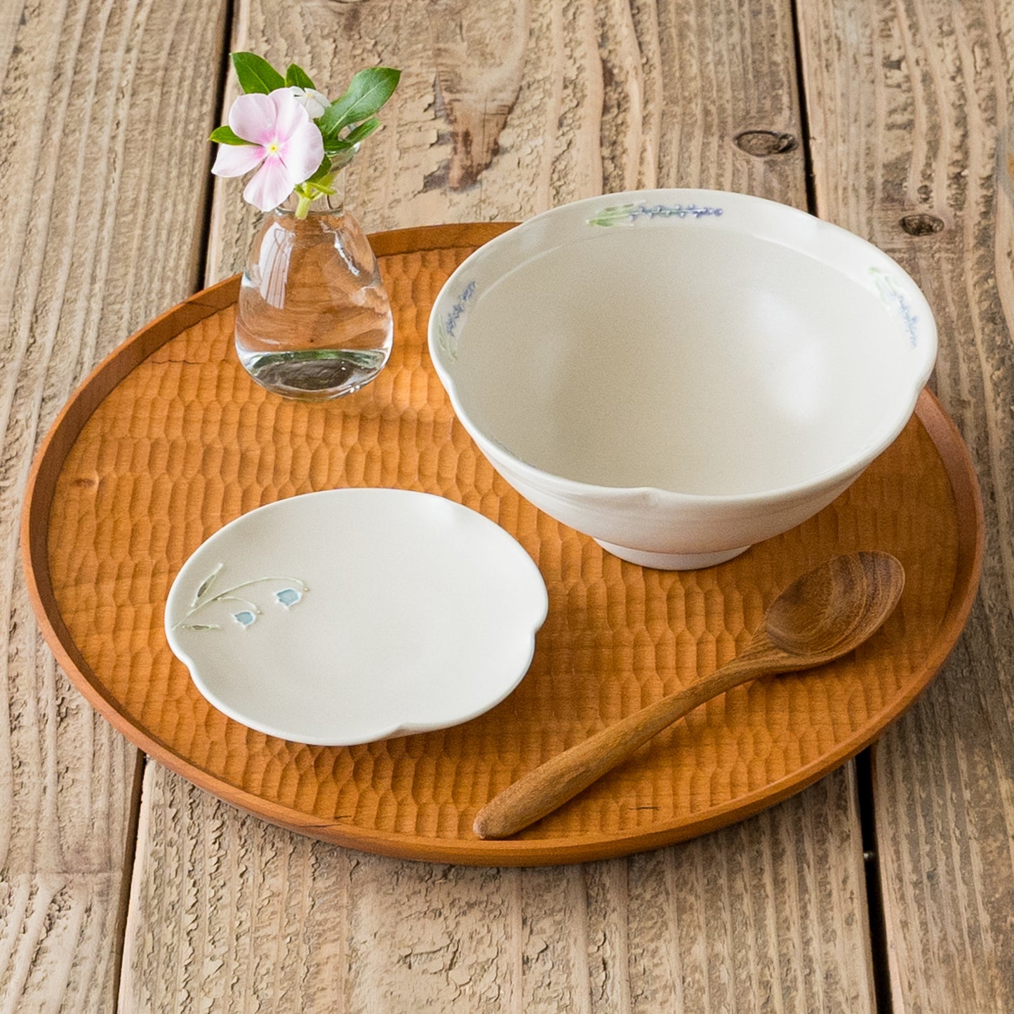美しい輪花のフォルムに描かれた淡くやわらかな色合いのラベンダーが印象的な中鉢。眺めていると心穏やかにやさしい気持ちに包まれます。