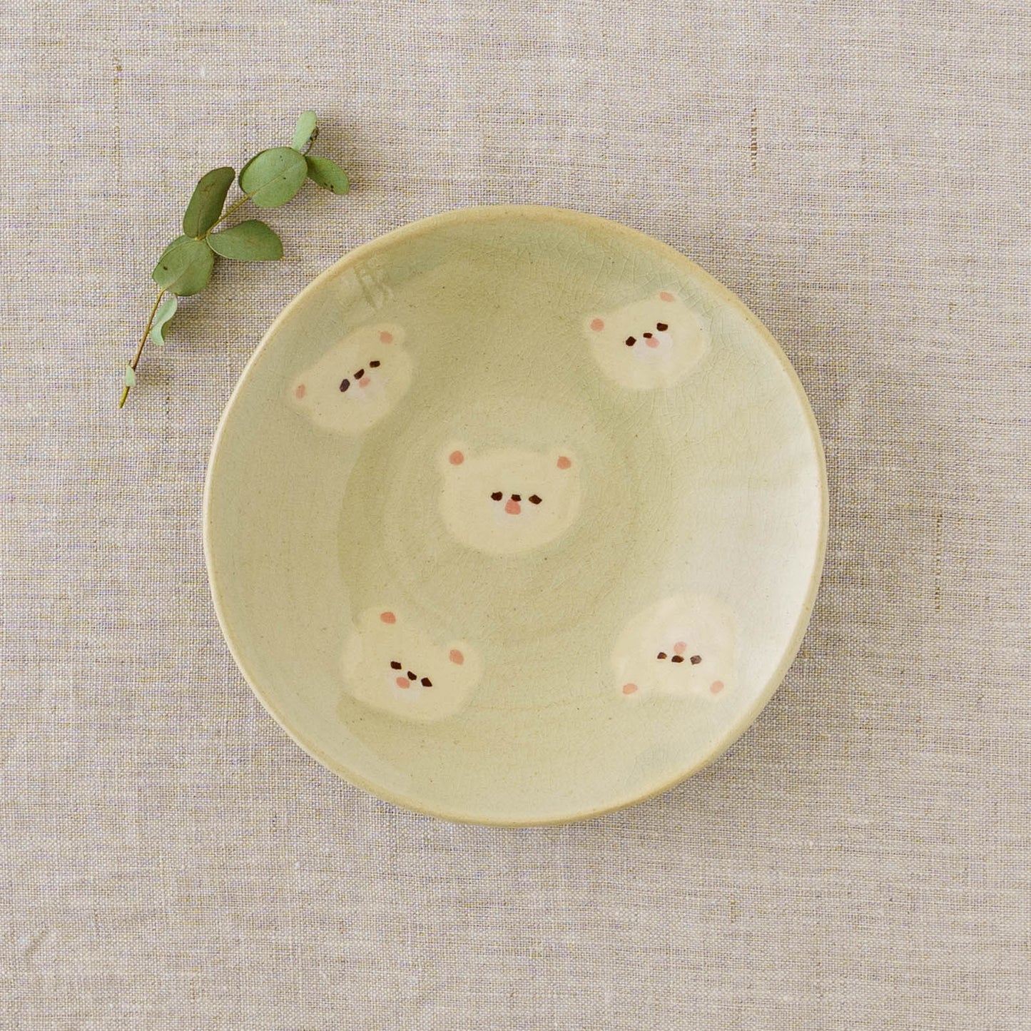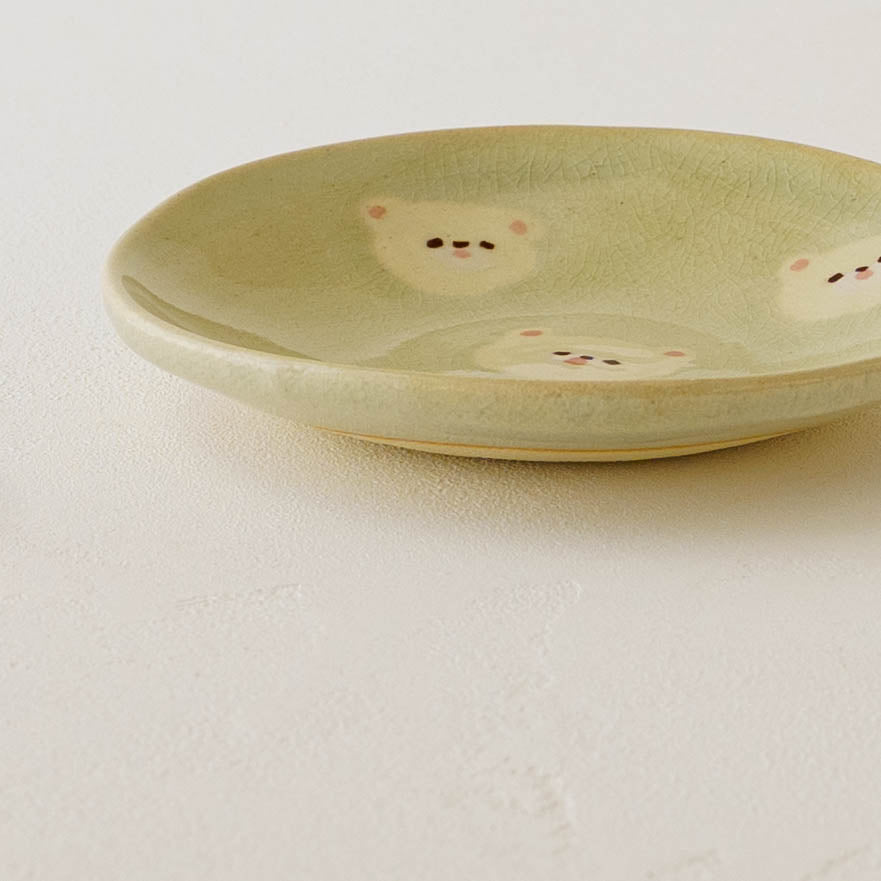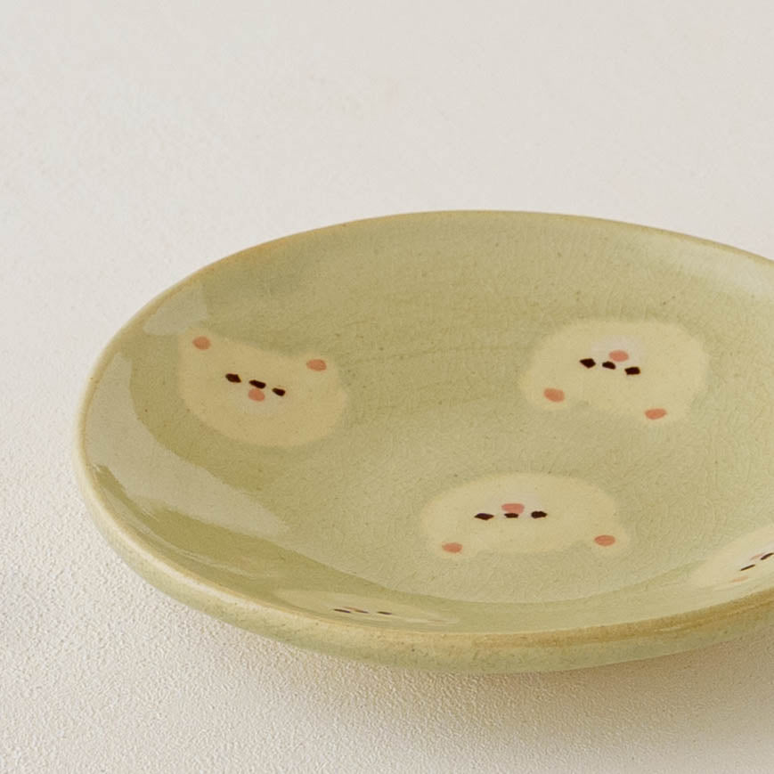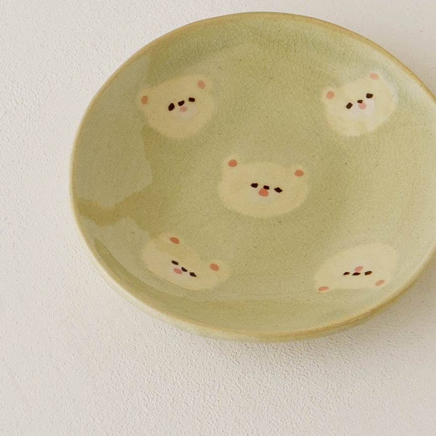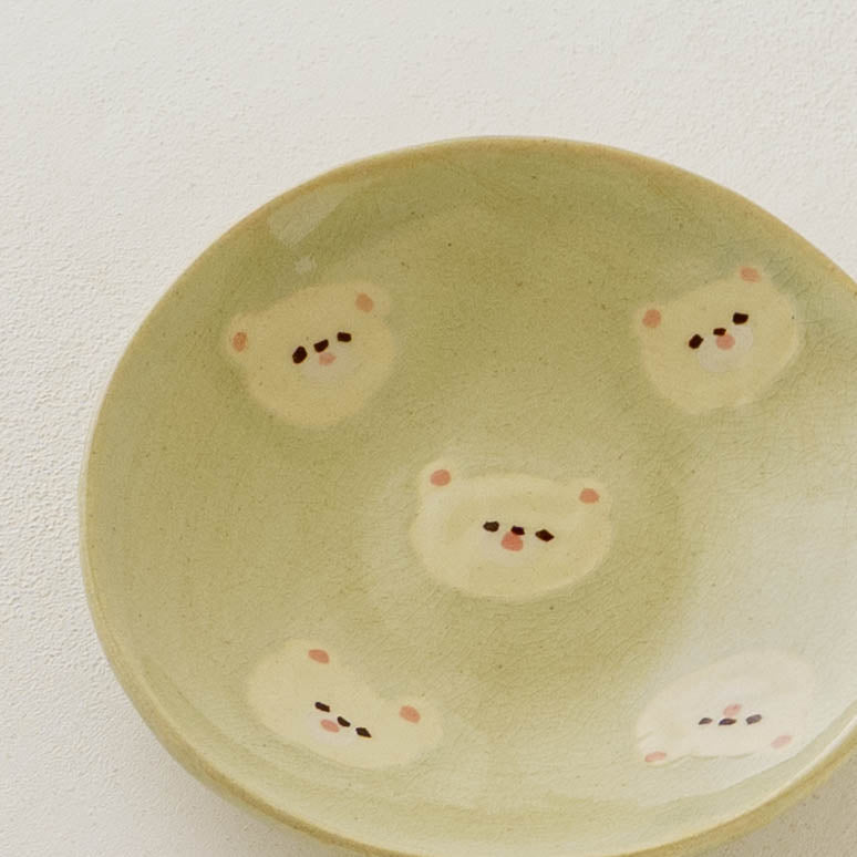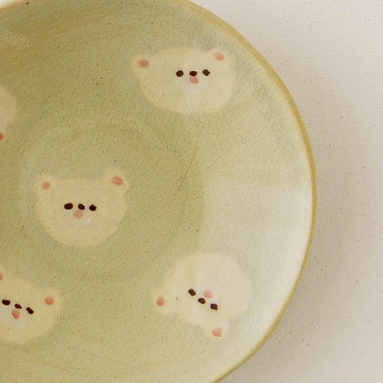 クマの顔が散りばめられたなんとも愛らしい取皿。おかずの取り皿はもちろん、お団子や大福、焼き菓子やカップケーキなど載せるとかわいさが増して楽しいおやつタイムにしてくれます。