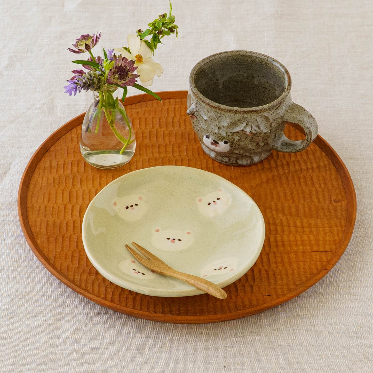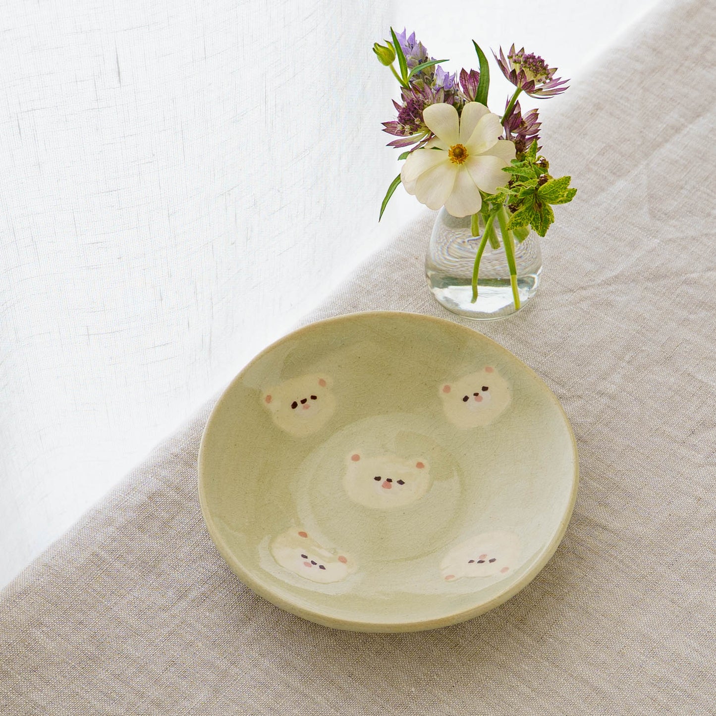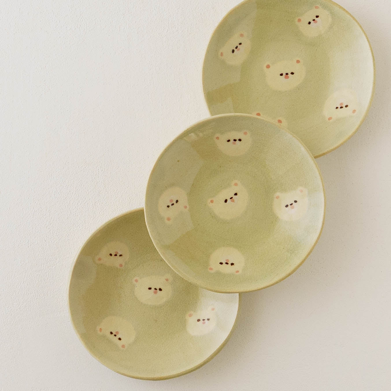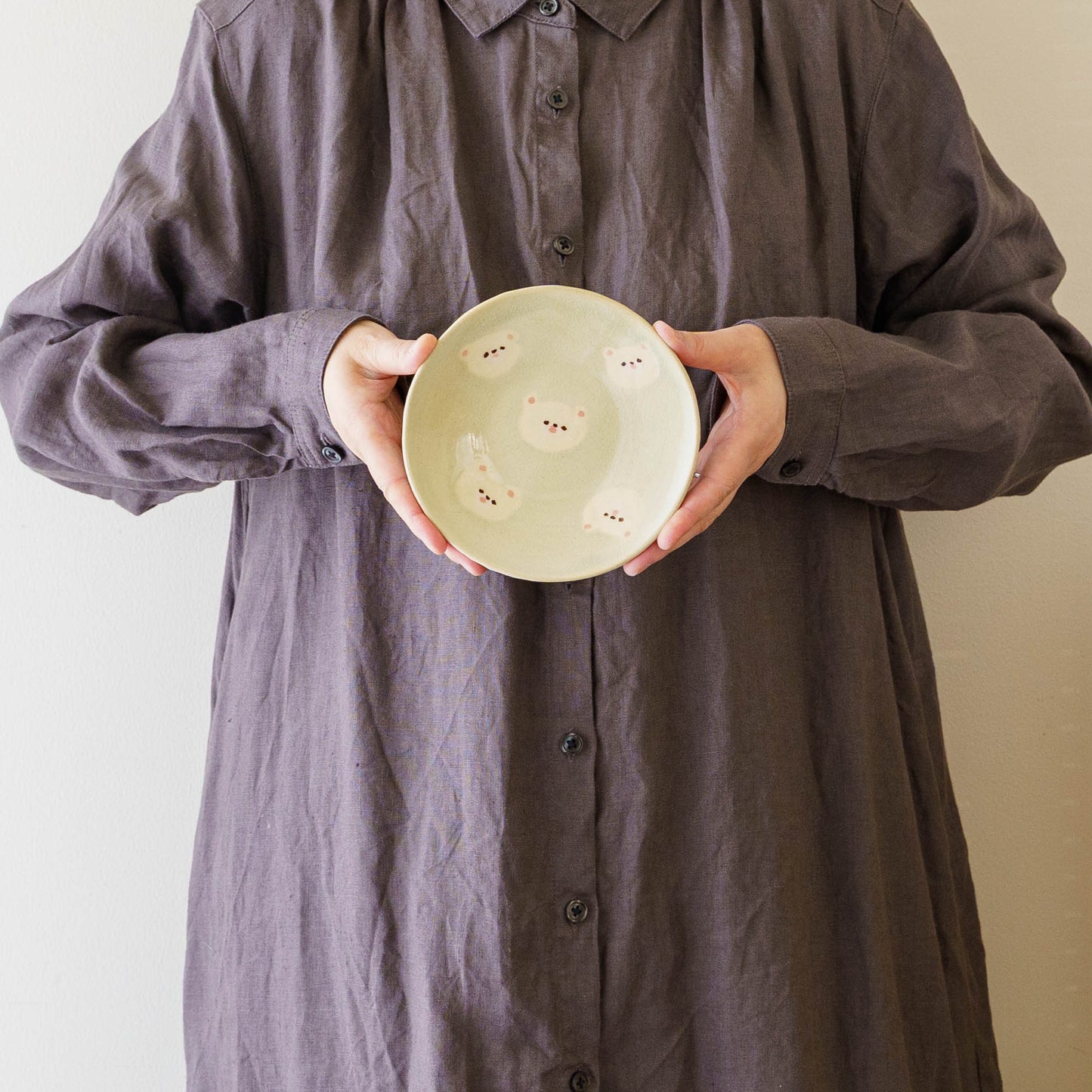 クマの顔が散りばめられたなんとも愛らしい取皿。おかずの取り皿はもちろん、お団子や大福、焼き菓子やカップケーキなど載せるとかわいさが増して楽しいおやつタイムにしてくれます。