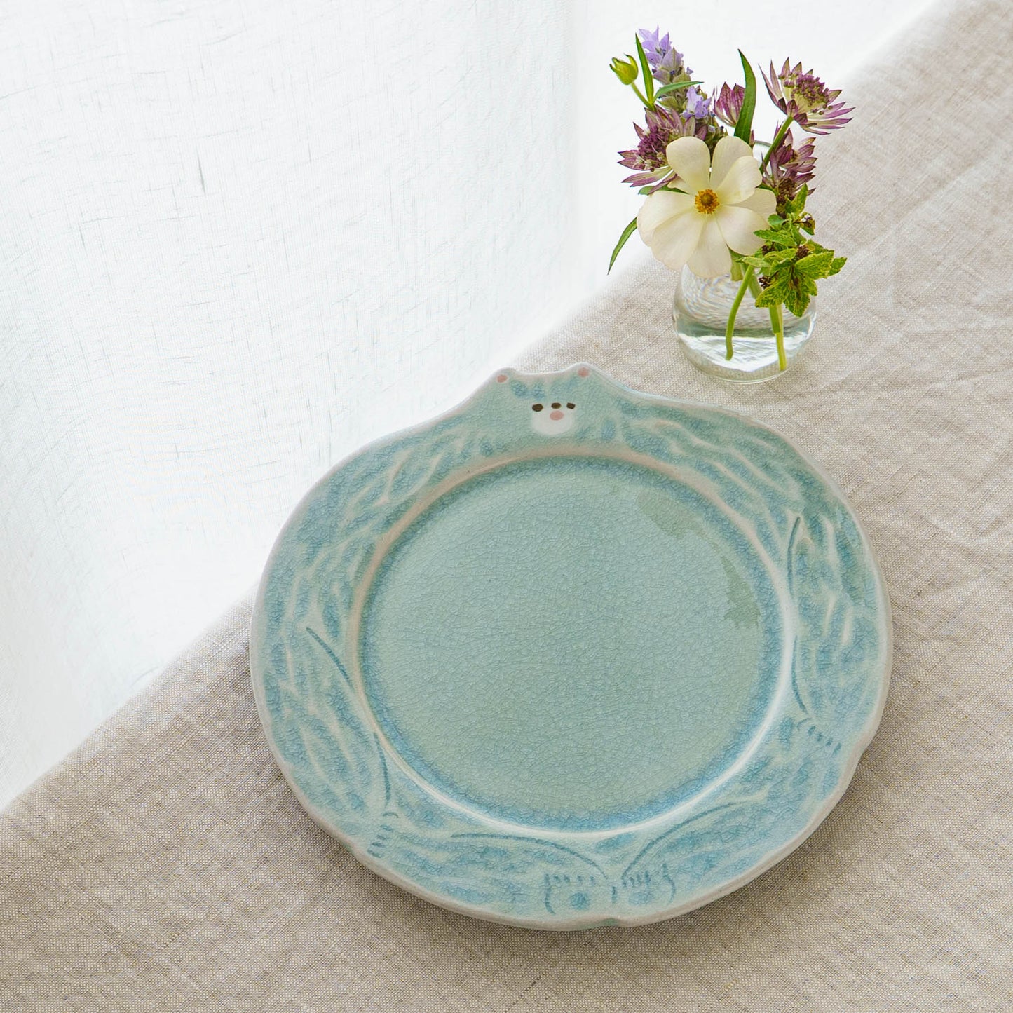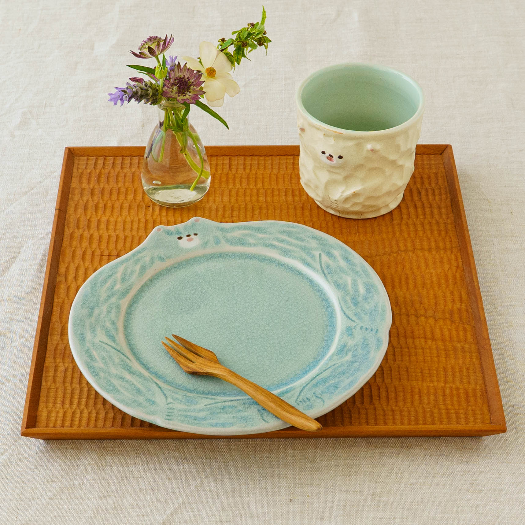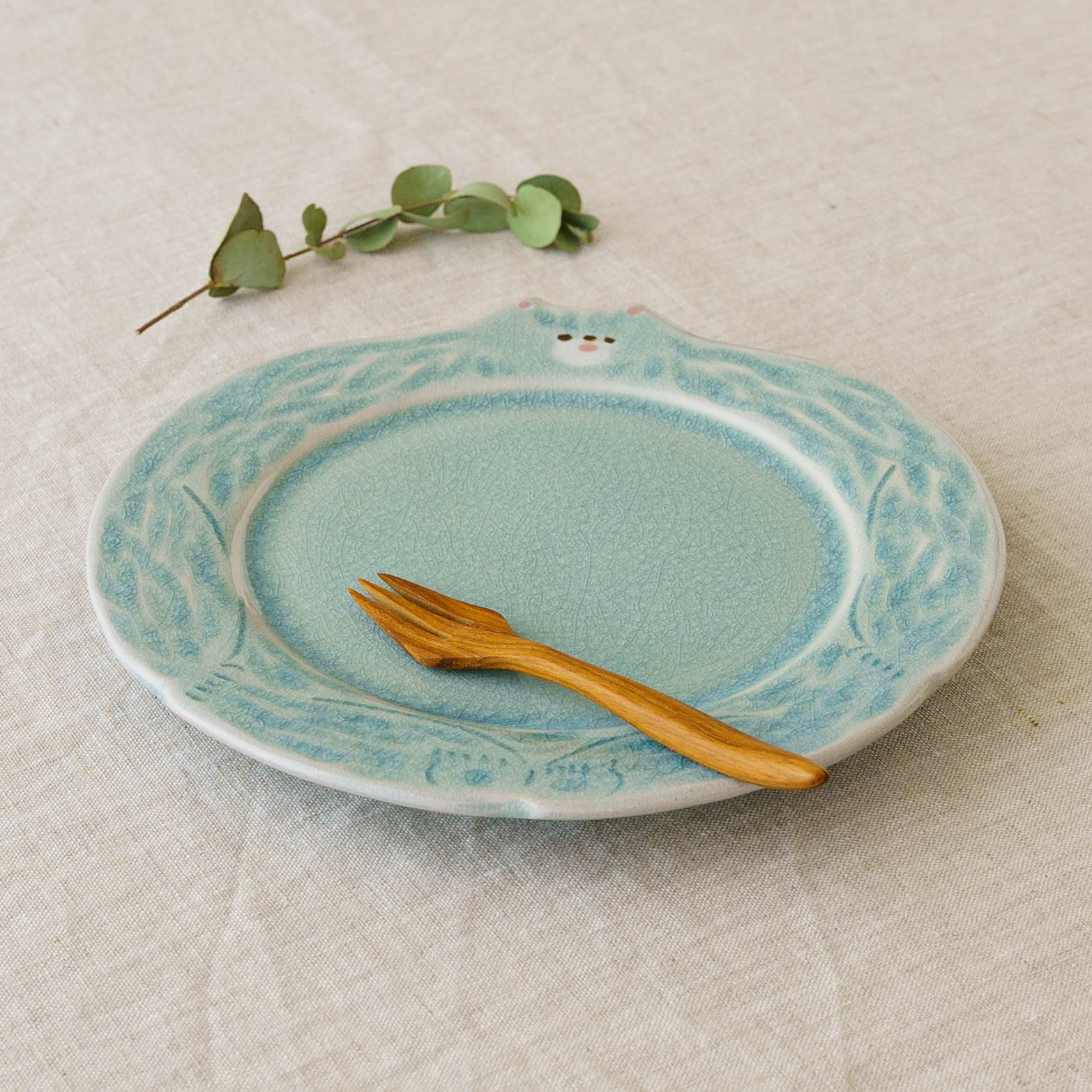 ほけっとしたクマの表情がキュートなリム皿。トースト、ハムエッグ、サラダを載せてモーニングプレートにしたり、シフォンケーキやミルフィーユなどおやつタイムを楽しんだりなど、どんな時も気分が上がって特別なひとときにしてくれます。