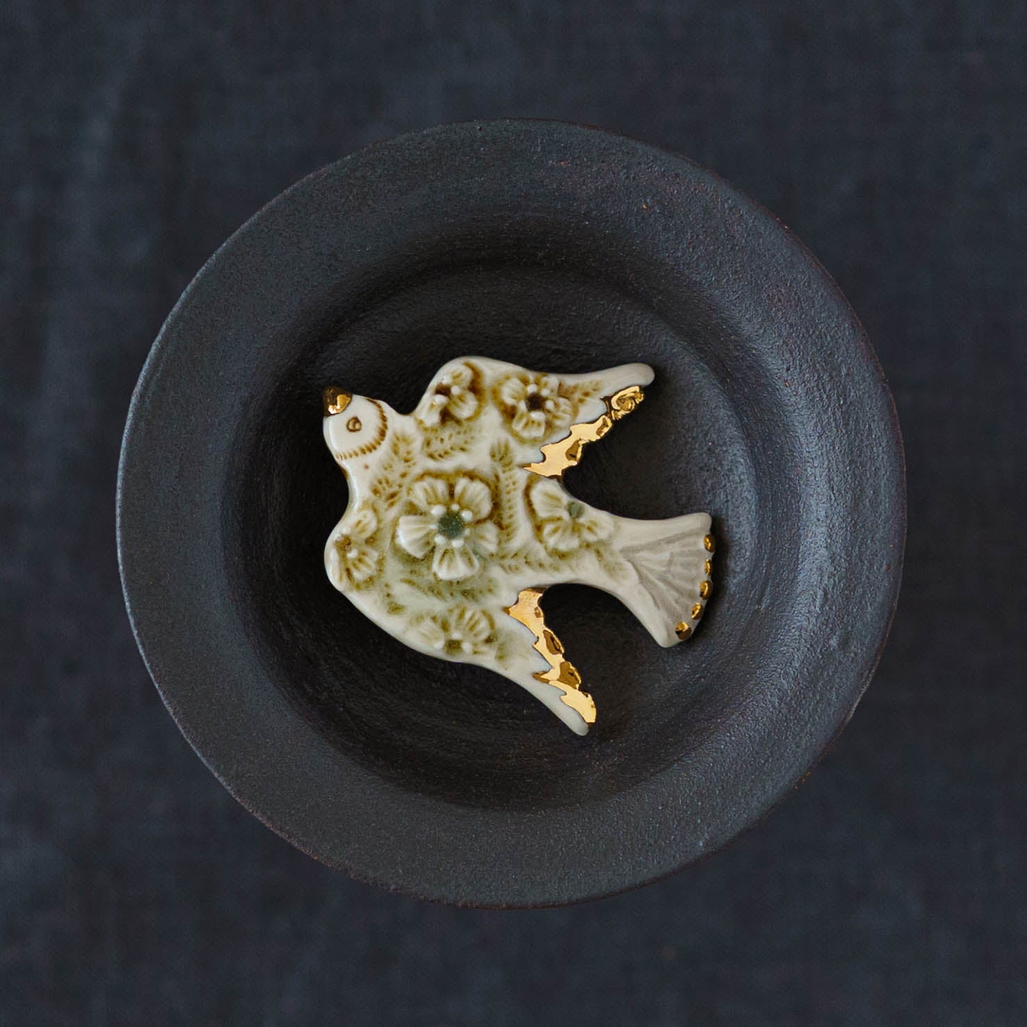 クラシカルな雰囲気と上品な可愛らしさを併せ持った素敵な陶製のブローチ。胸元をかわいく華やかに演出してくれます。ブローチ金具は真鍮に金メッキとなります。