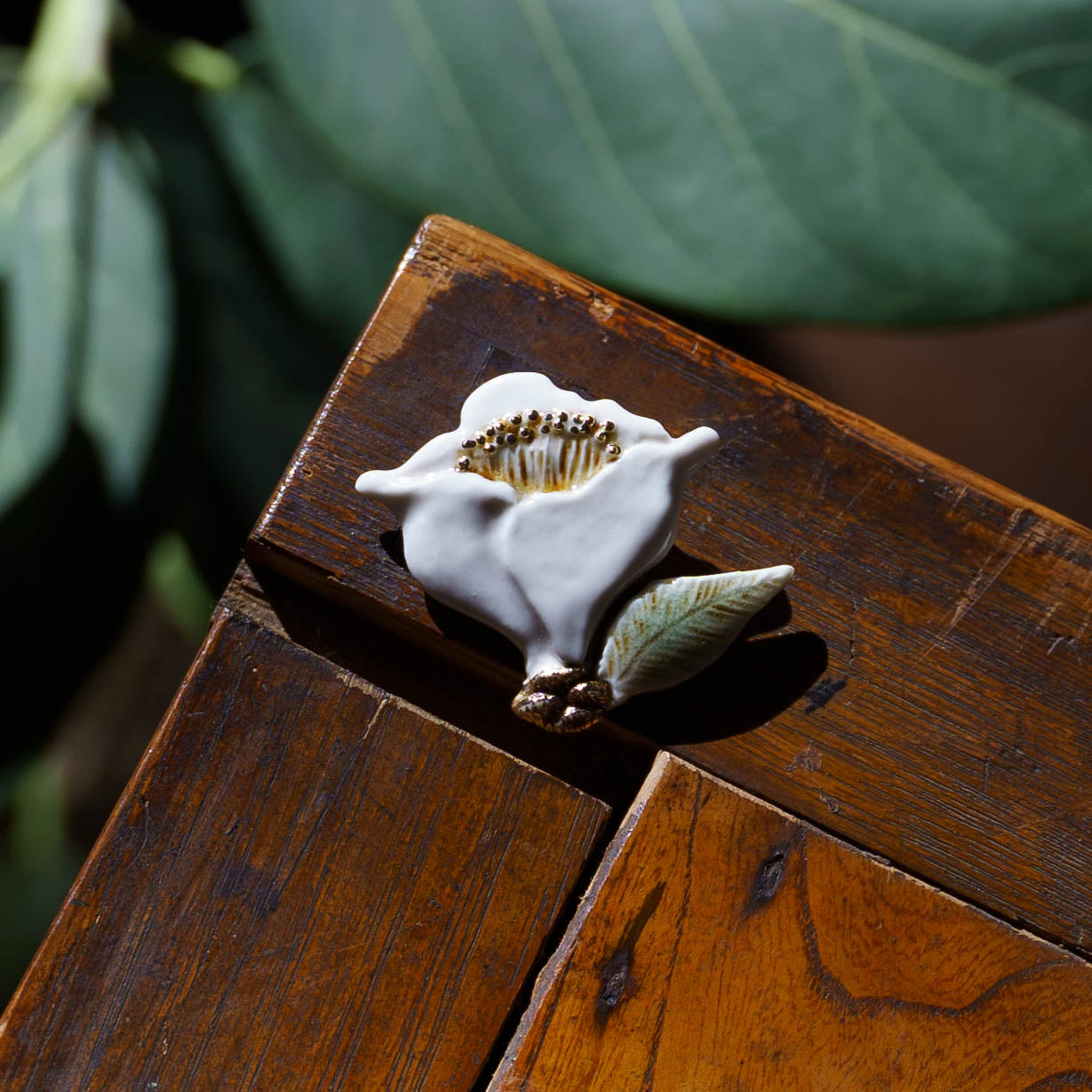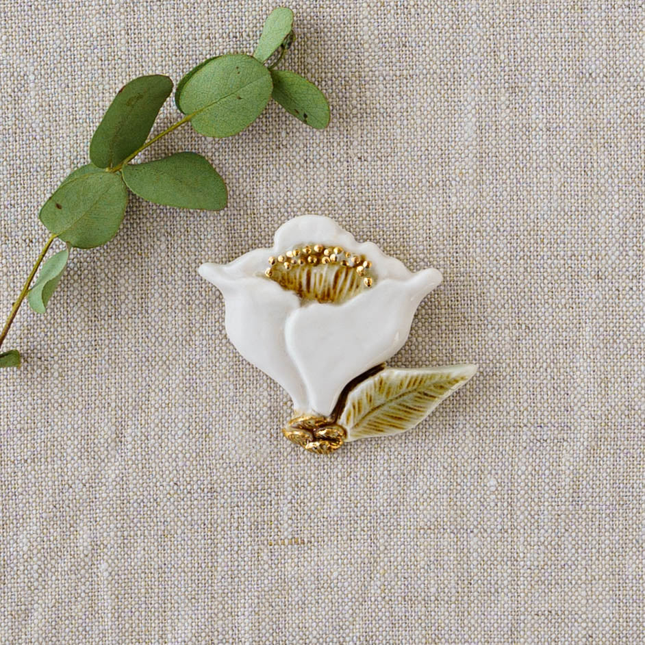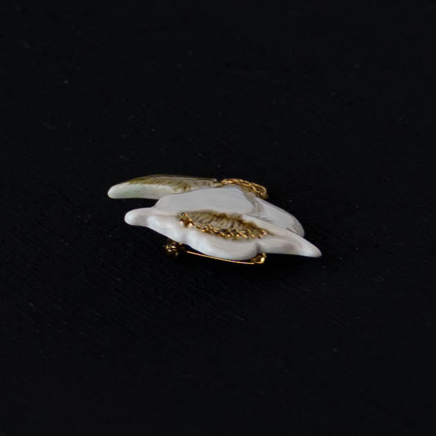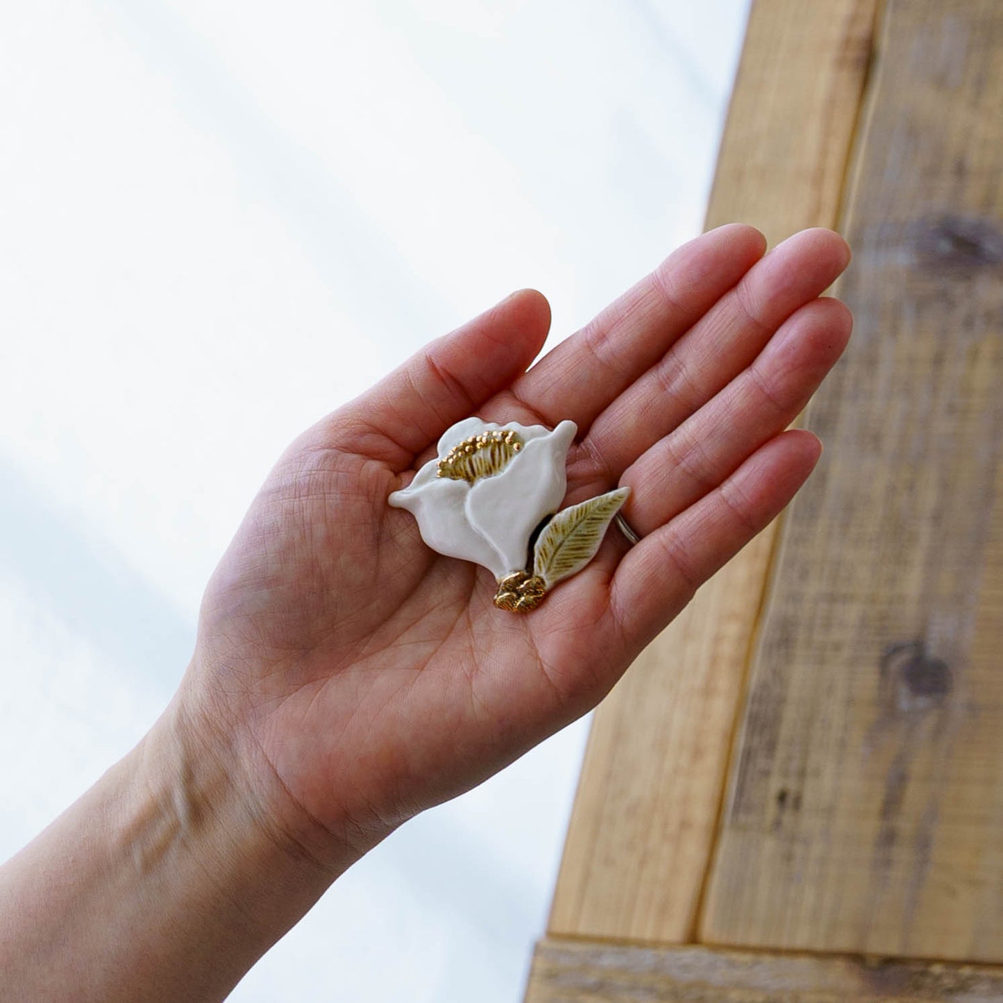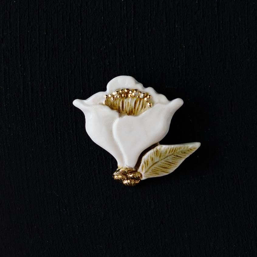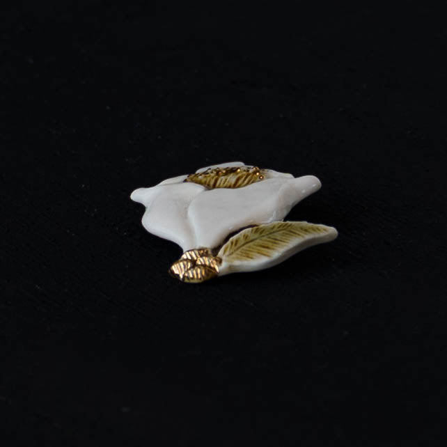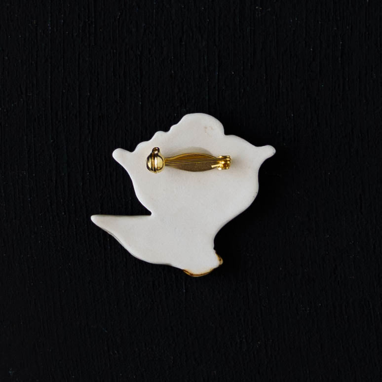 クラシカルな雰囲気と上品な可愛らしさを併せ持った素敵な陶製のブローチ。胸元をかわいく華やかに演出してくれます。ブローチ金具は真鍮に金メッキとなります。