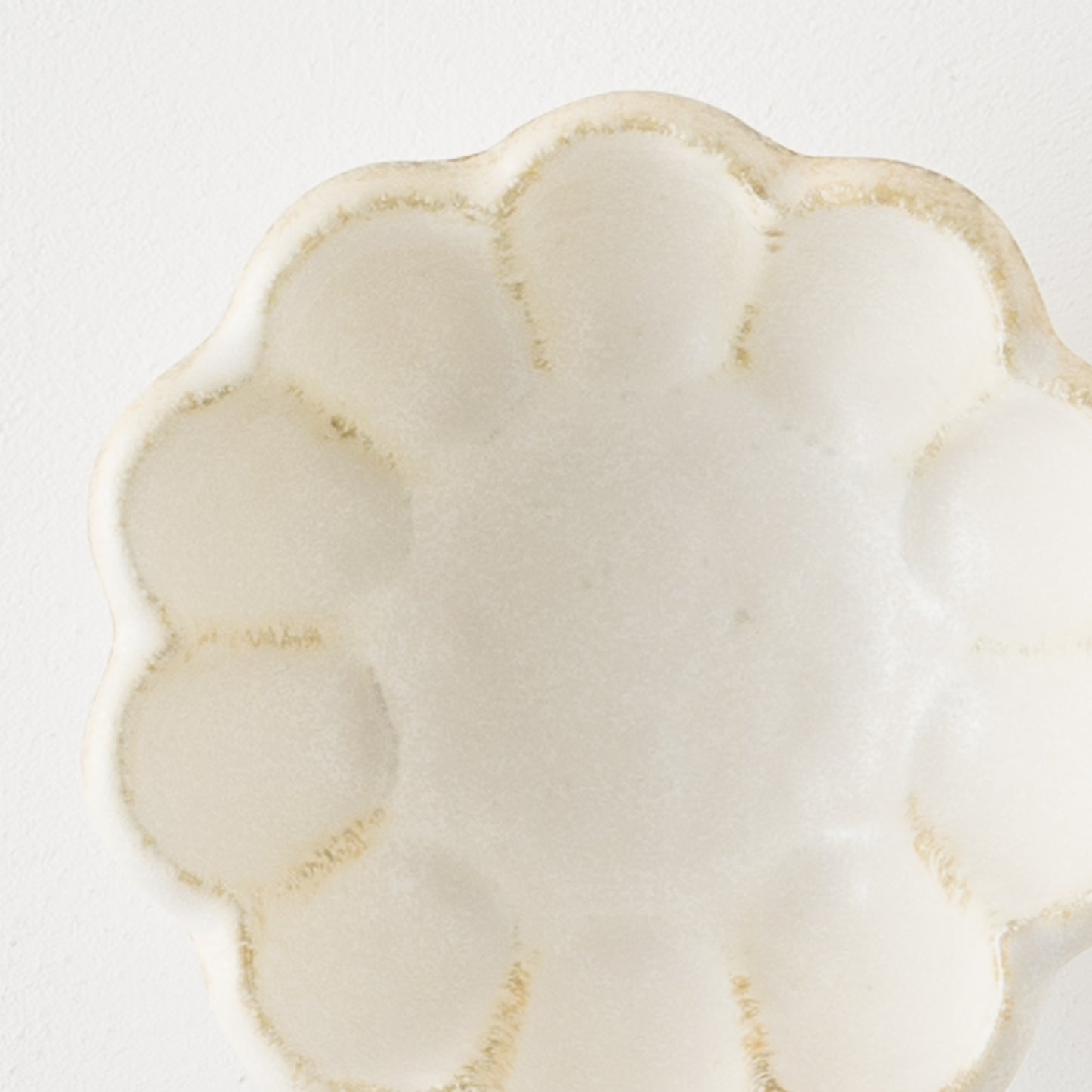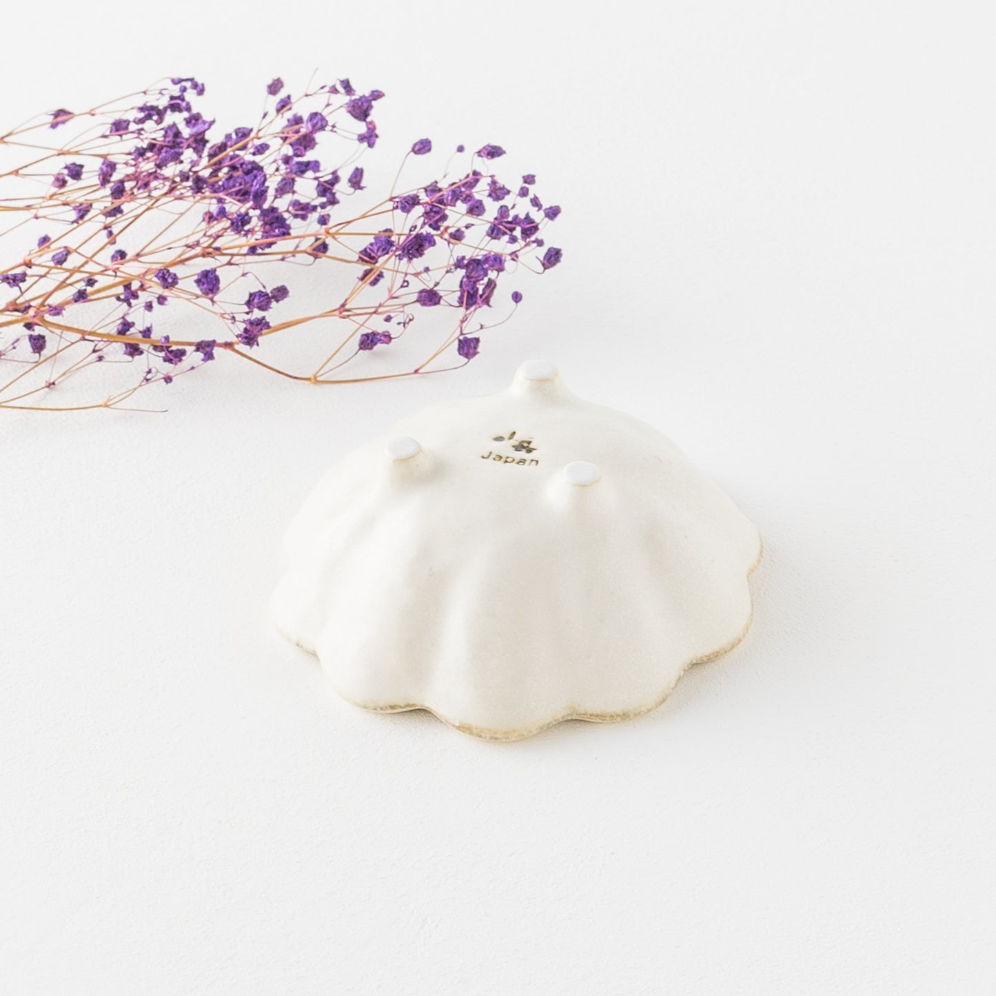 手づくりのぬくもりが感じられる白練の輪花小鉢。磁器なのに陶器のような土ものを感じさせる仕上がりになっています。白いうつわは季節やシーン選ばず使えて重宝します。