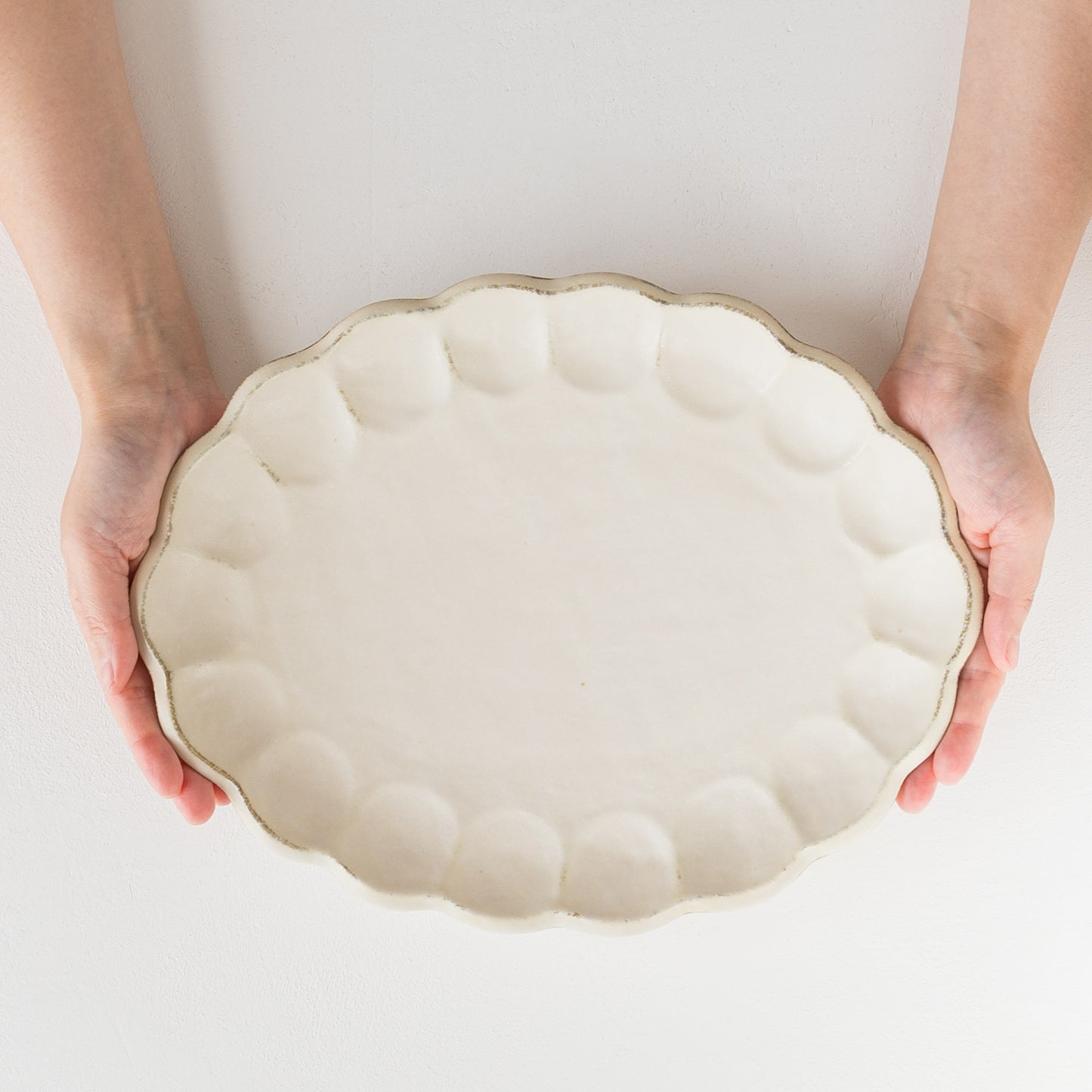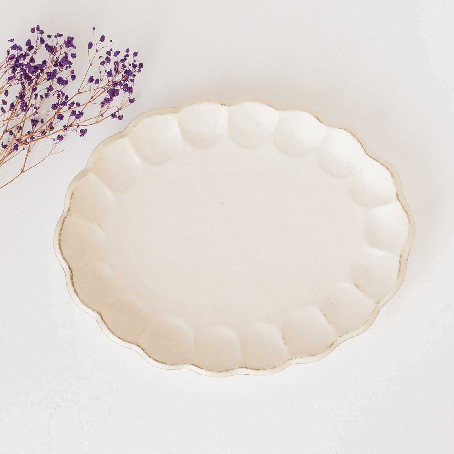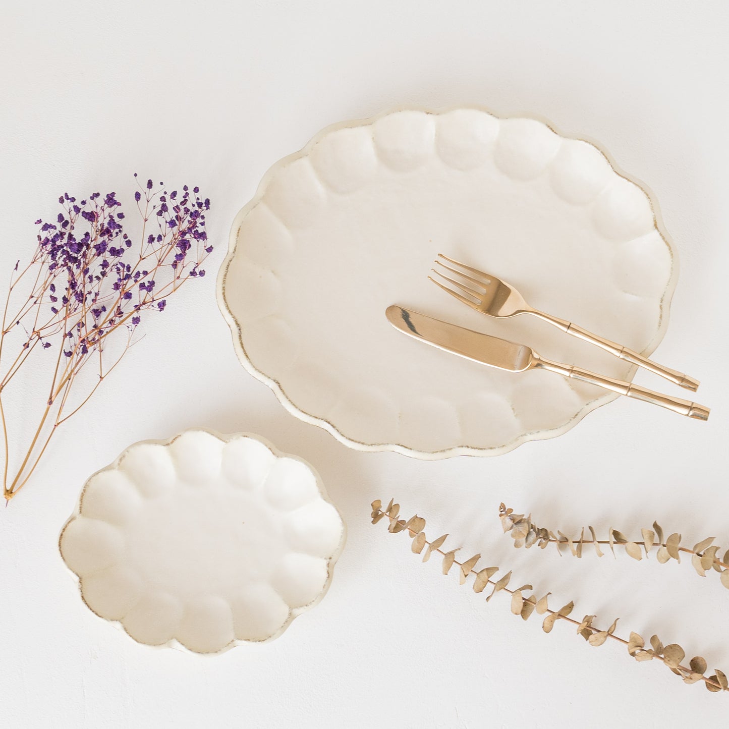 お料理を引き立ててくれる華やかで愛らしい輪花のお皿。和にも洋にも合わせやすく、また、どんなうつわとも相性が良く、お料理が映えるうつわです。