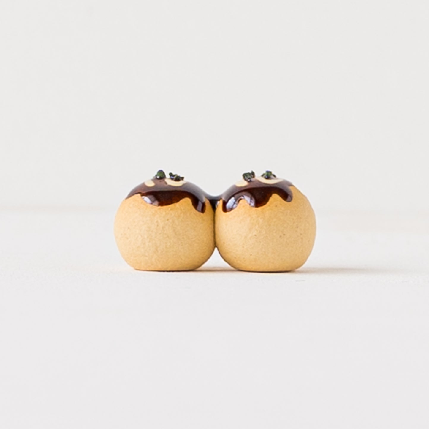 まるっとかわいいフォルムのタコ焼きくん。ふりかかっている青のりも立体的で手が込んでいます。また爪楊枝がさせる仕様になっているのもニンマリしてしまいます。