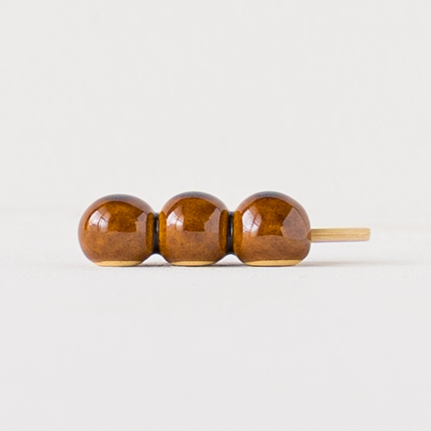 おだんごの焼き色もしっかりと表現されている本当に美味しそうなみたらし団子。甘じょっぱい砂糖醤油の濃淡とテカリもかわいらしい。こちらも本物の竹串を使用しているので本物さながら。