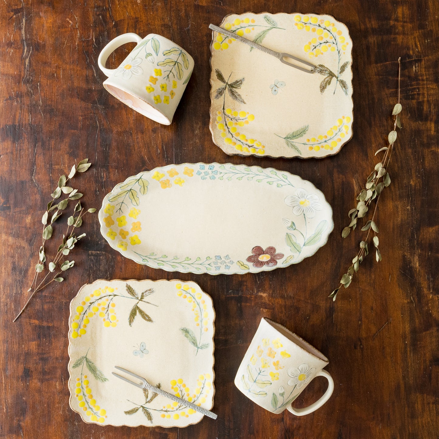 お散歩している時に目にする草花や生き物などをモチーフに絵付けをされています。毎日必ず手にするうつわ。使っていて楽しくなるうつわづくりをいつも心がけていらっしゃるその言葉のとおり、温かくて楽しい気持ちにしてくれます。
