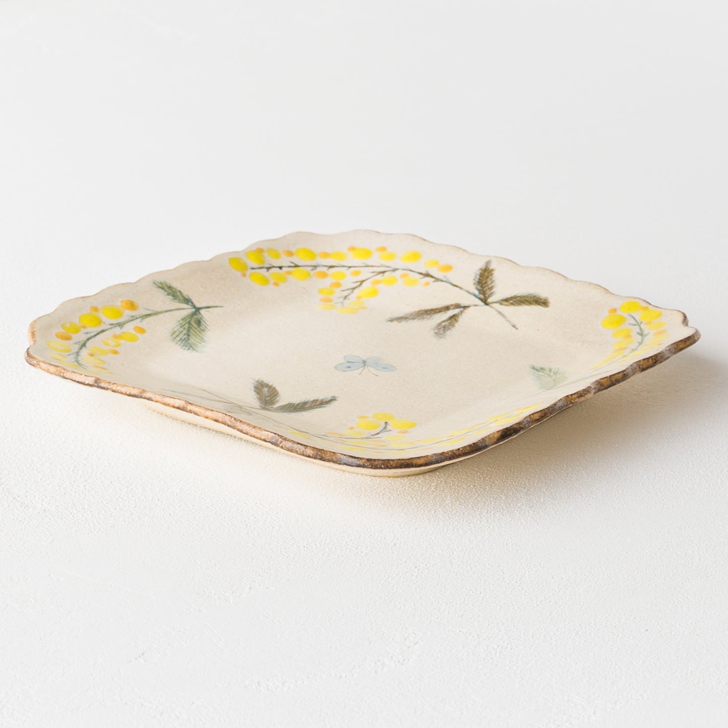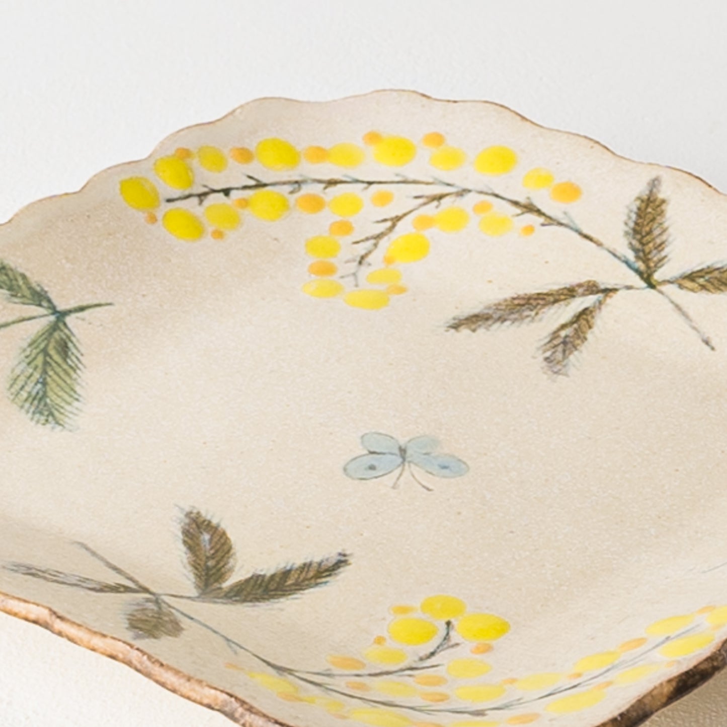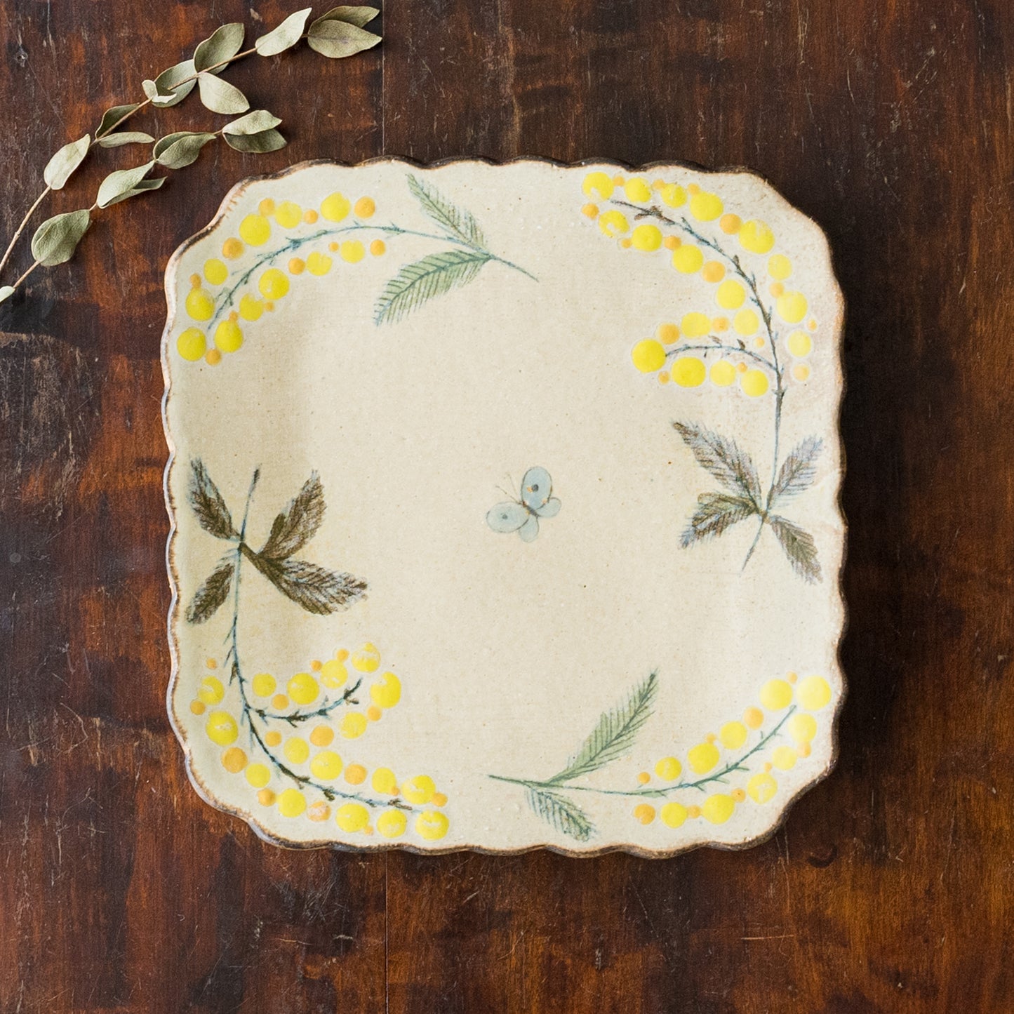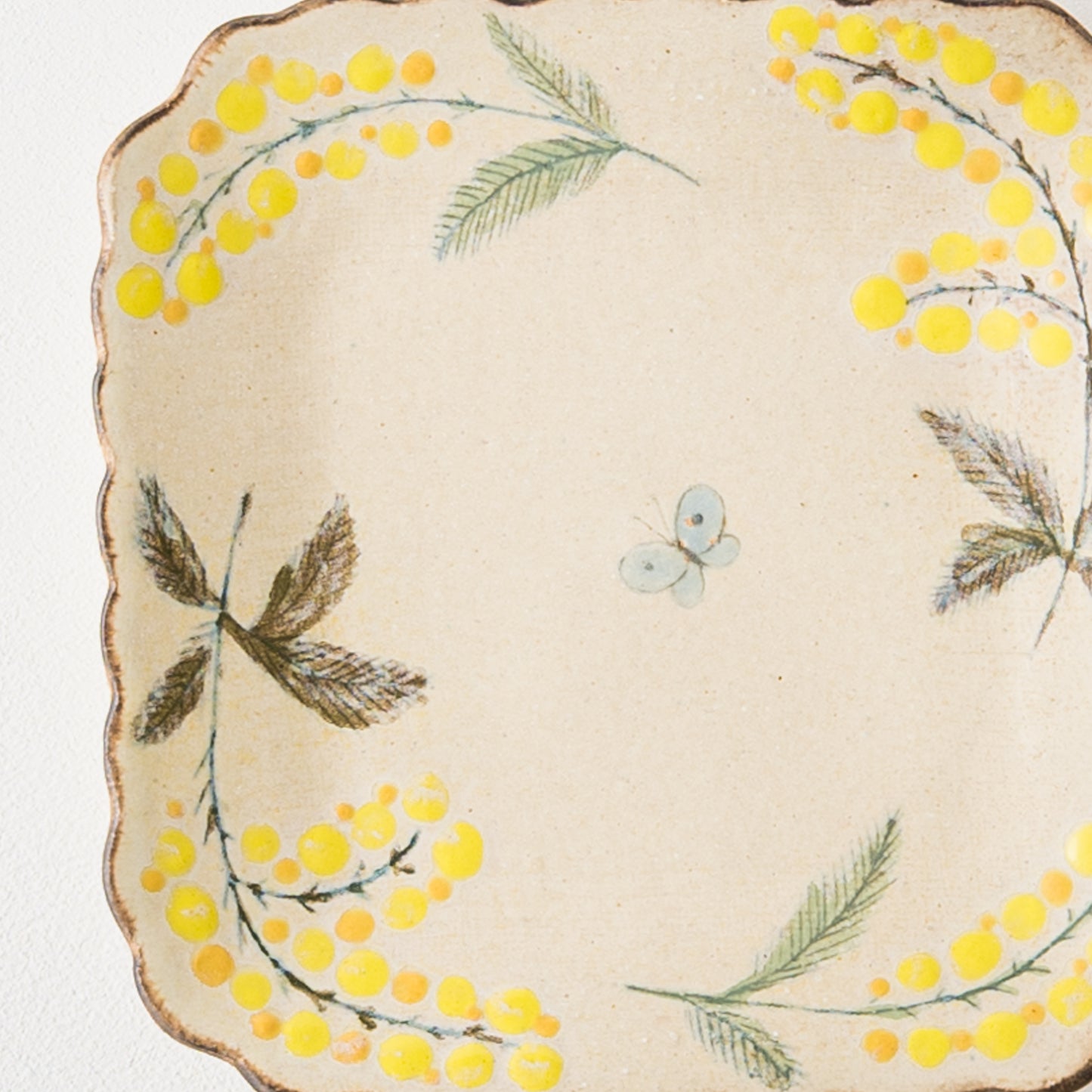花びらのような柔らかな曲線がかわいらしい四角。絵本に出てくるような温もりが伝わってくるやさしいタッチのミモザとちょうちょを眺めていると気持ちがほっと安らぎます。