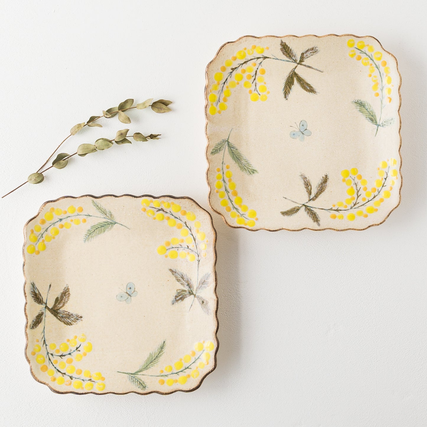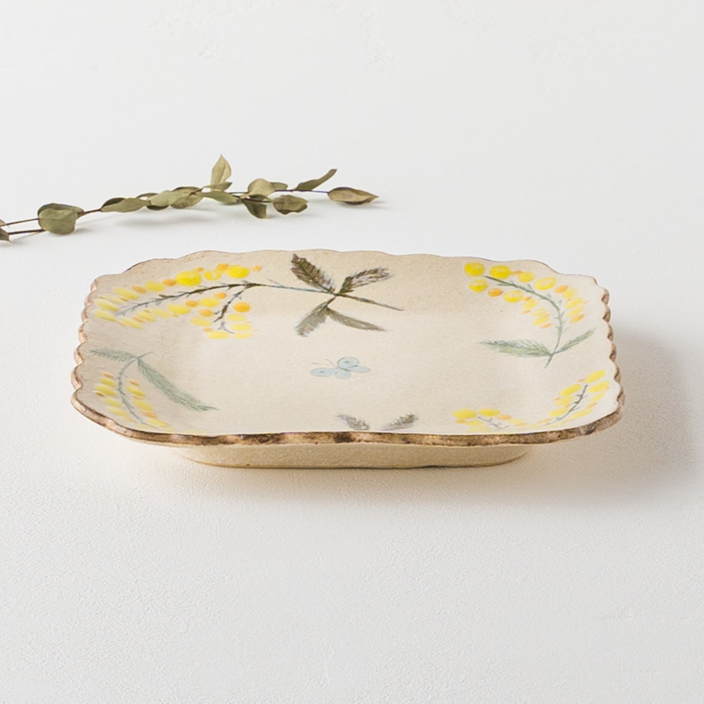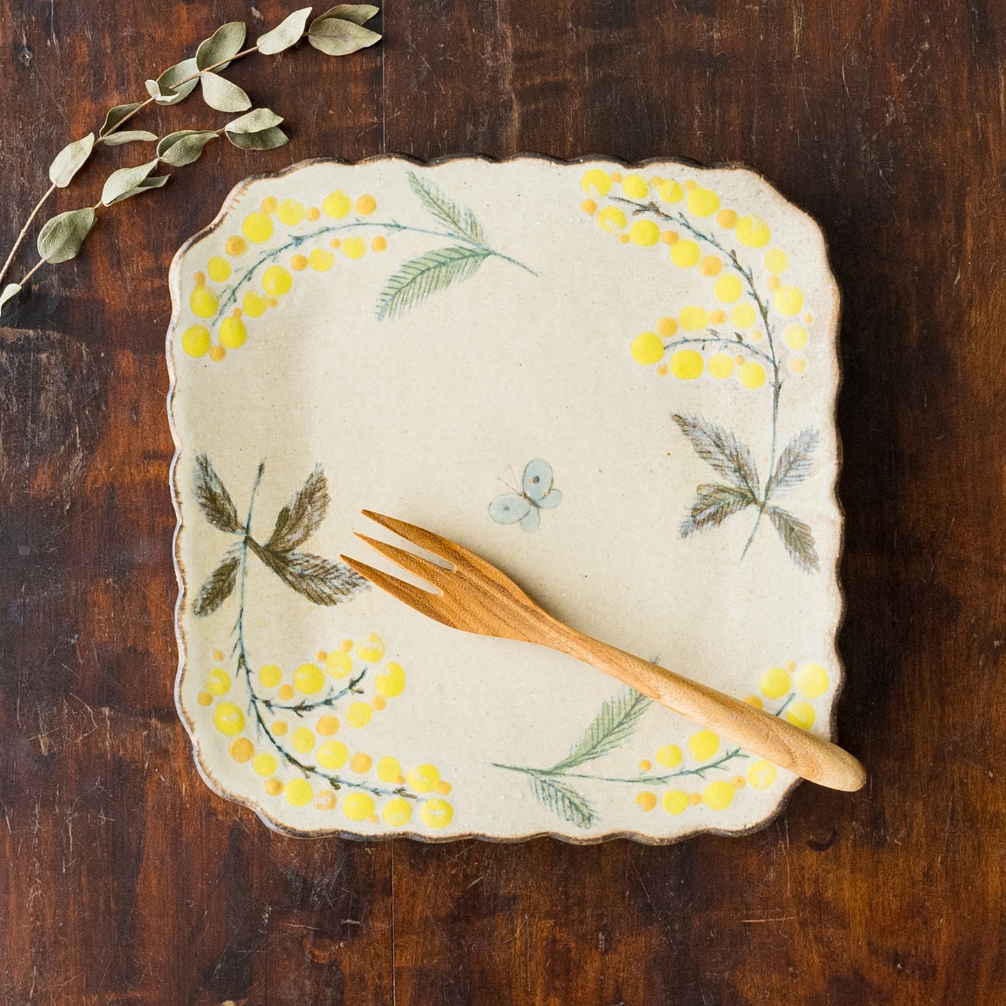 花びらのような柔らかな曲線がかわいらしい四角。絵本に出てくるような温もりが伝わってくるやさしいタッチのミモザとちょうちょを眺めていると気持ちがほっと安らぎます。