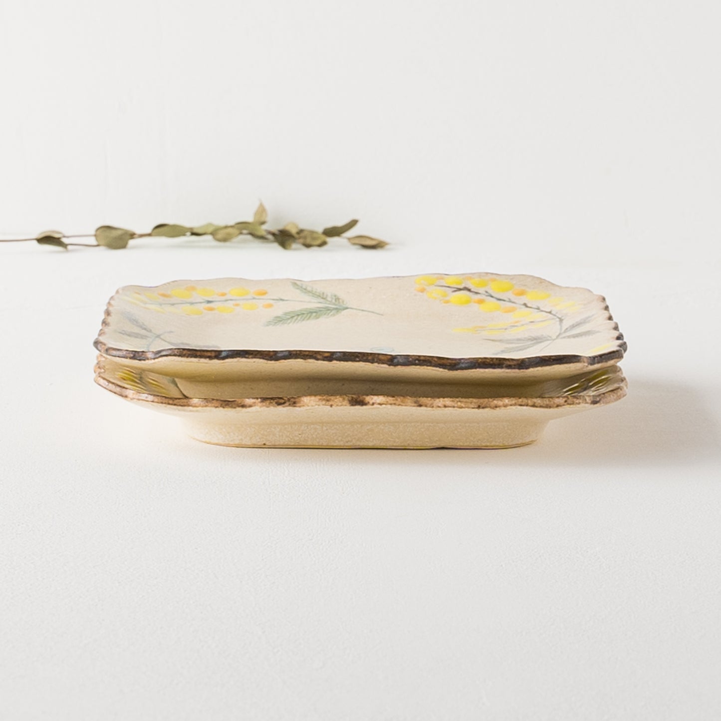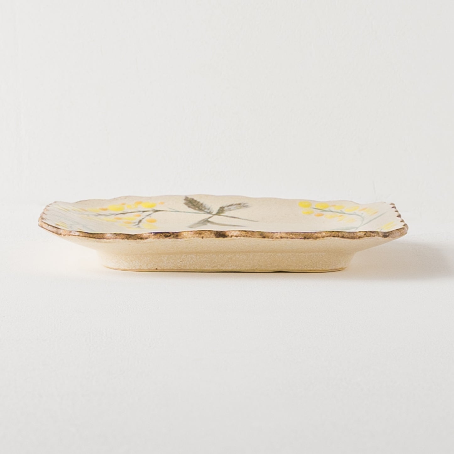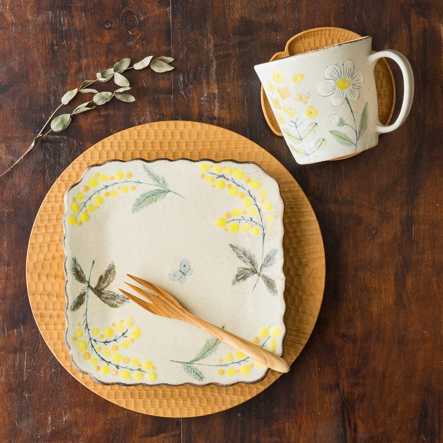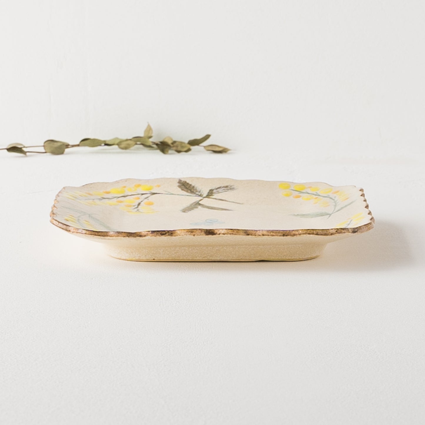 花びらのような柔らかな曲線がかわいらしい四角。絵本に出てくるような温もりが伝わってくるやさしいタッチのミモザとちょうちょを眺めていると気持ちがほっと安らぎます。
