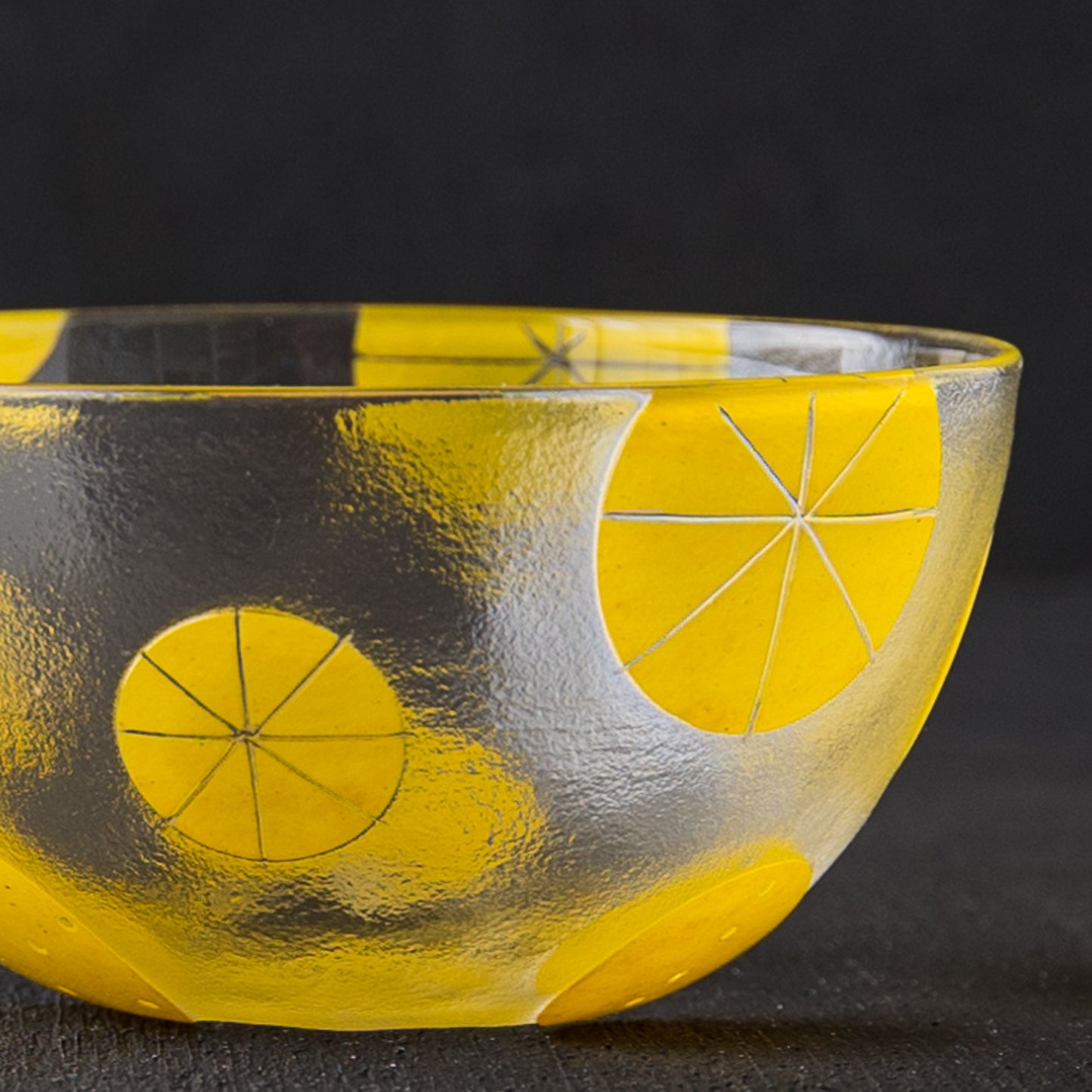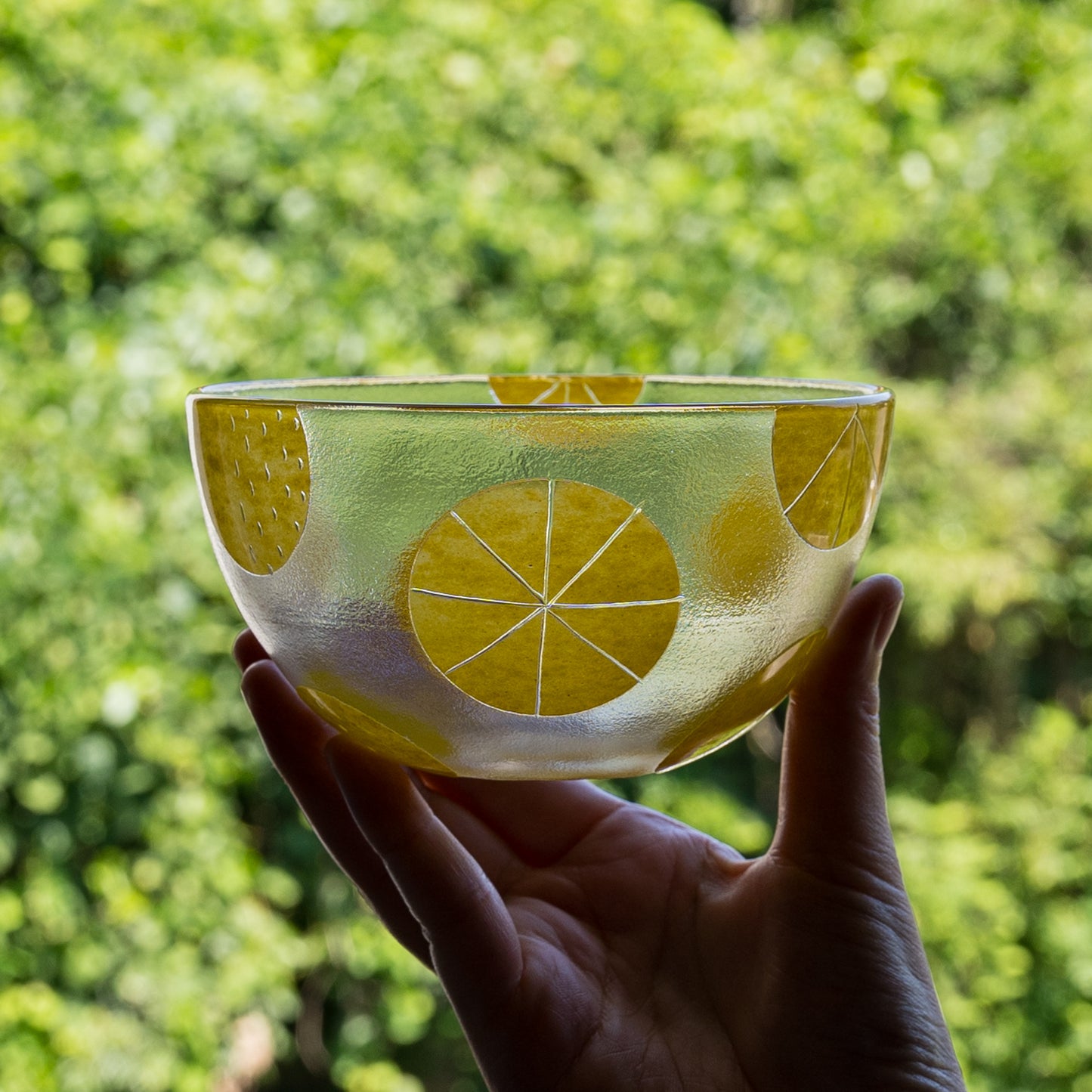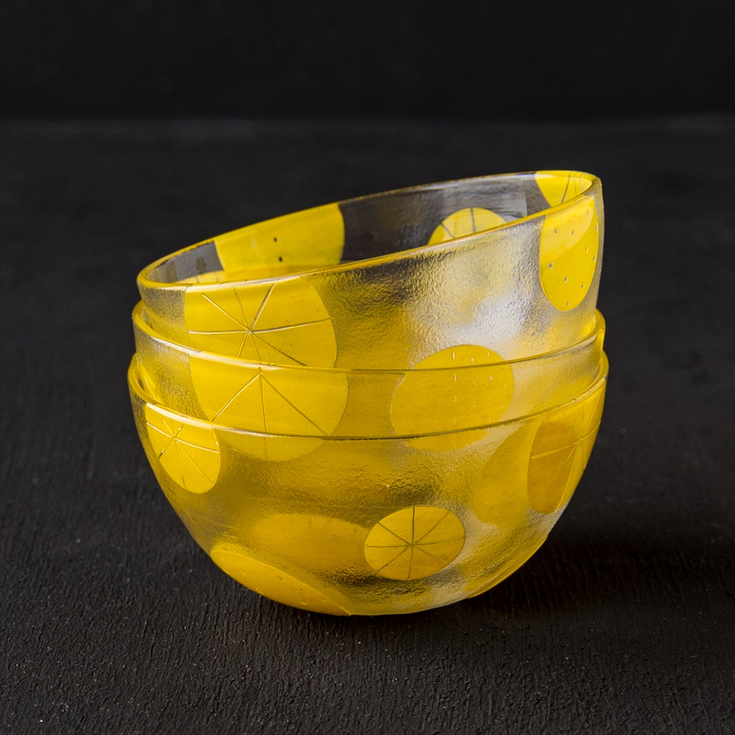 ガラスを吹いて形成した後、模様を施す部分をマスキングします。その後、サンドブラスト(表面に砂状の研磨材を吹きかける加工法)で模様をひとつひとつ削っていき、さらにこのMARUシリーズは艶を出すため、吹きガラスの手法で焼いて戻す作業を行っているので、唯一無二の美しさと存在感を放っています。