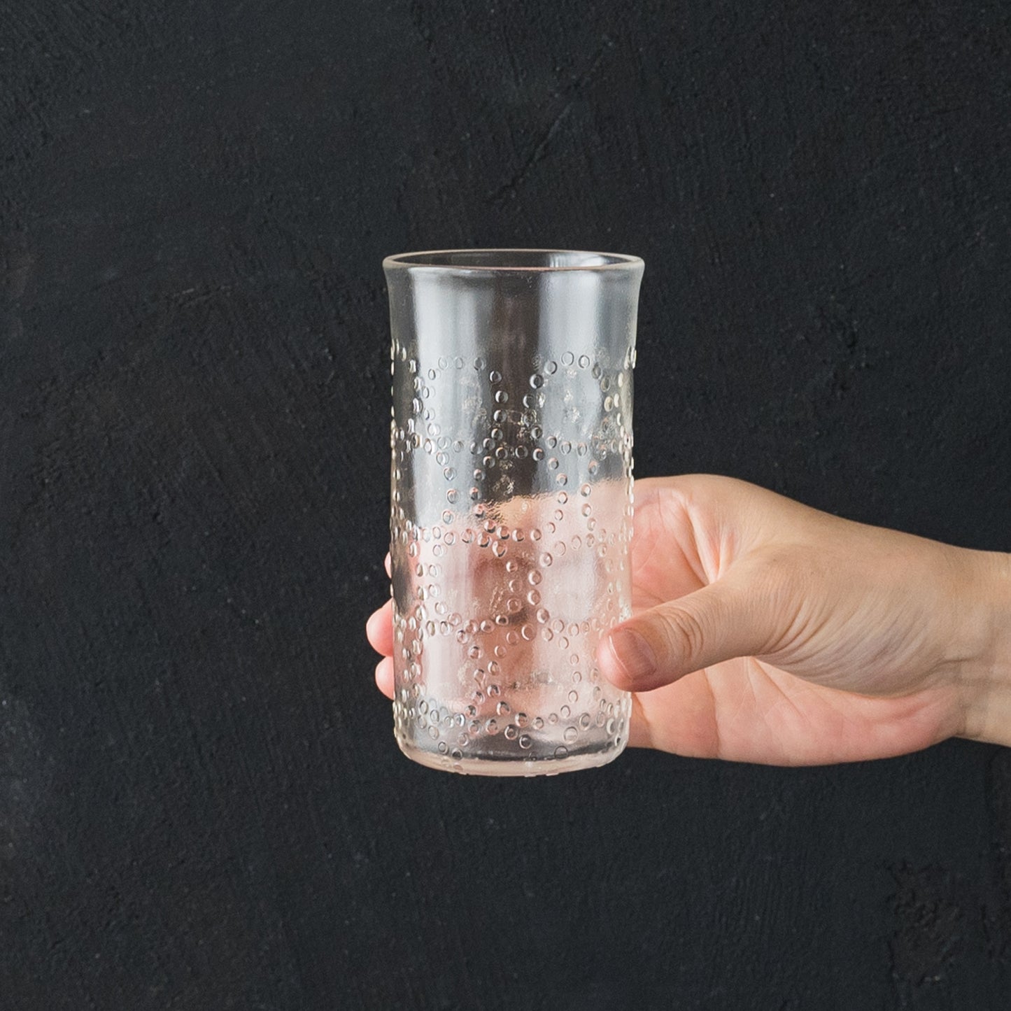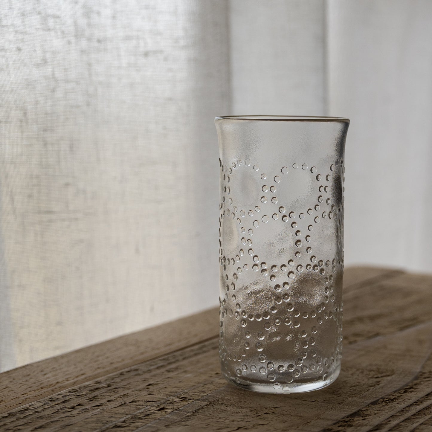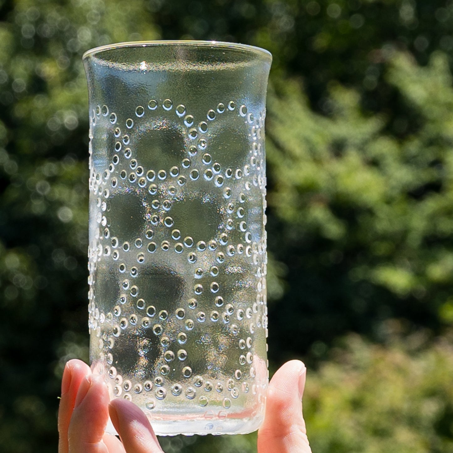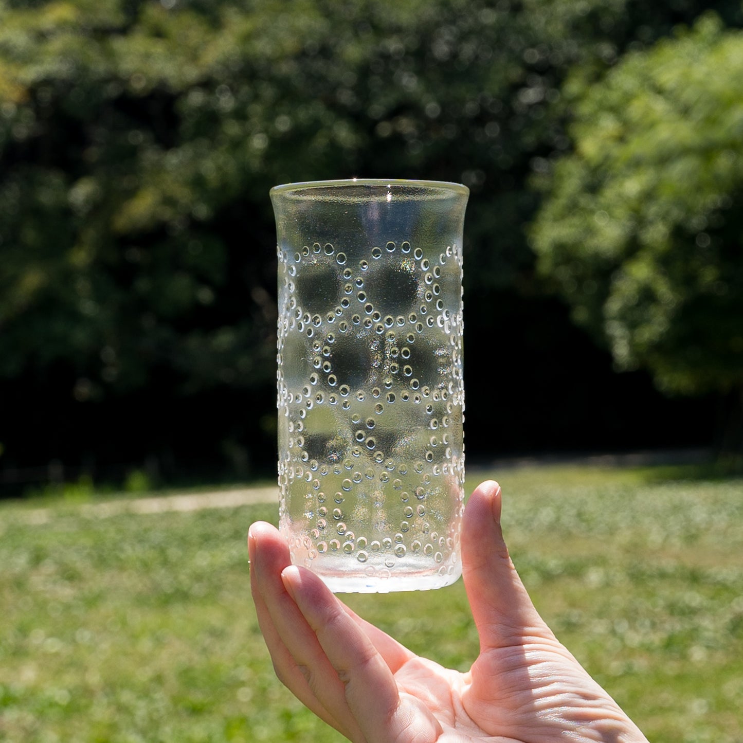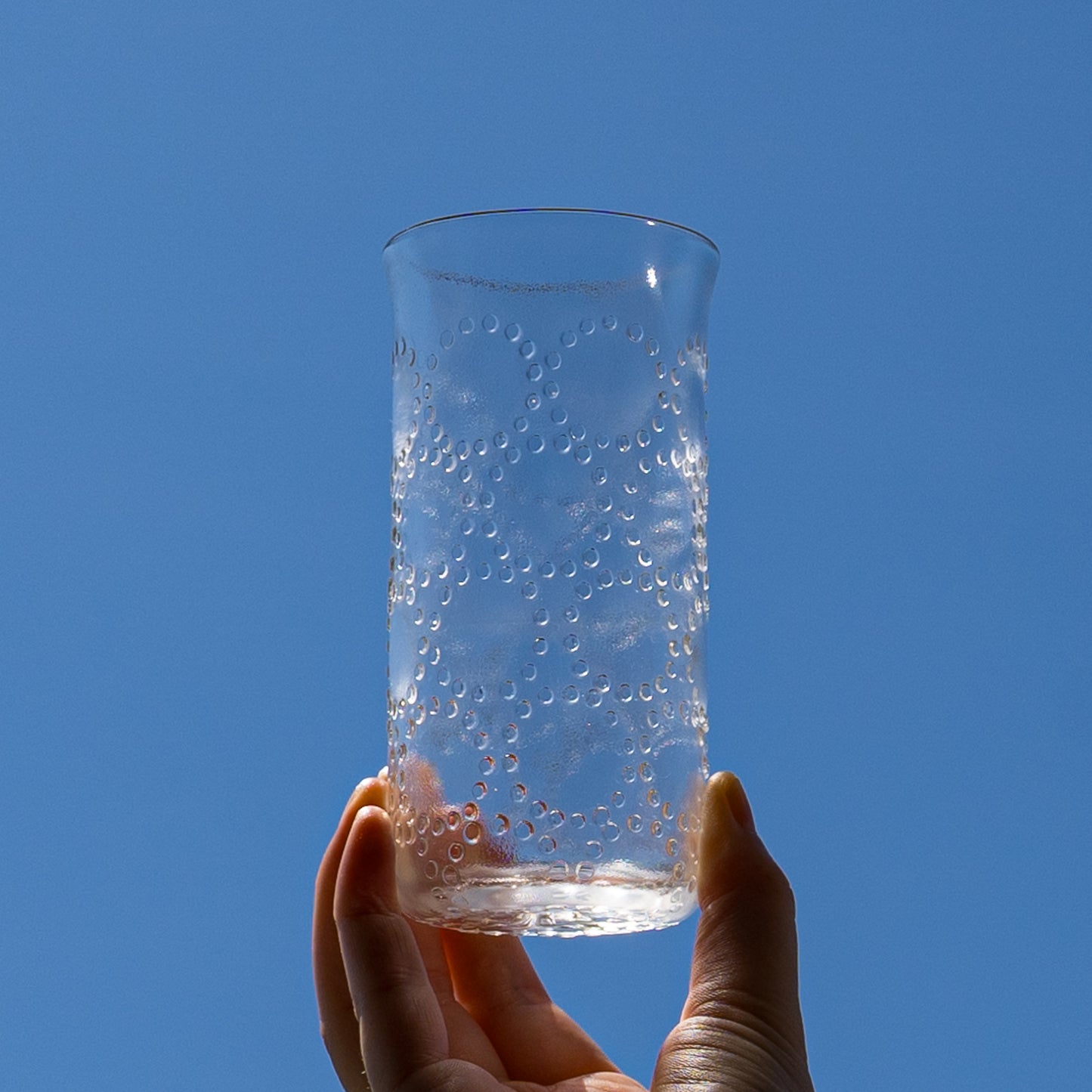 光に当たると点の模様が浮かび上がった陰影がなんとも言えない美しさ。口径が小さいことで炭酸が抜けにくく、炭酸水やソーダなどシュワシュワ感を長く楽しめます。また、炭酸系のカクテルやスパークリングワインを入れるのも素敵です。