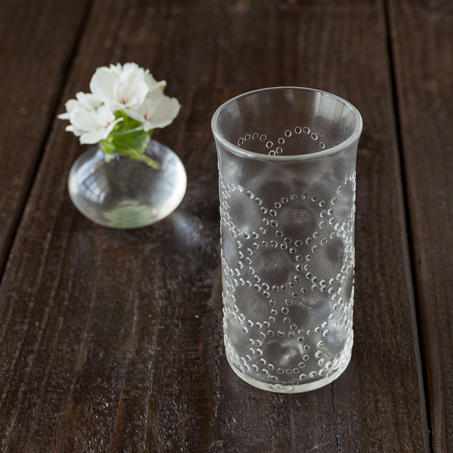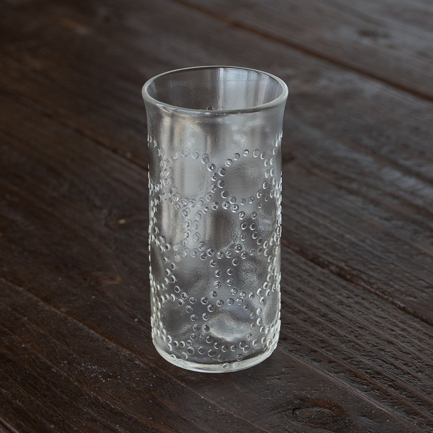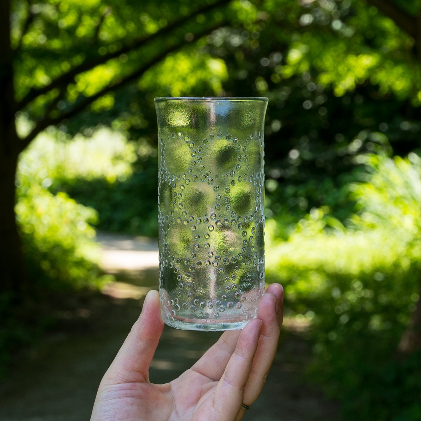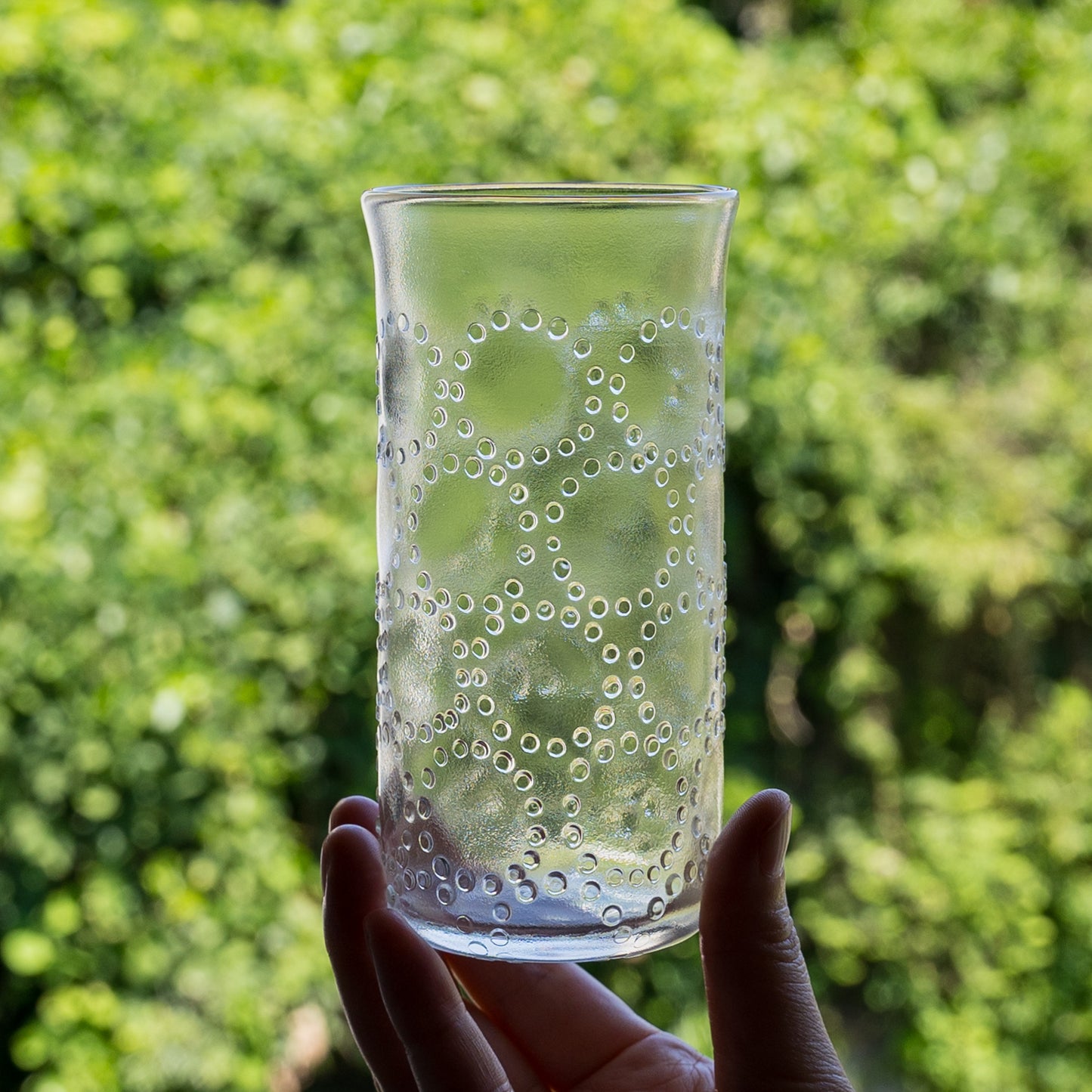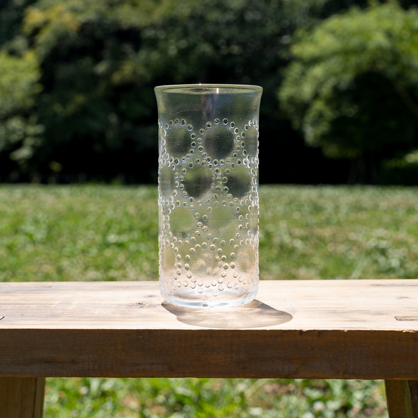 光に当たると点の模様が浮かび上がった陰影がなんとも言えない美しさ。口径が小さいことで炭酸が抜けにくく、炭酸水やソーダなどシュワシュワ感を長く楽しめます。また、炭酸系のカクテルやスパークリングワインを入れるのも素敵です。