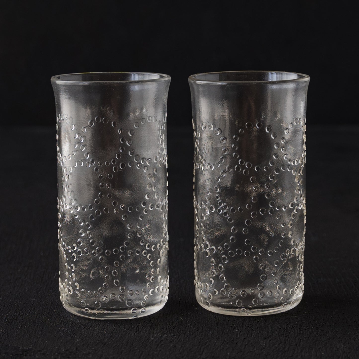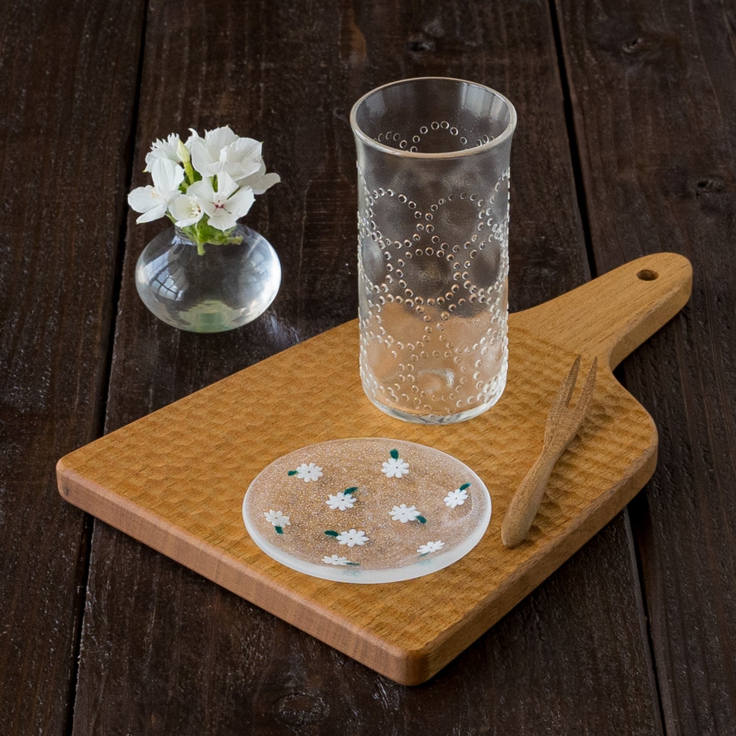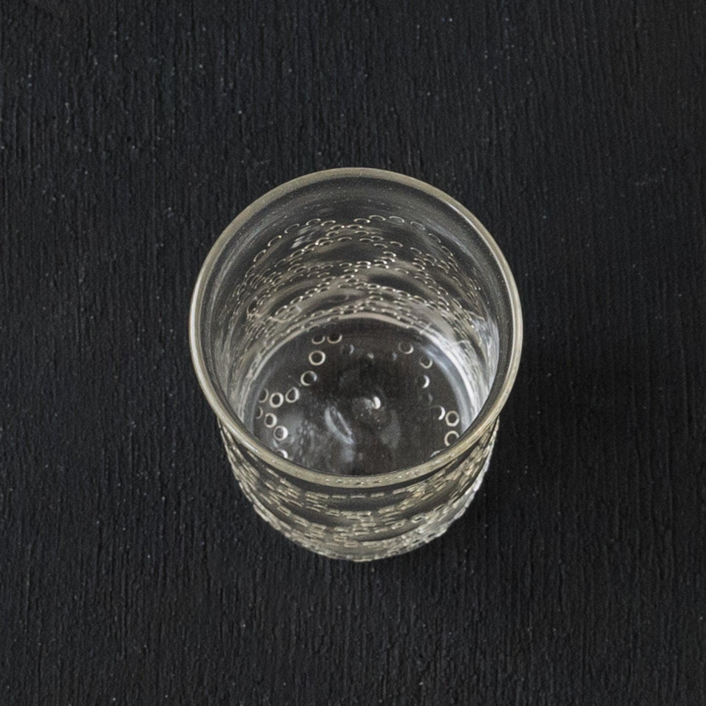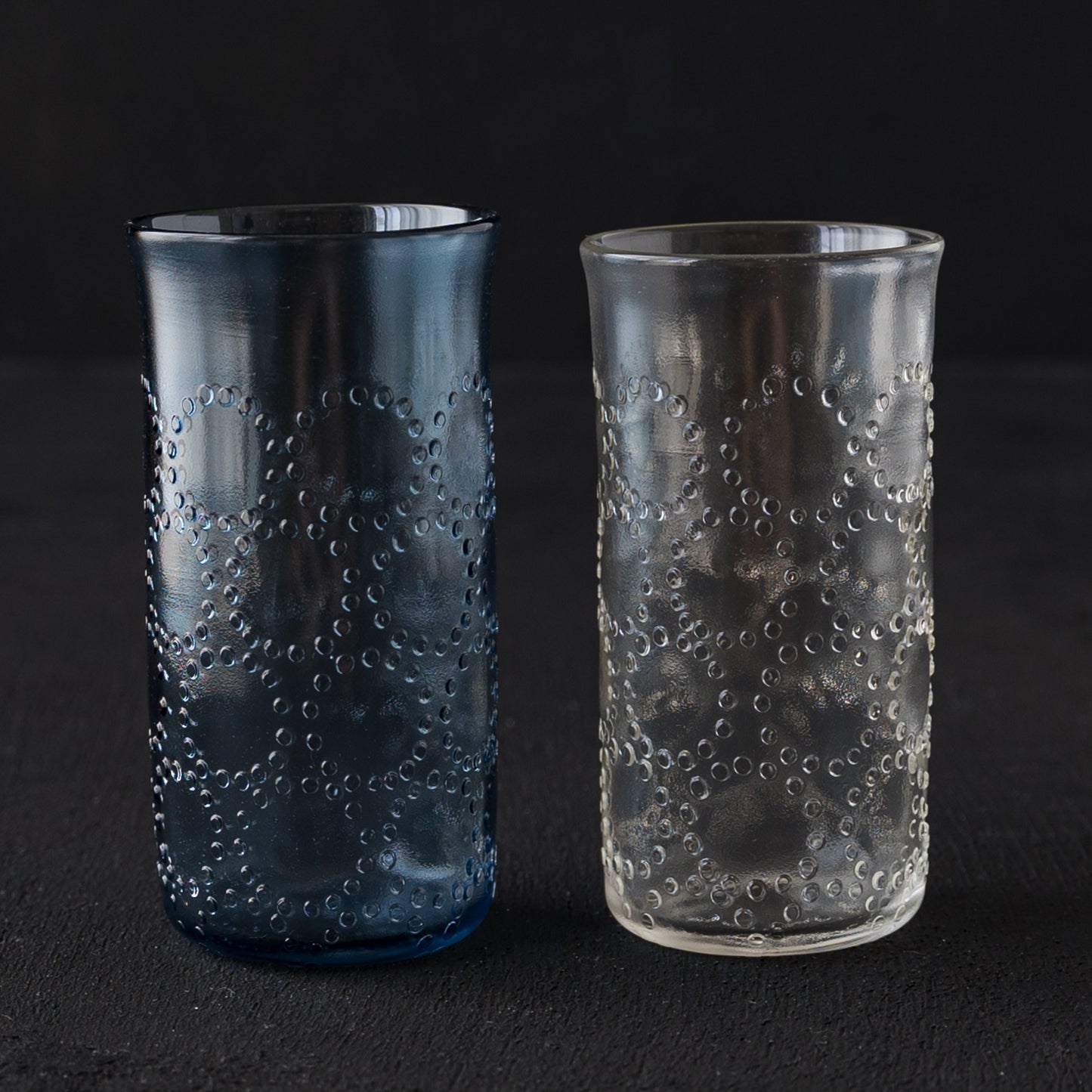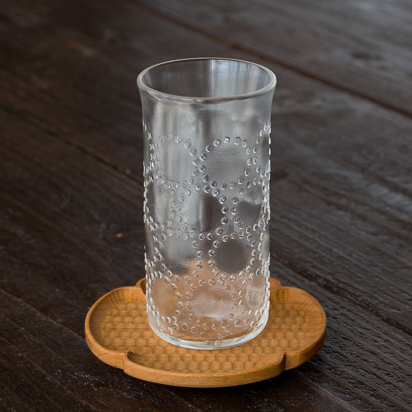 光に当たると点の模様が浮かび上がった陰影がなんとも言えない美しさ。口径が小さいことで炭酸が抜けにくく、炭酸水やソーダなどシュワシュワ感を長く楽しめます。また、炭酸系のカクテルやスパークリングワインを入れるのも素敵です。