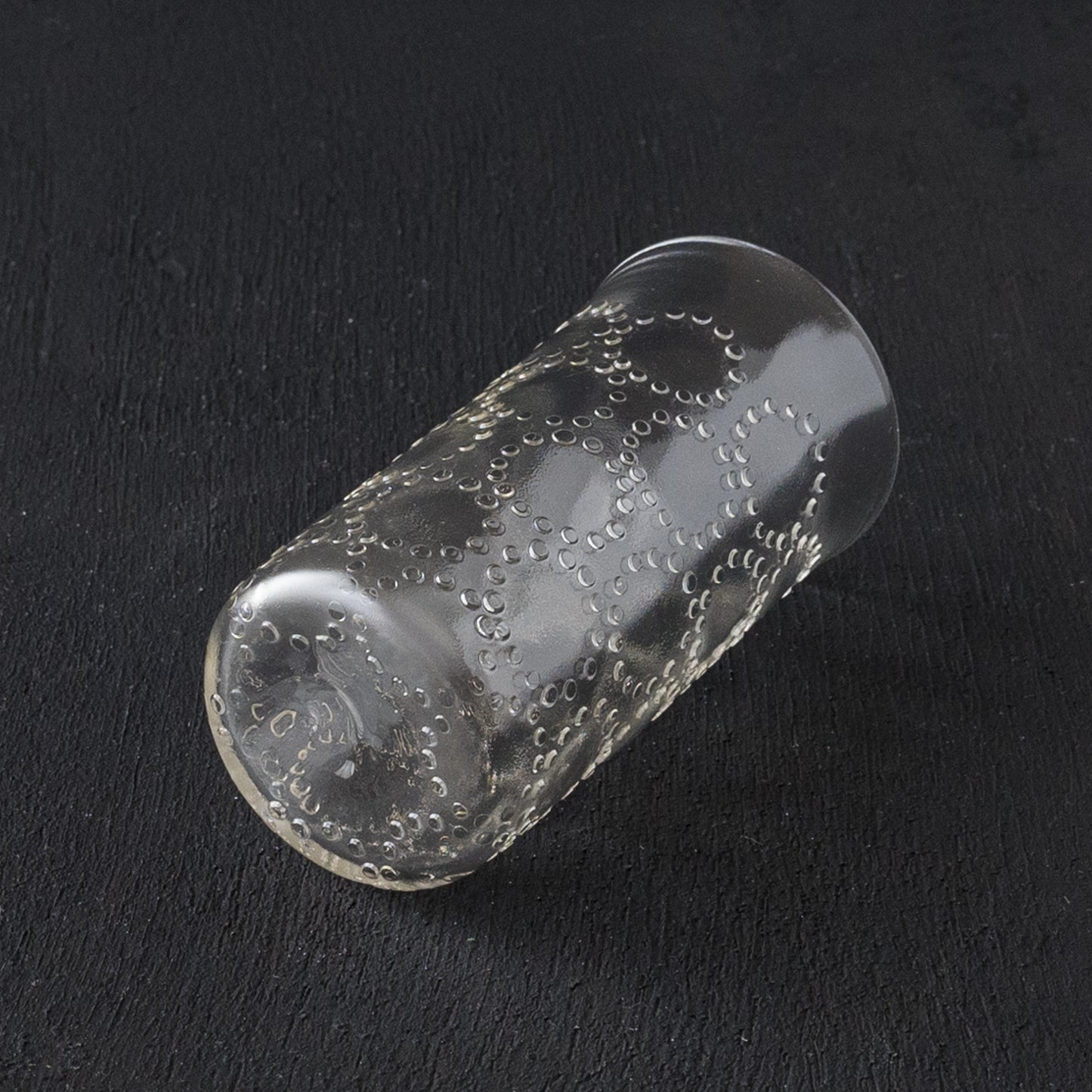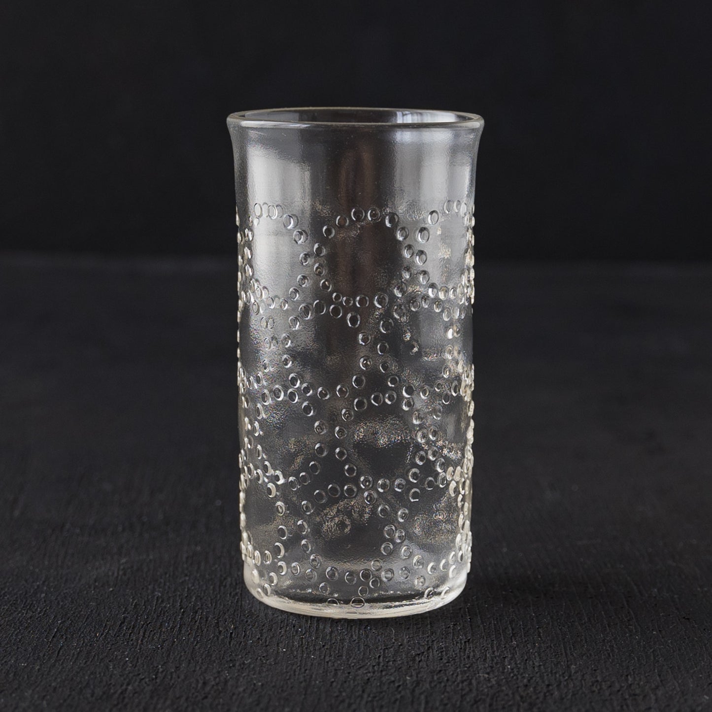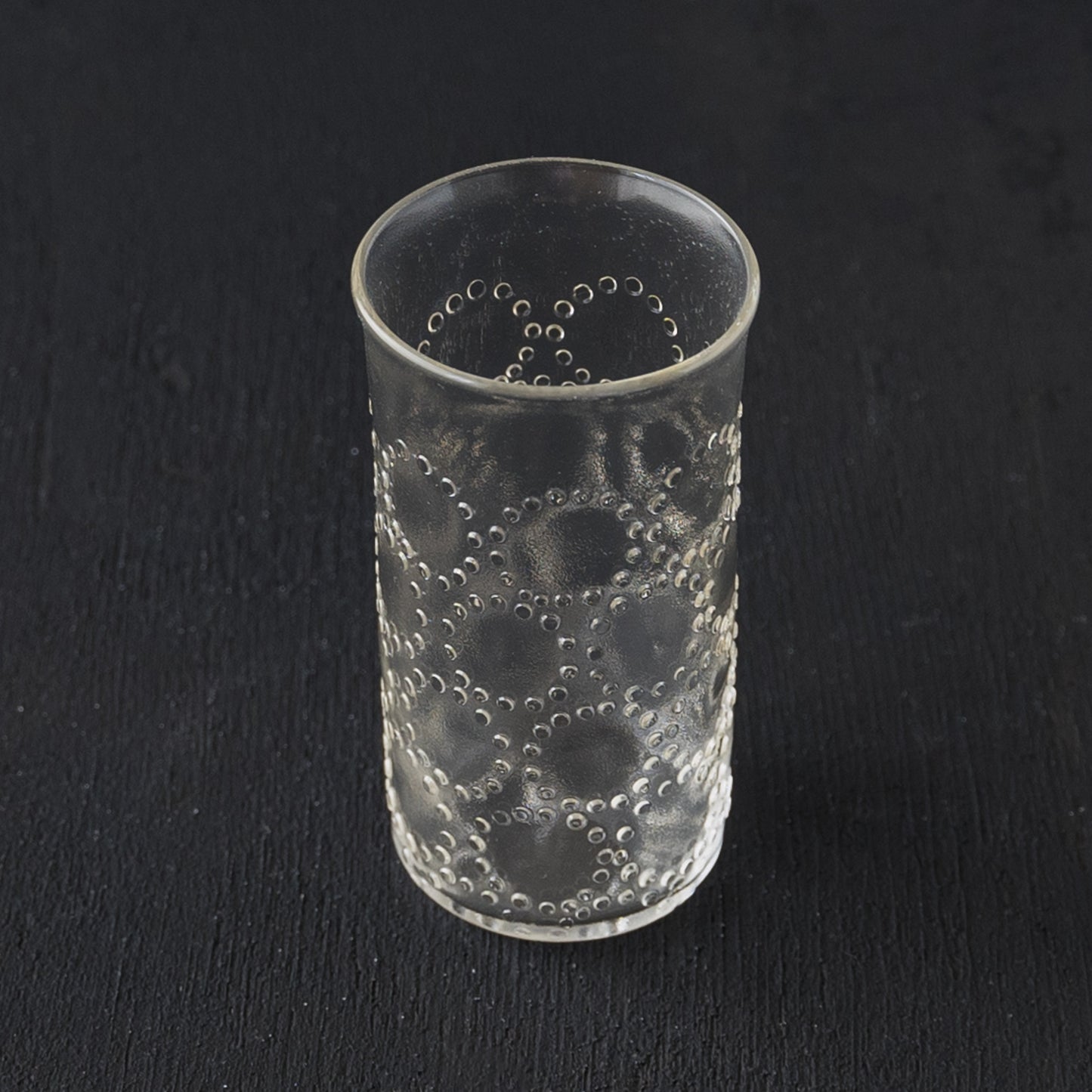 円柱形のフォルムがきりっとしていてシックなゾンビグラス(「ゾンビ」という名前のカクテルが由来)。立体感のある点でデザインした丸い模様が上品かつスタイリッシュな佇まいで見惚れてしまいます。