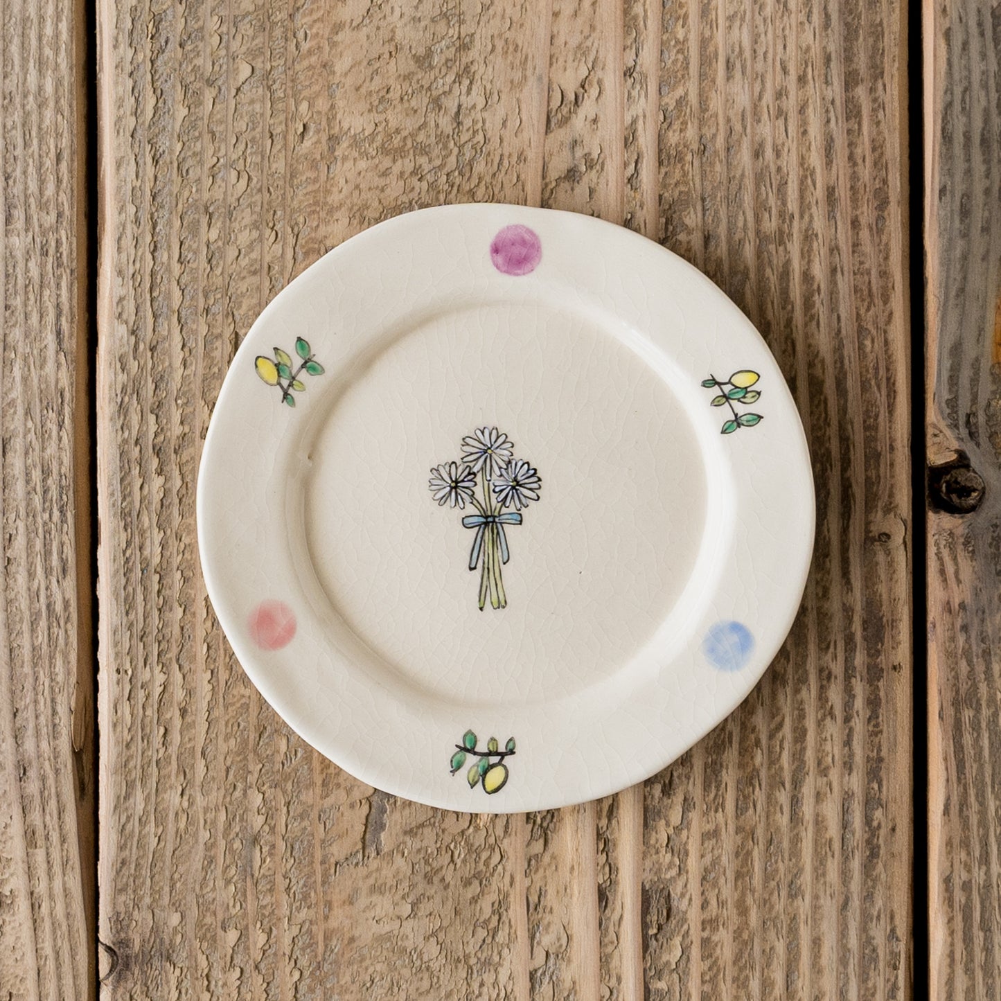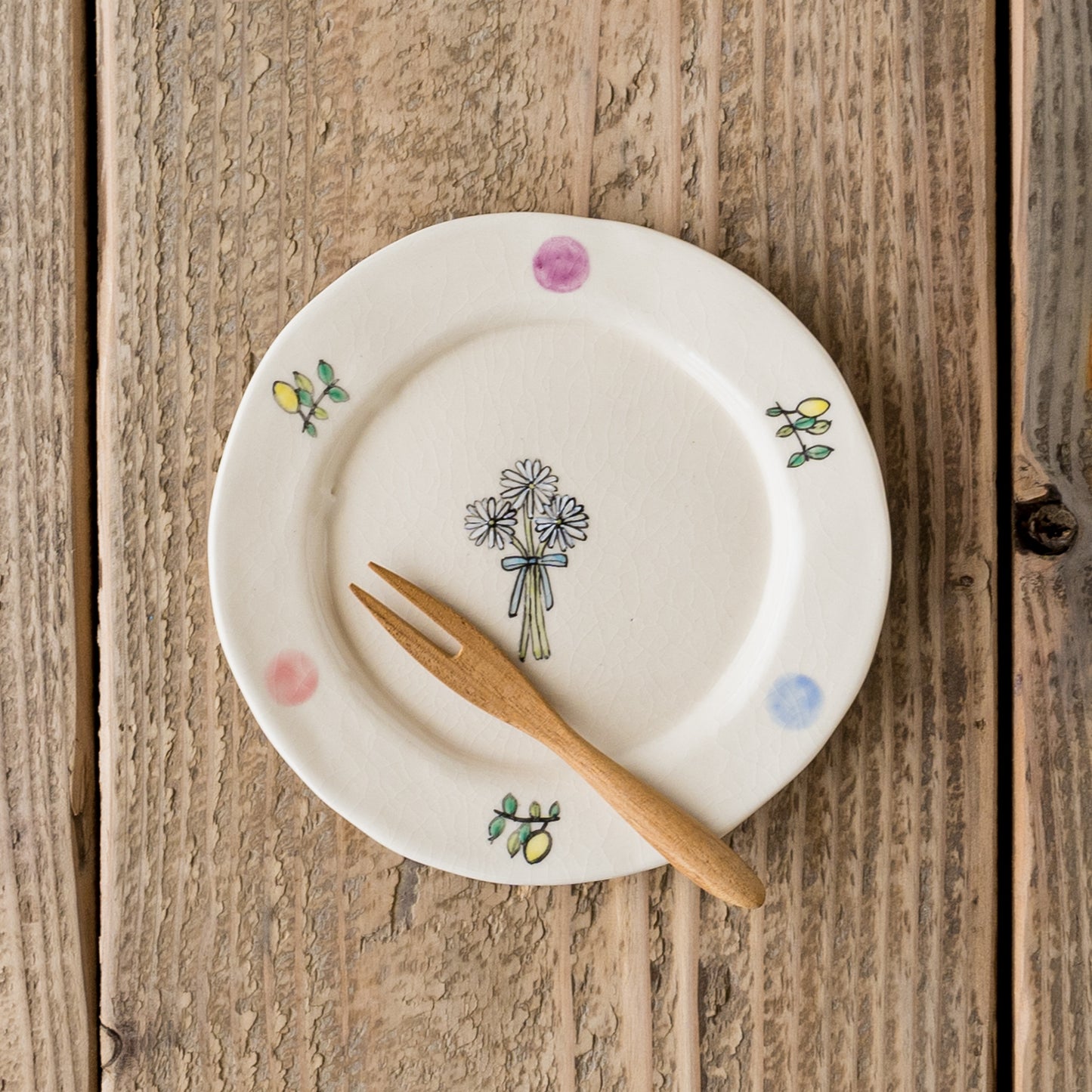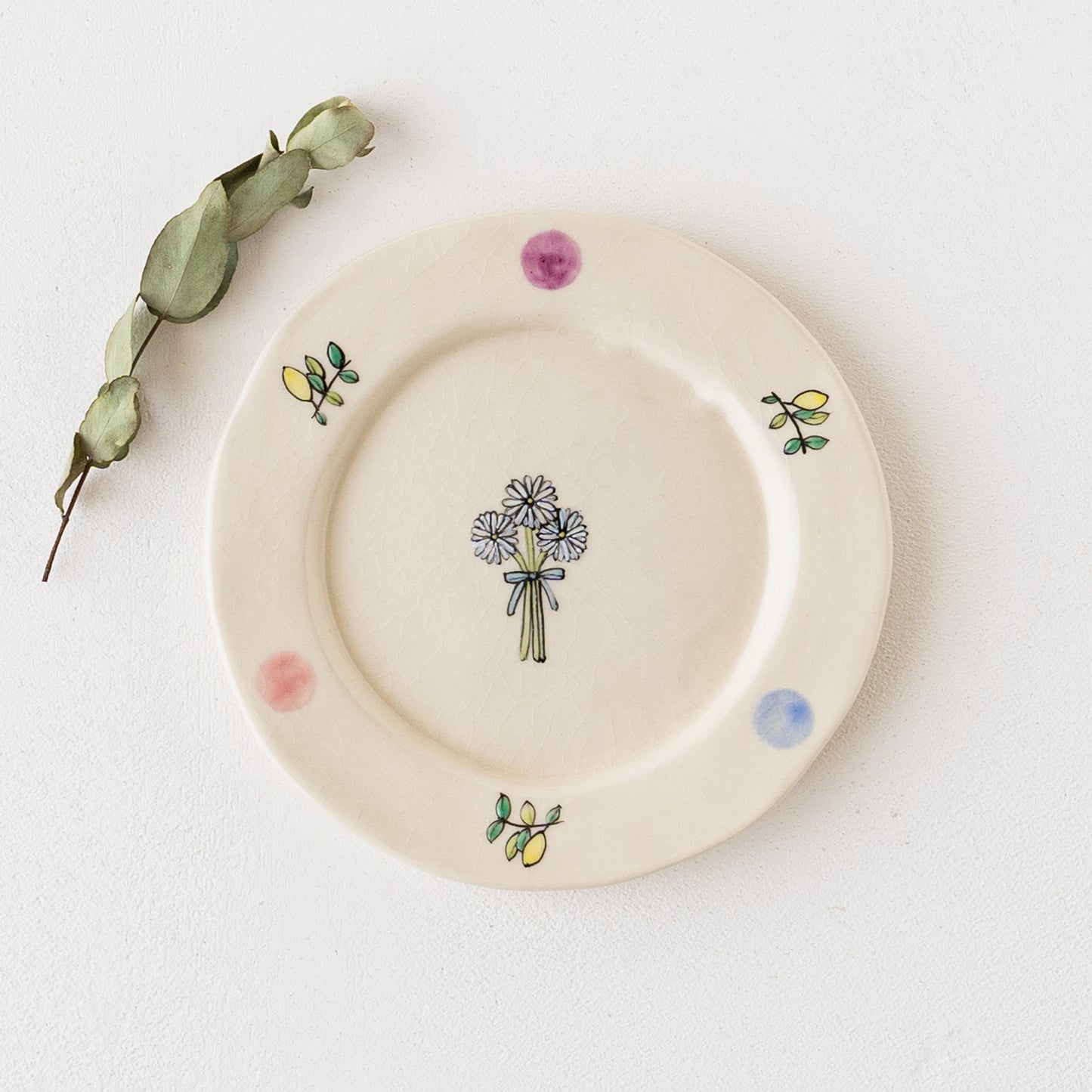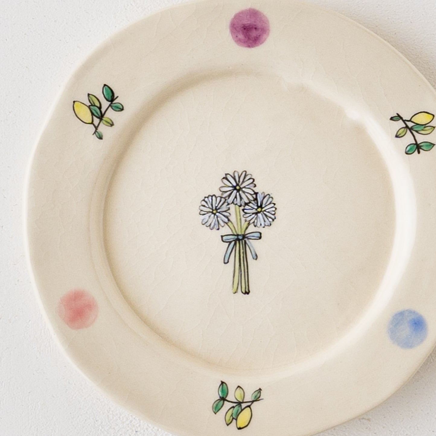 やさしさに溢れた3本の白い花束。絵本に出てくるような色彩豊かな絵柄に心が和みます。リムに描かれたレモンの絵柄にも気持ちが安らぎます。
