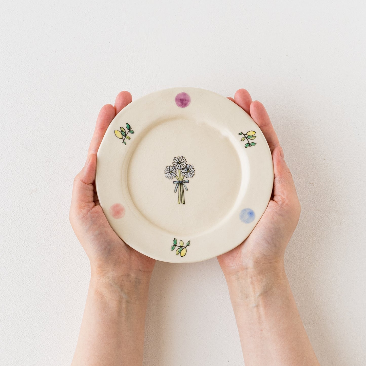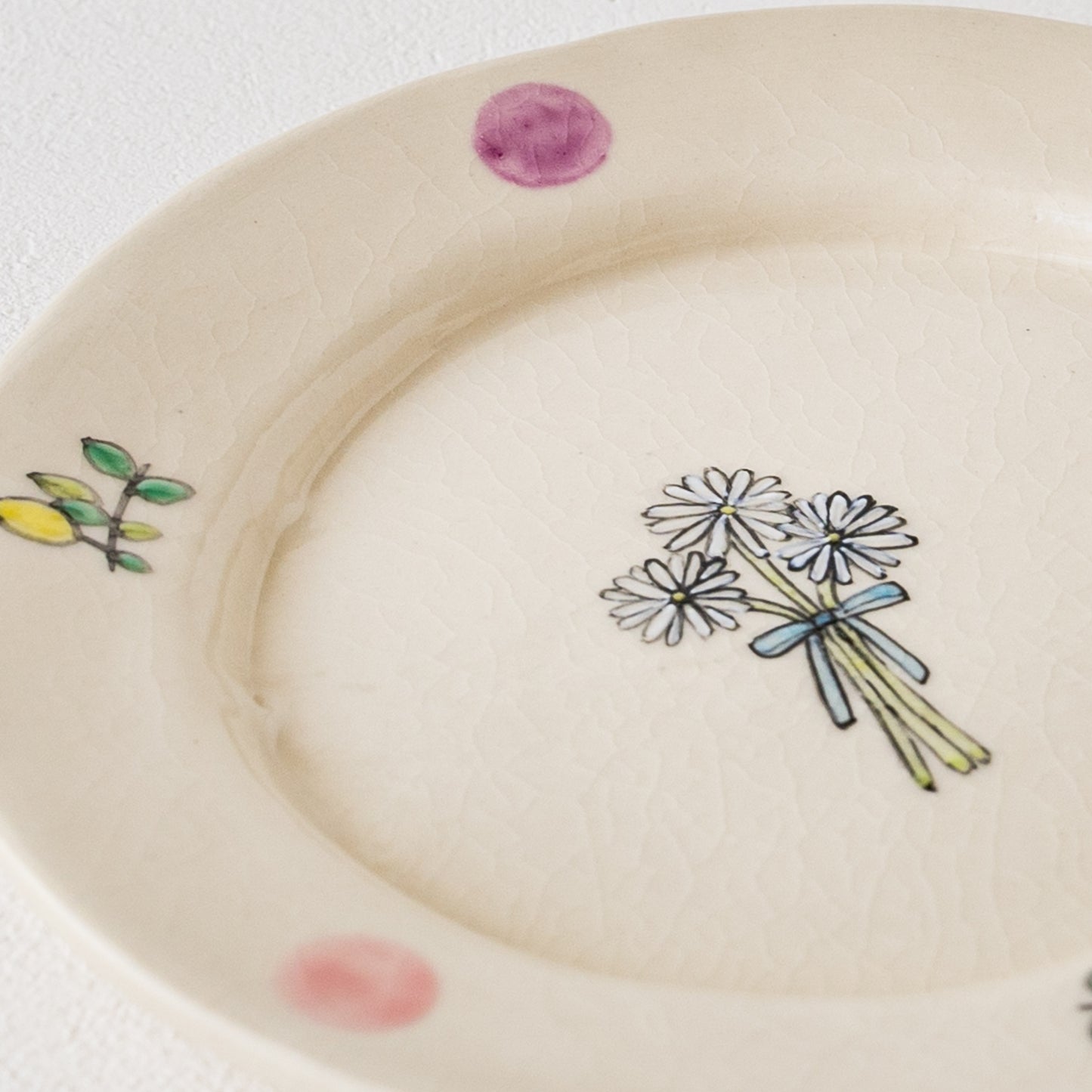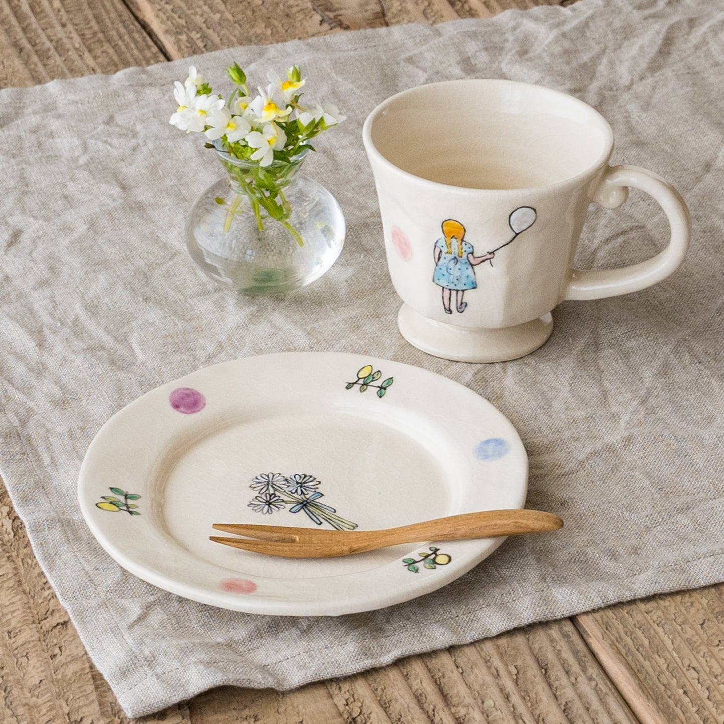 やさしさに溢れた3本の白い花束。絵本に出てくるような色彩豊かな絵柄に心が和みます。リムに描かれたレモンの絵柄にも気持ちが安らぎます。