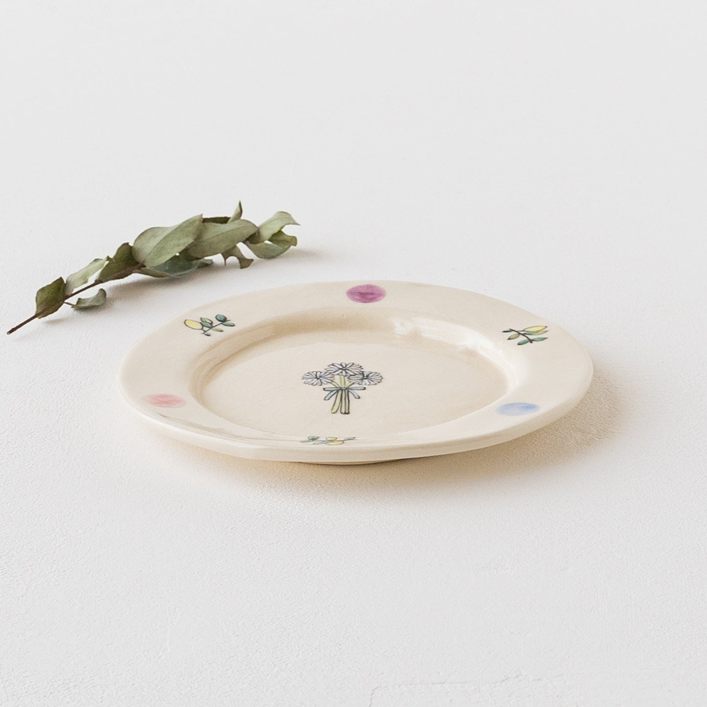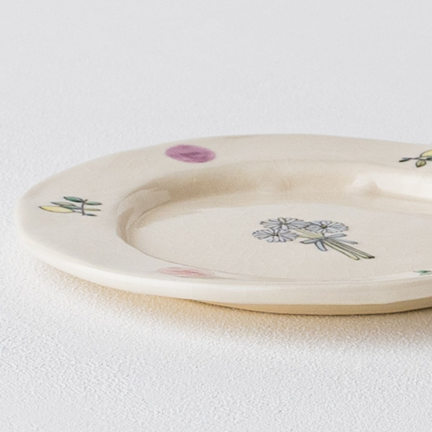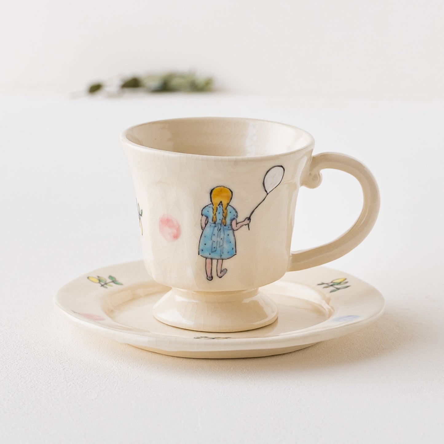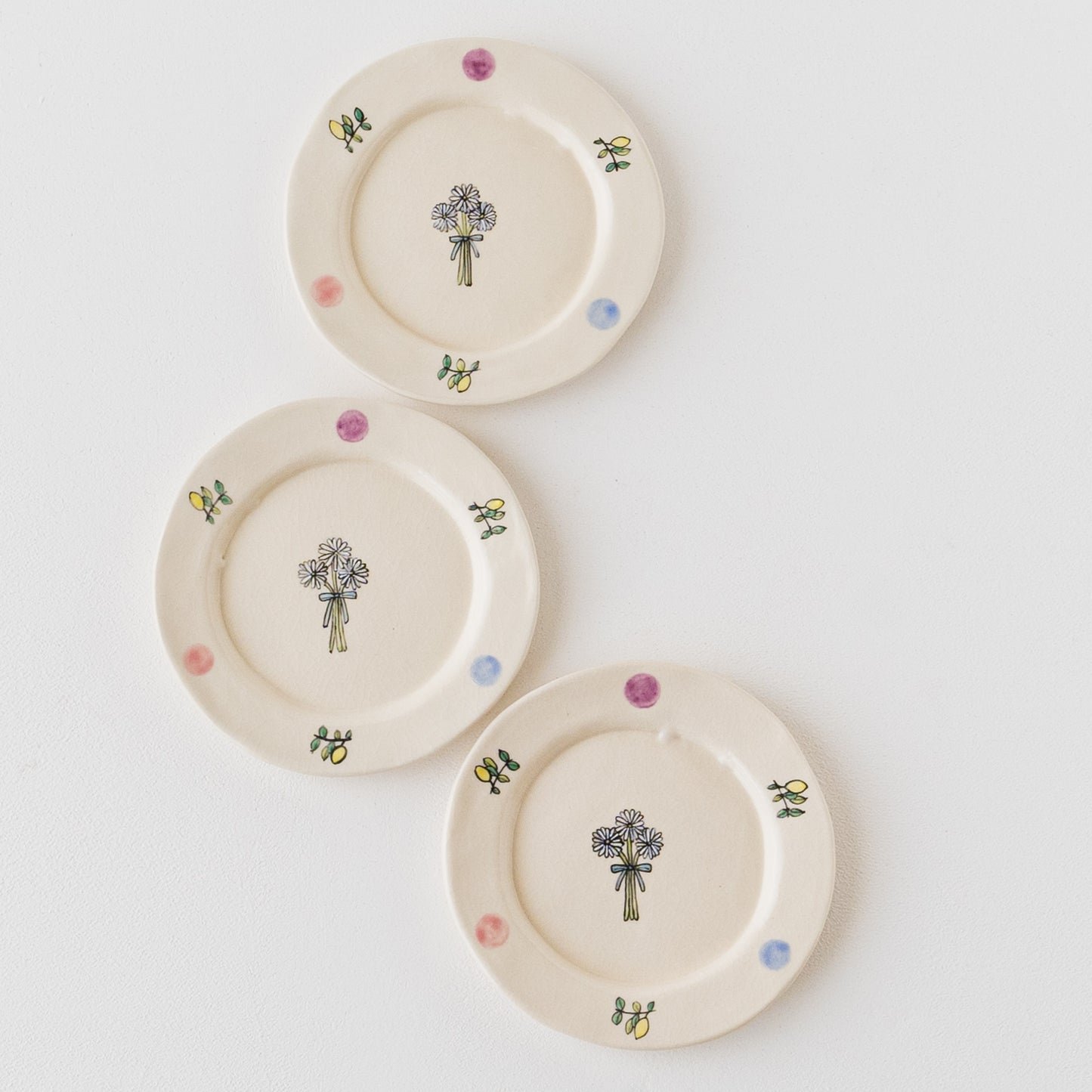 やさしさに溢れた3本の白い花束。絵本に出てくるような色彩豊かな絵柄に心が和みます。リムに描かれたレモンの絵柄にも気持ちが安らぎます。