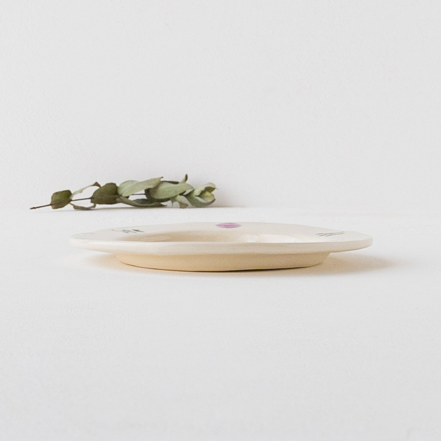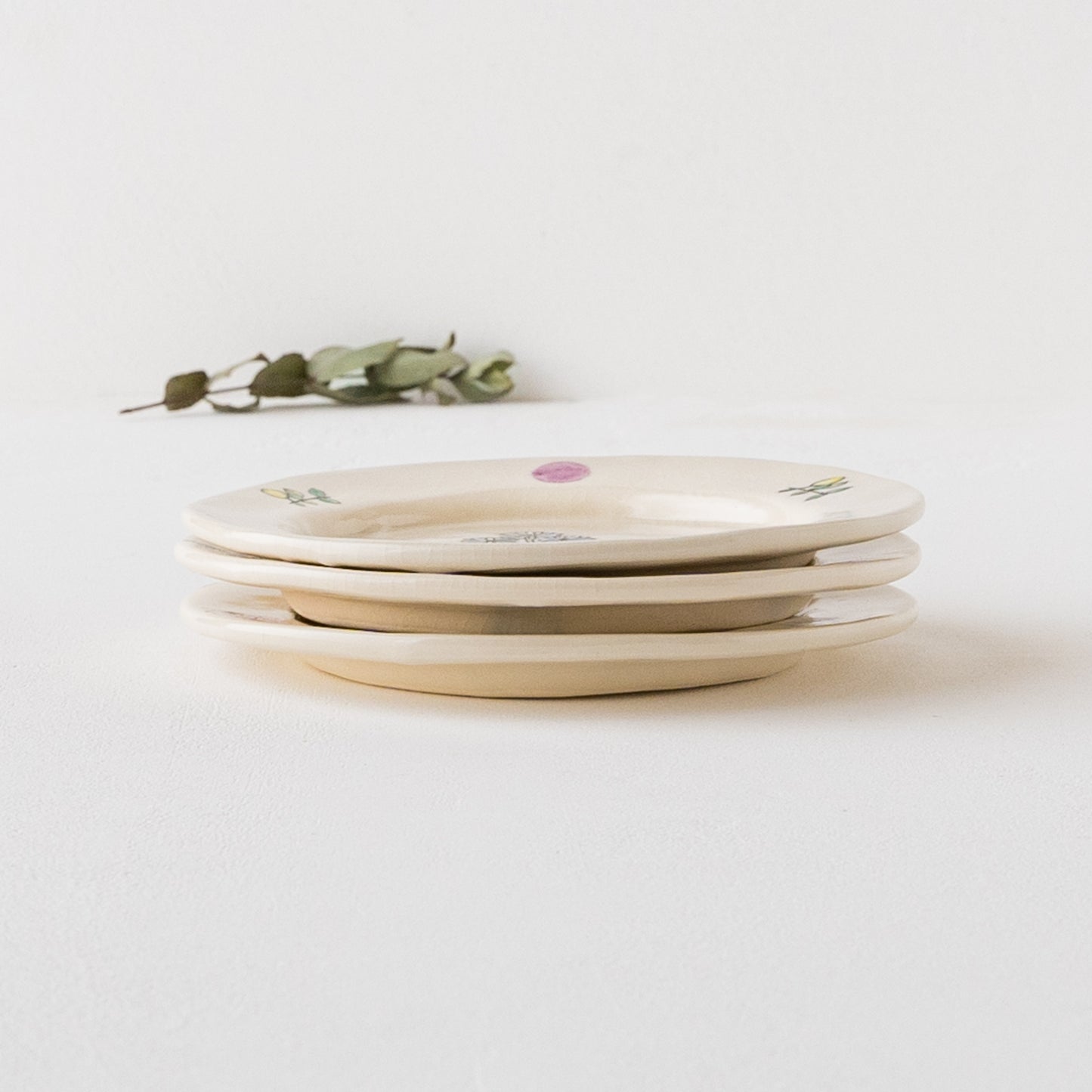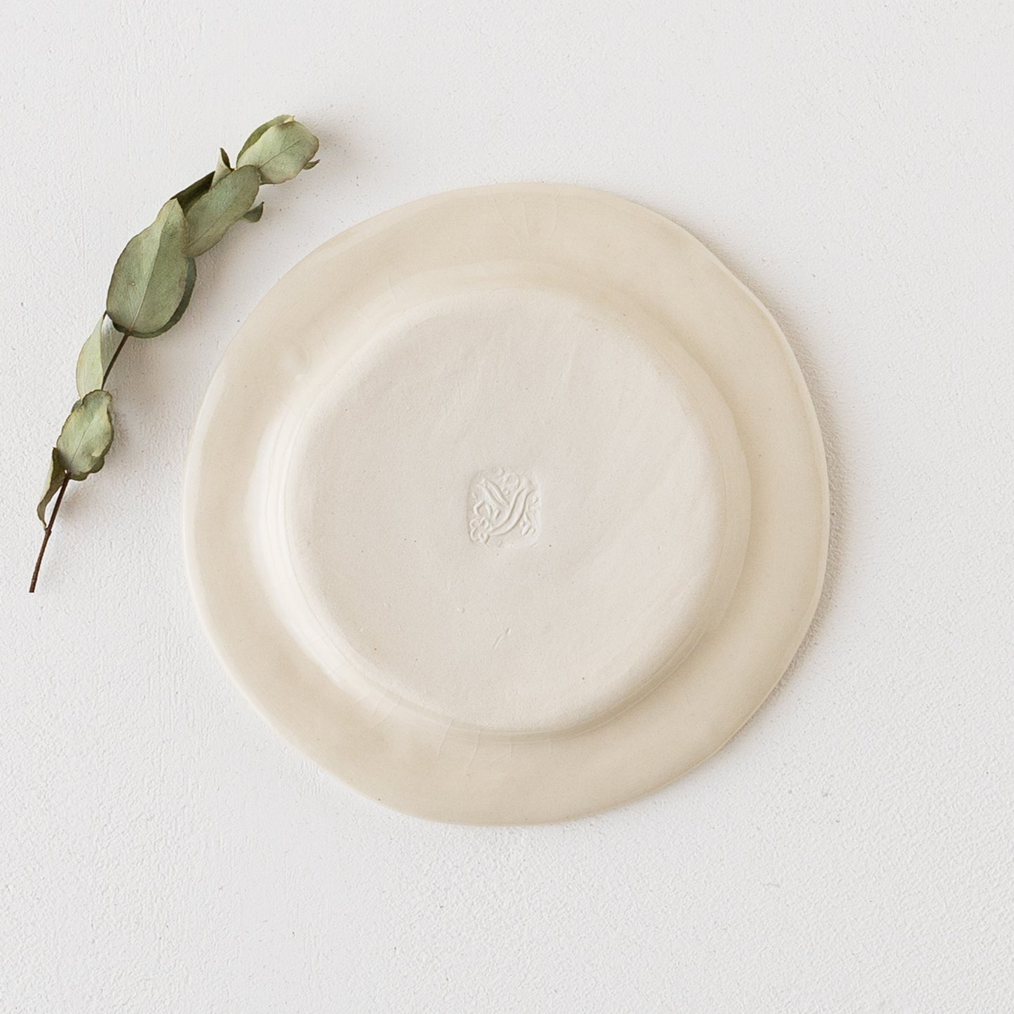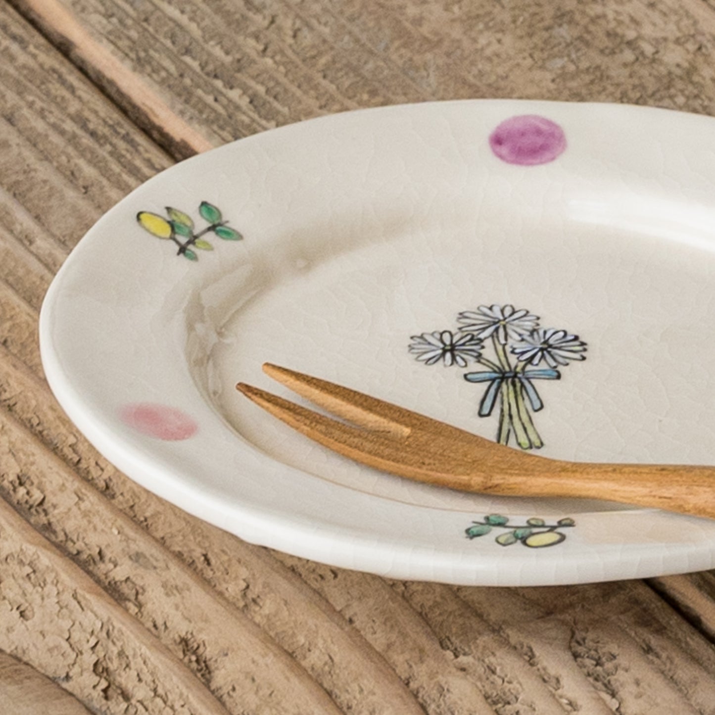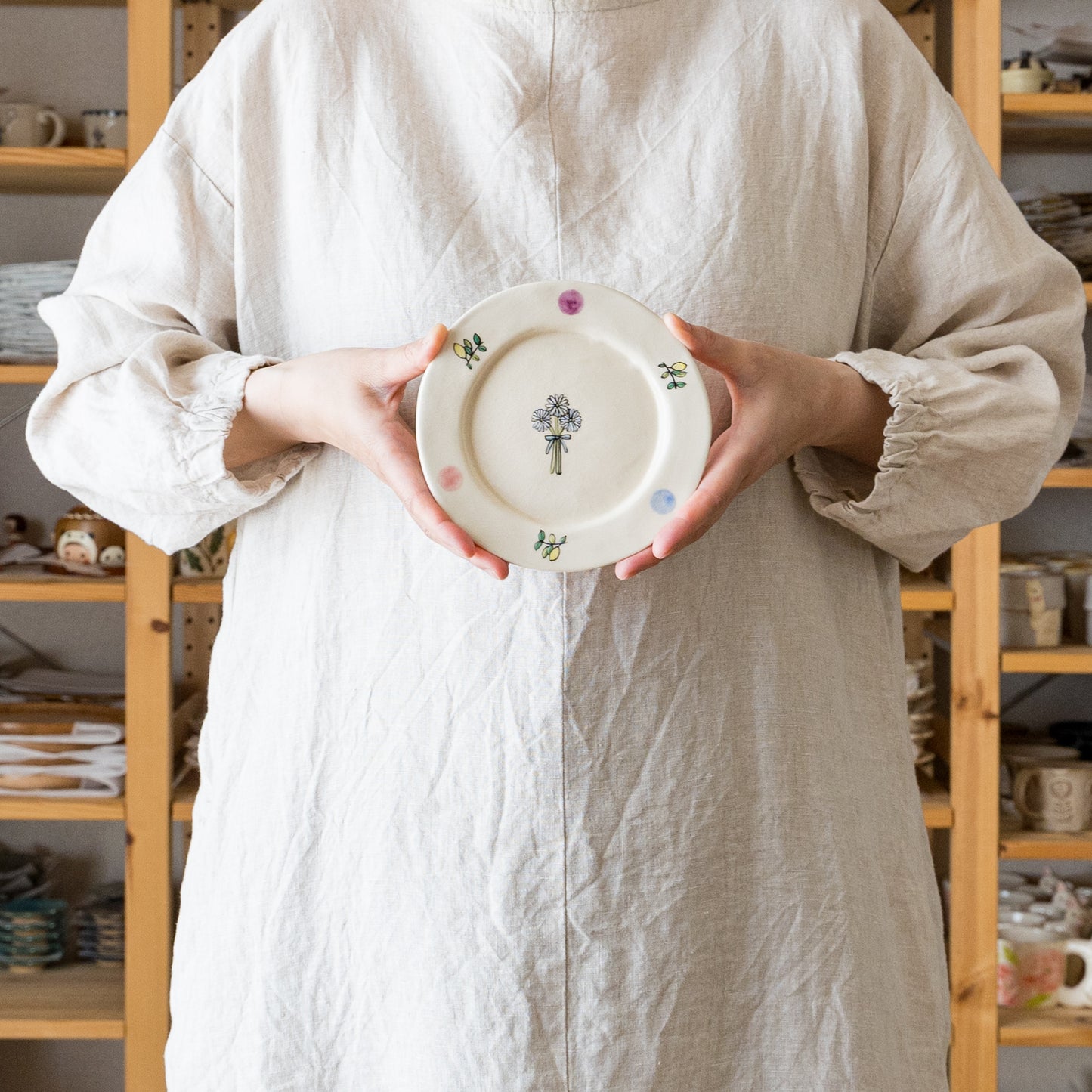 手仕事ならではの自然な歪みやフリーハンドで描かれるやさしいタッチの絵柄に温もりが伝わってきます。ほんのり黄色みがかった白もやわらかな風合いで気持ちが安らぎます。