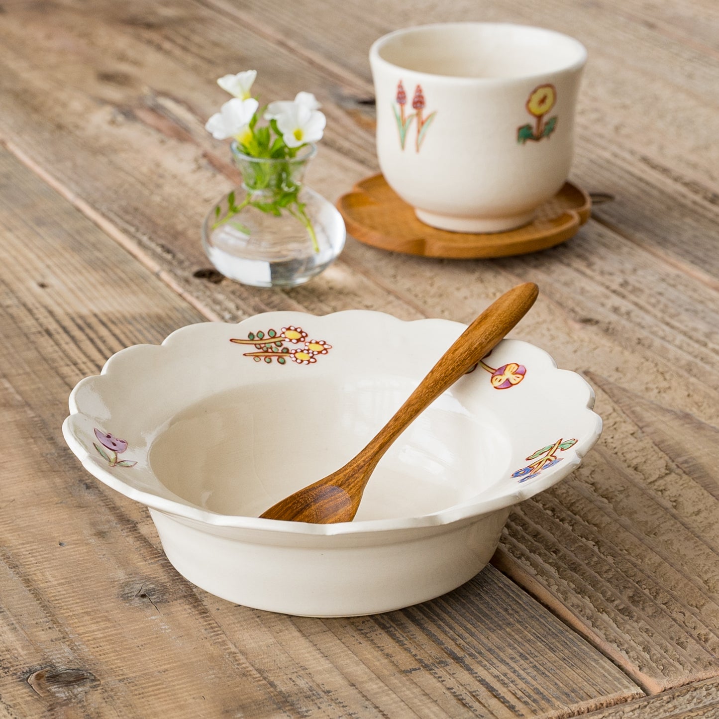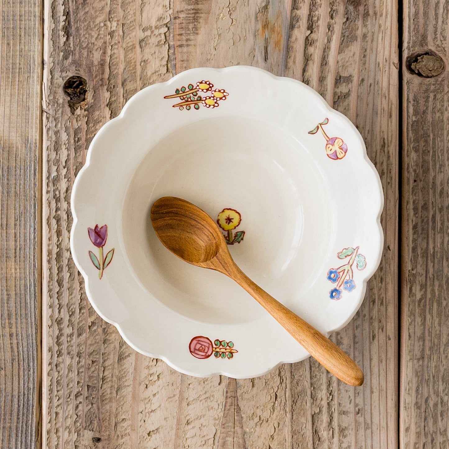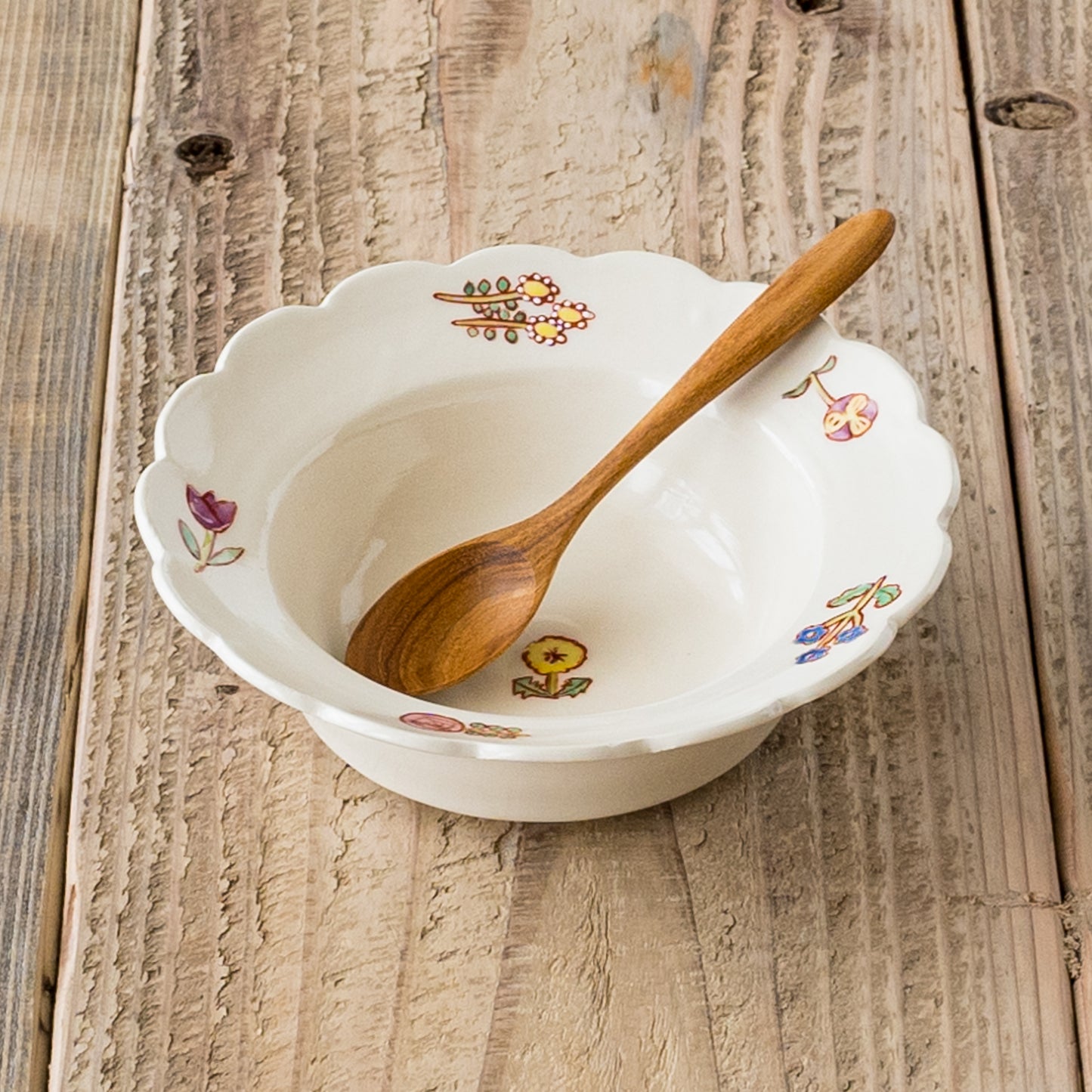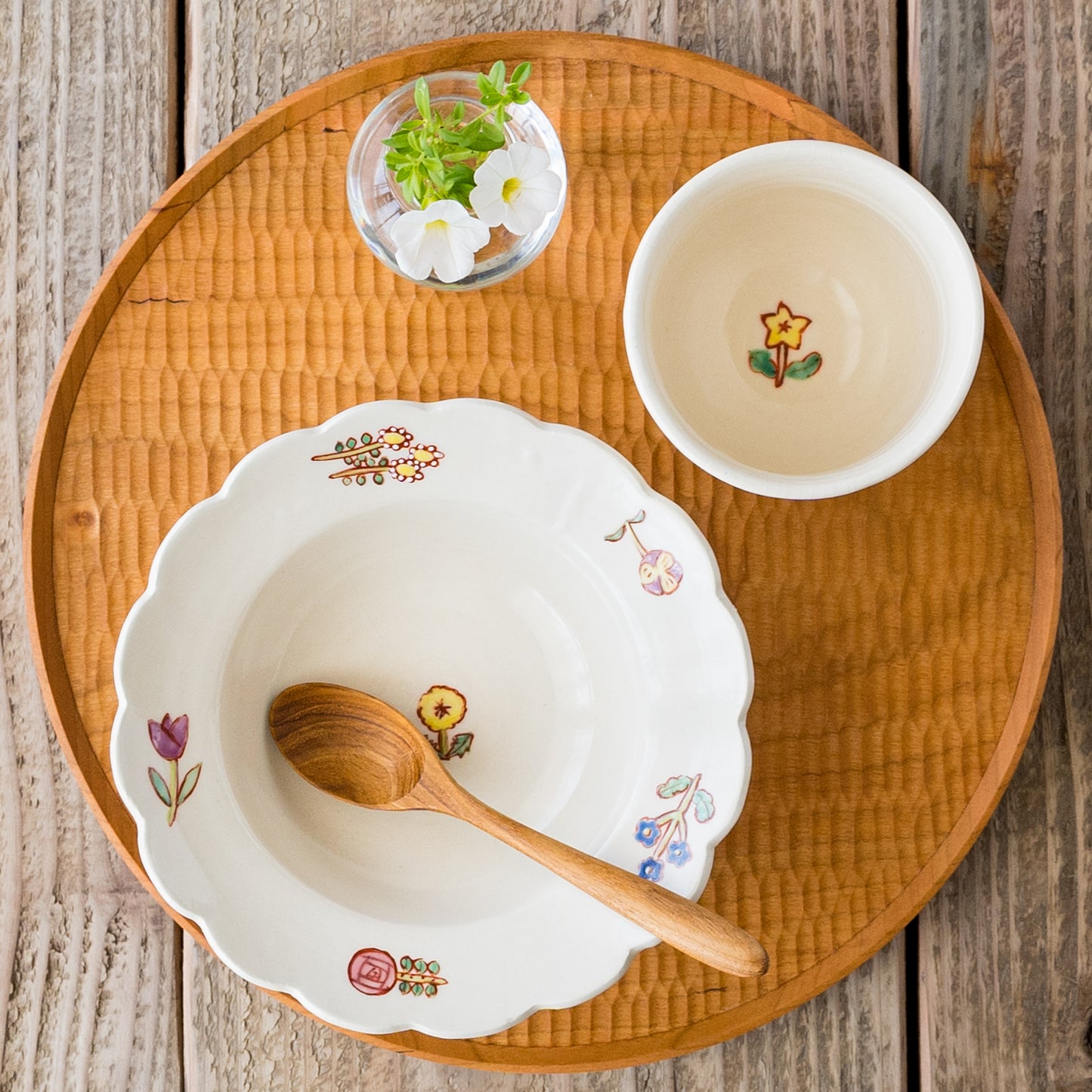 こんな愛らしいうつわが食卓に並べてあったら自然と顔がほころんでしまいます。色鮮やかな小花が盛り付けたお料理を素敵に引き立ててくれるので明るく楽しいテーブルにしてくれます。