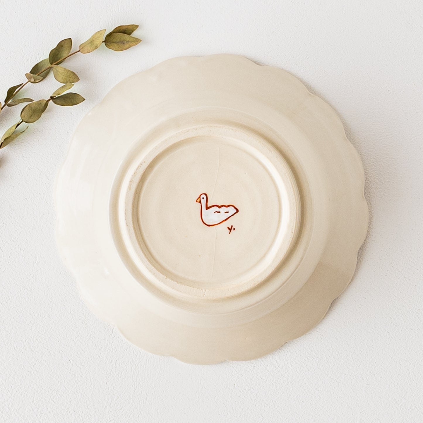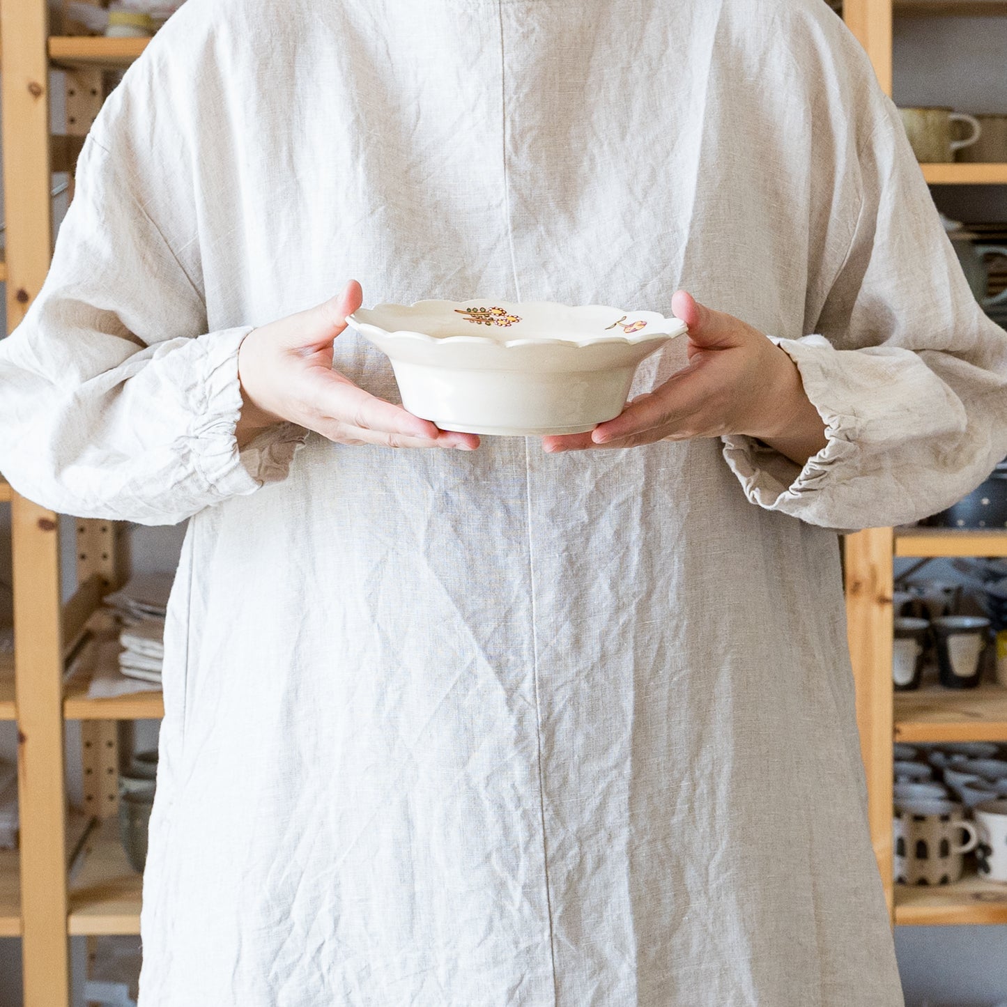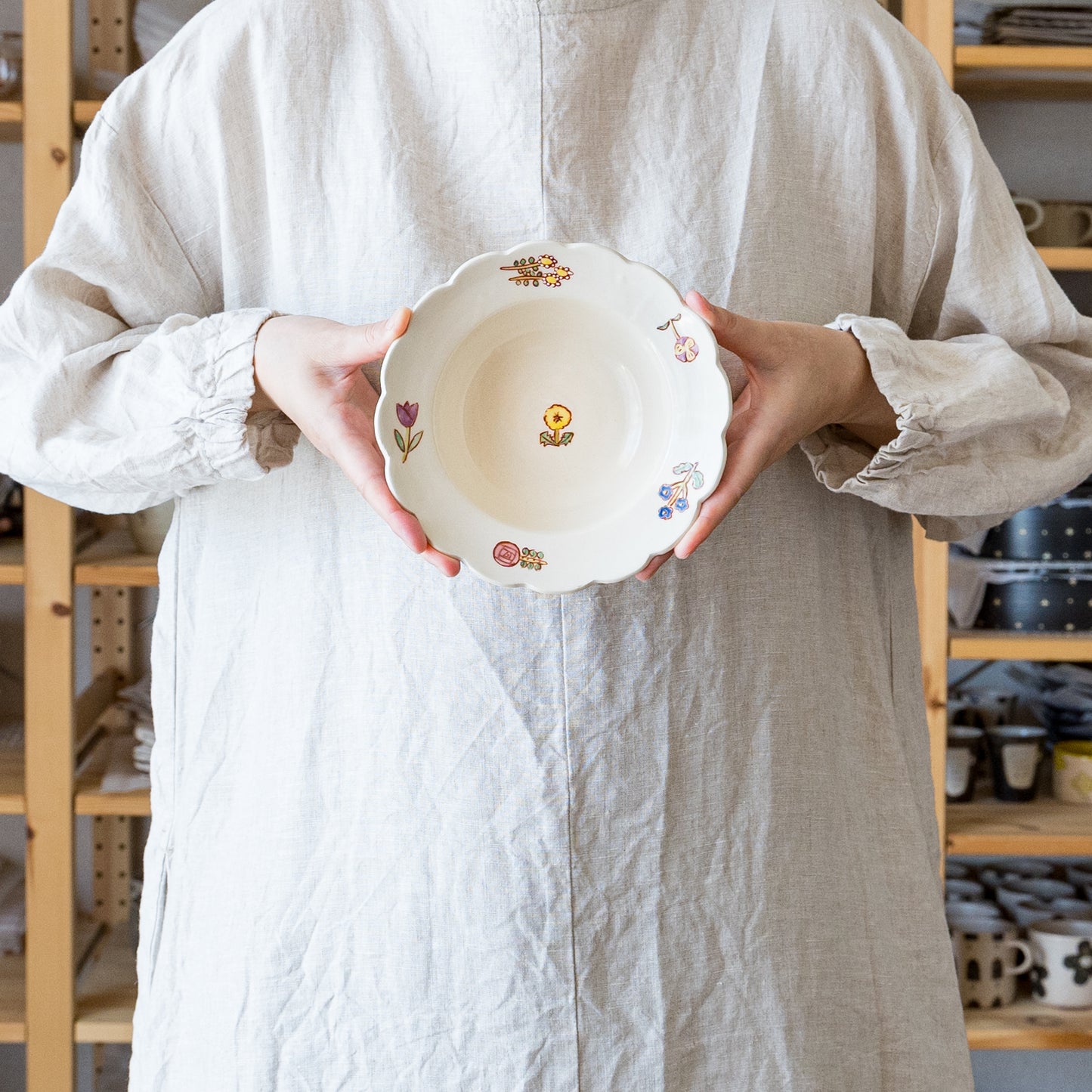 手仕事ならではの自然な揺らぎやフリーハンドで描かれるやさしいタッチの絵柄に温もりが伝わってきます。ほんのり黄色みがかった白もやわらかな風合いで心が安らぎます。
