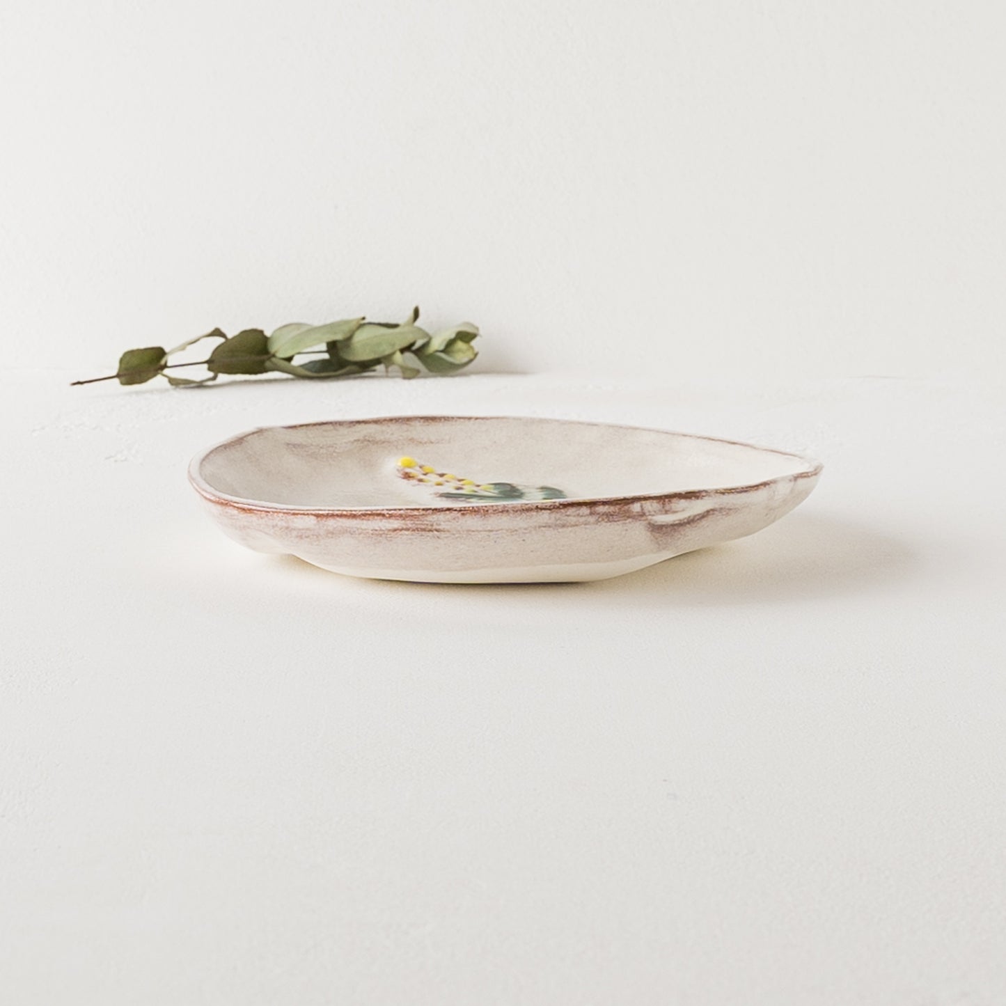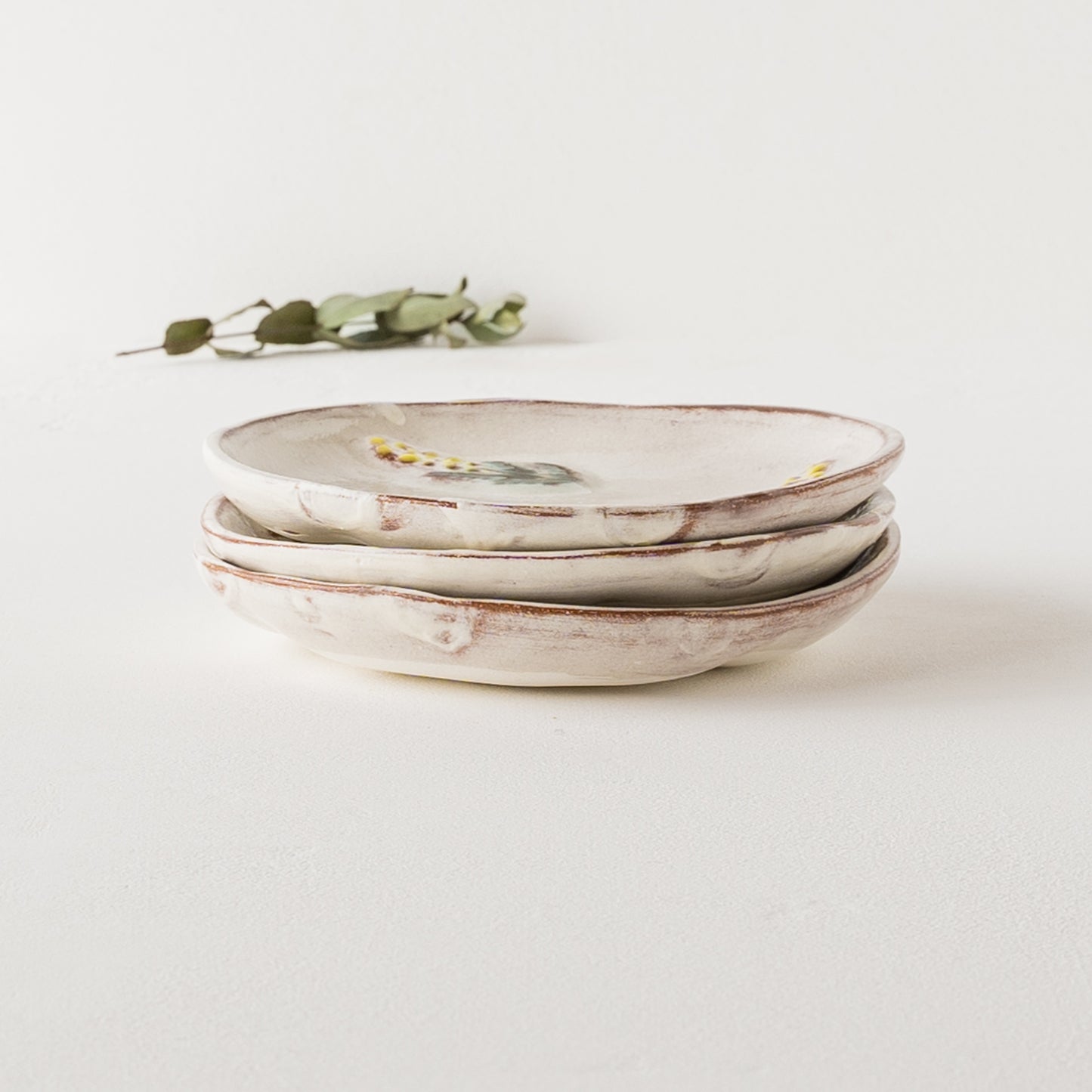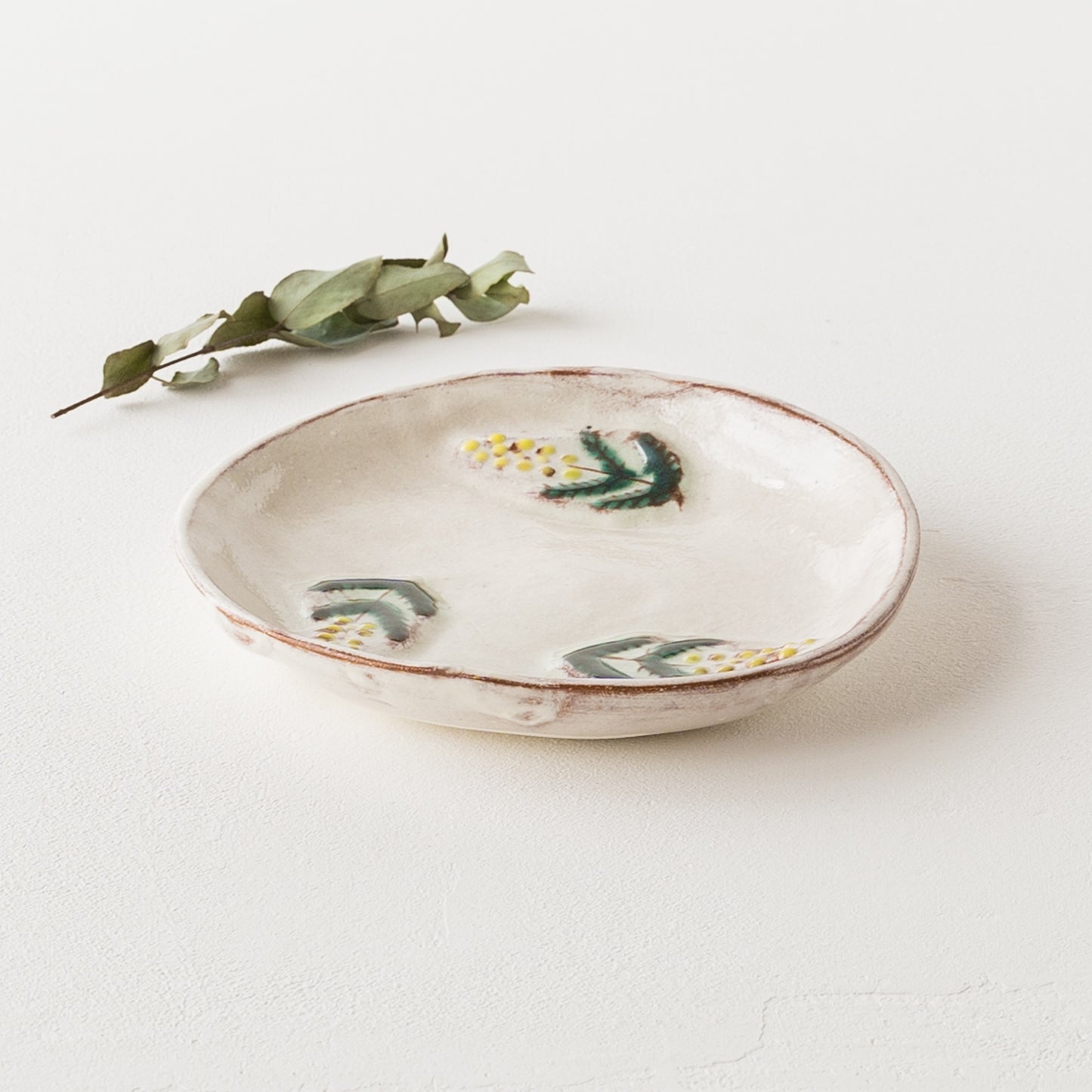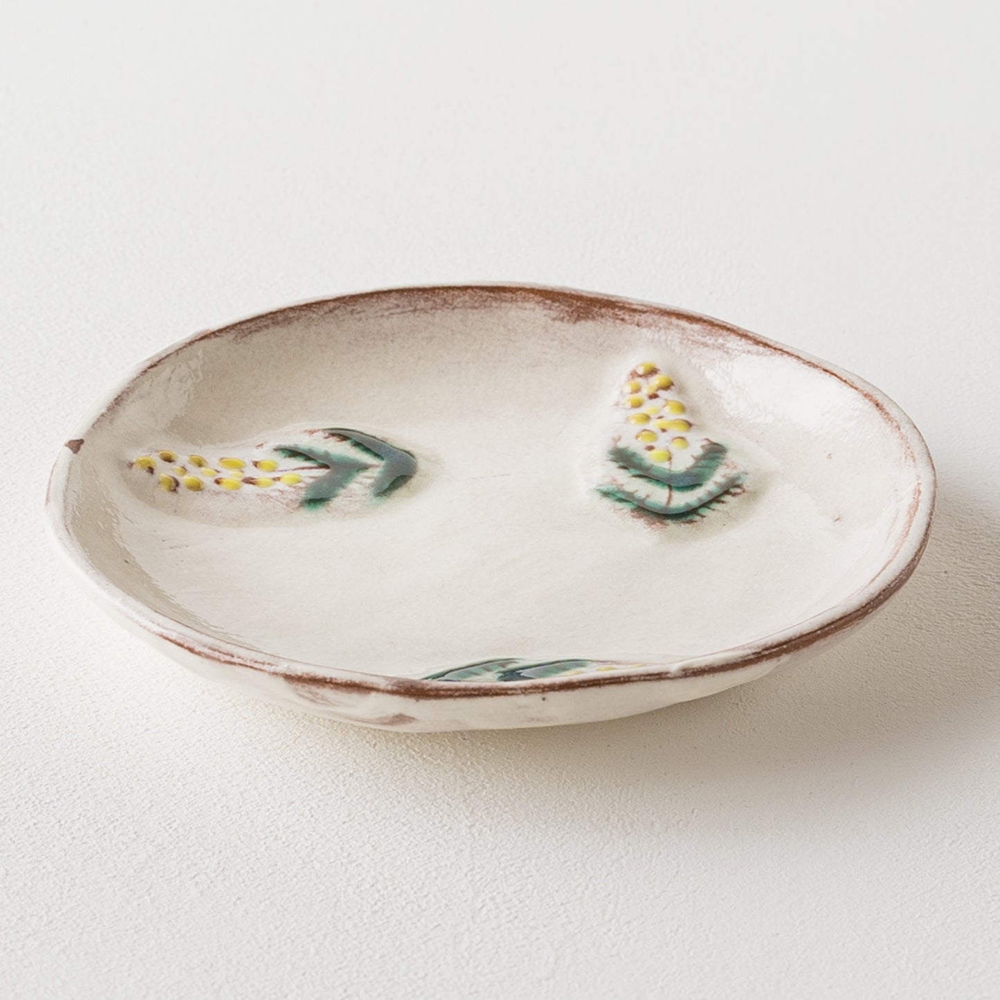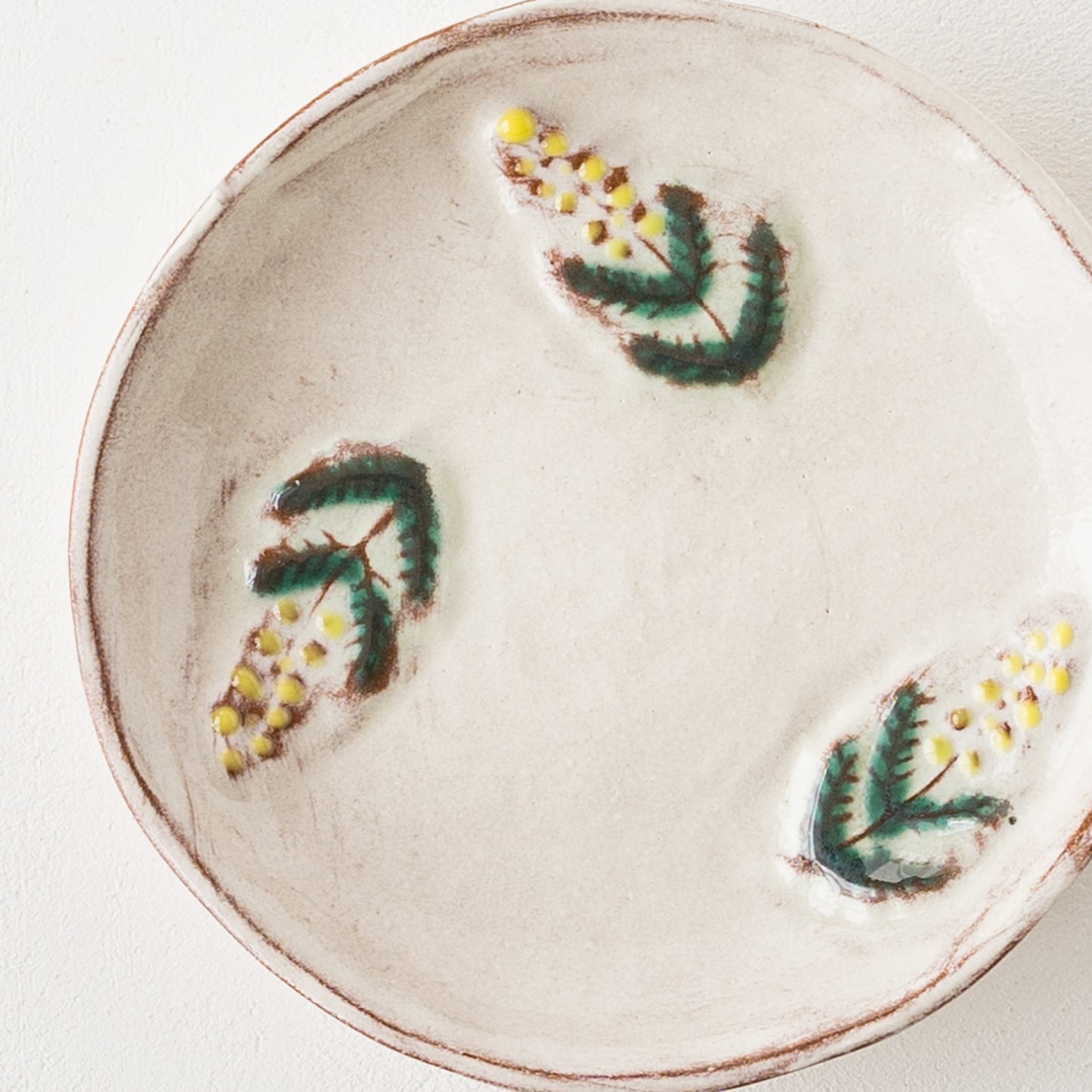 明るく爽やかなミモザ、白化粧土から覗く素地の赤土、手づくりならではのたわみや歪みなど素敵に調和していてほっこり癒されます。