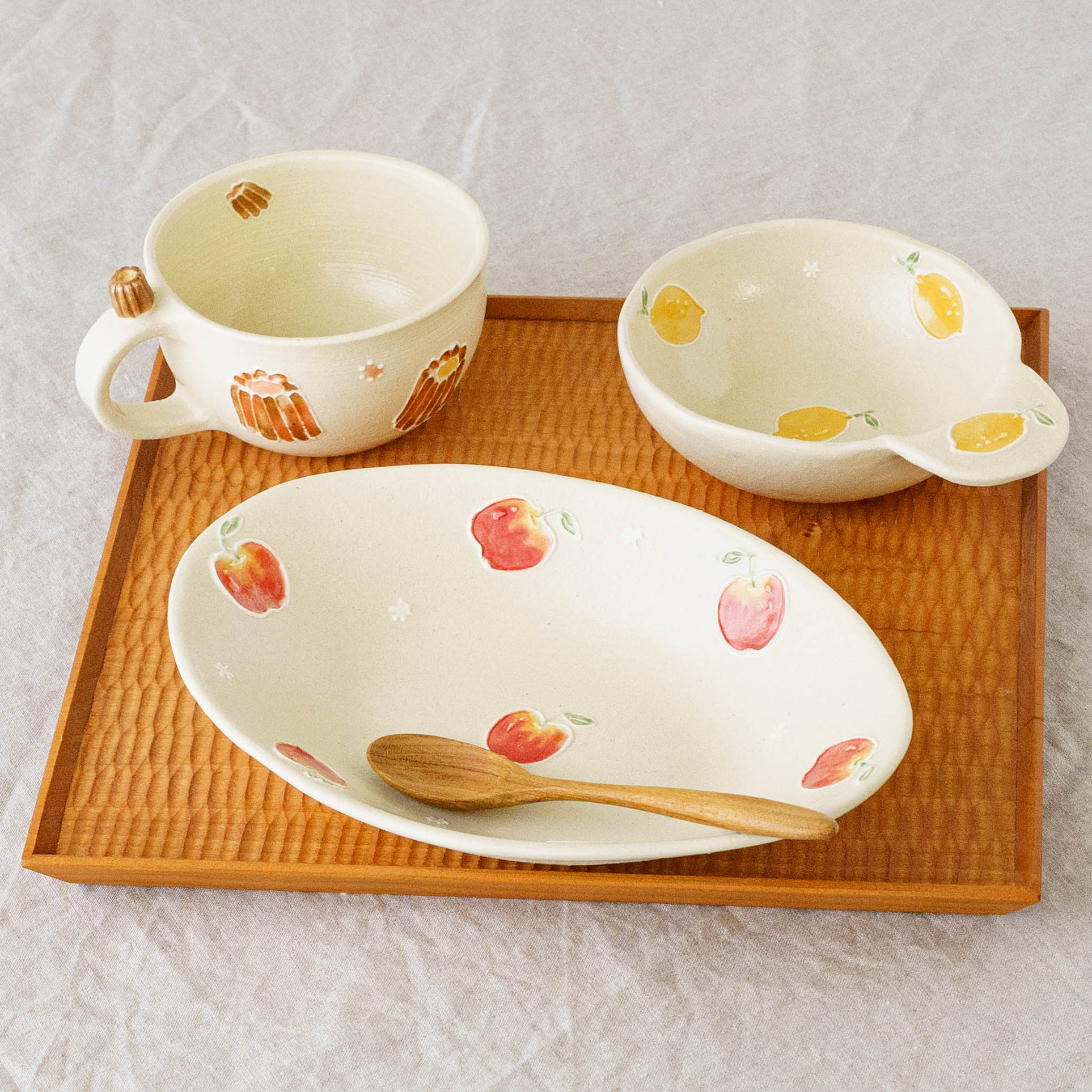 「この器に何をのせようかしら」と考える時間さえも楽しくなる。いつものおやつが小さなご褒美に変わったり、何気ない食卓が少しだけ特別なものになったり。美味しさと一緒に心がほどけるような時間。そんな小さなときめきを重ねられる、かわいいがたっぷり詰まったうつわです。