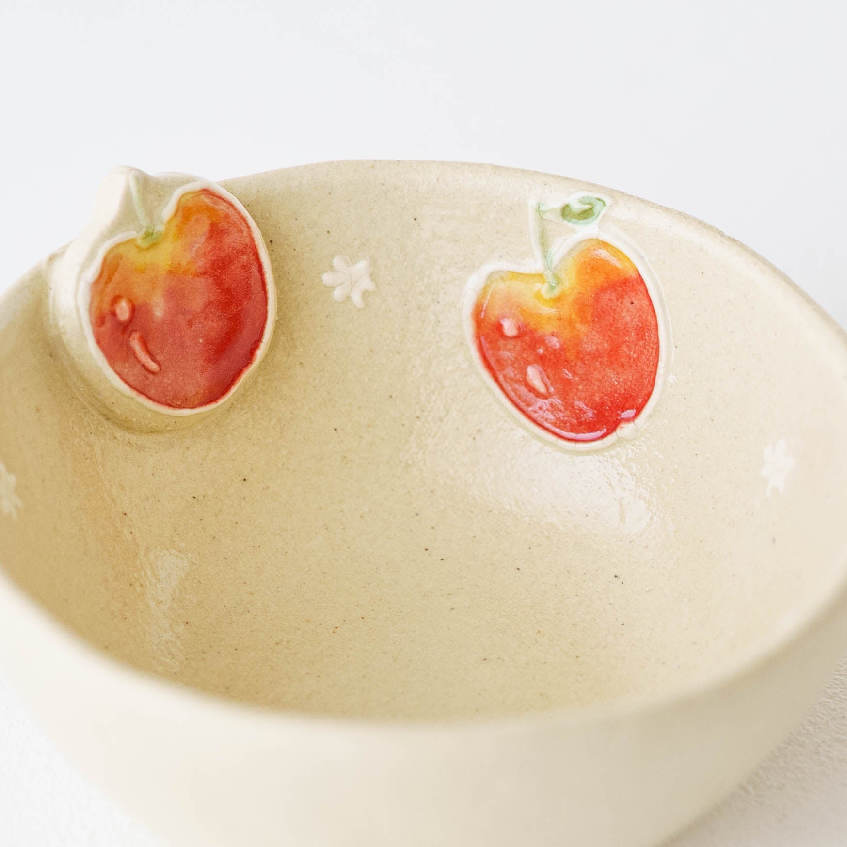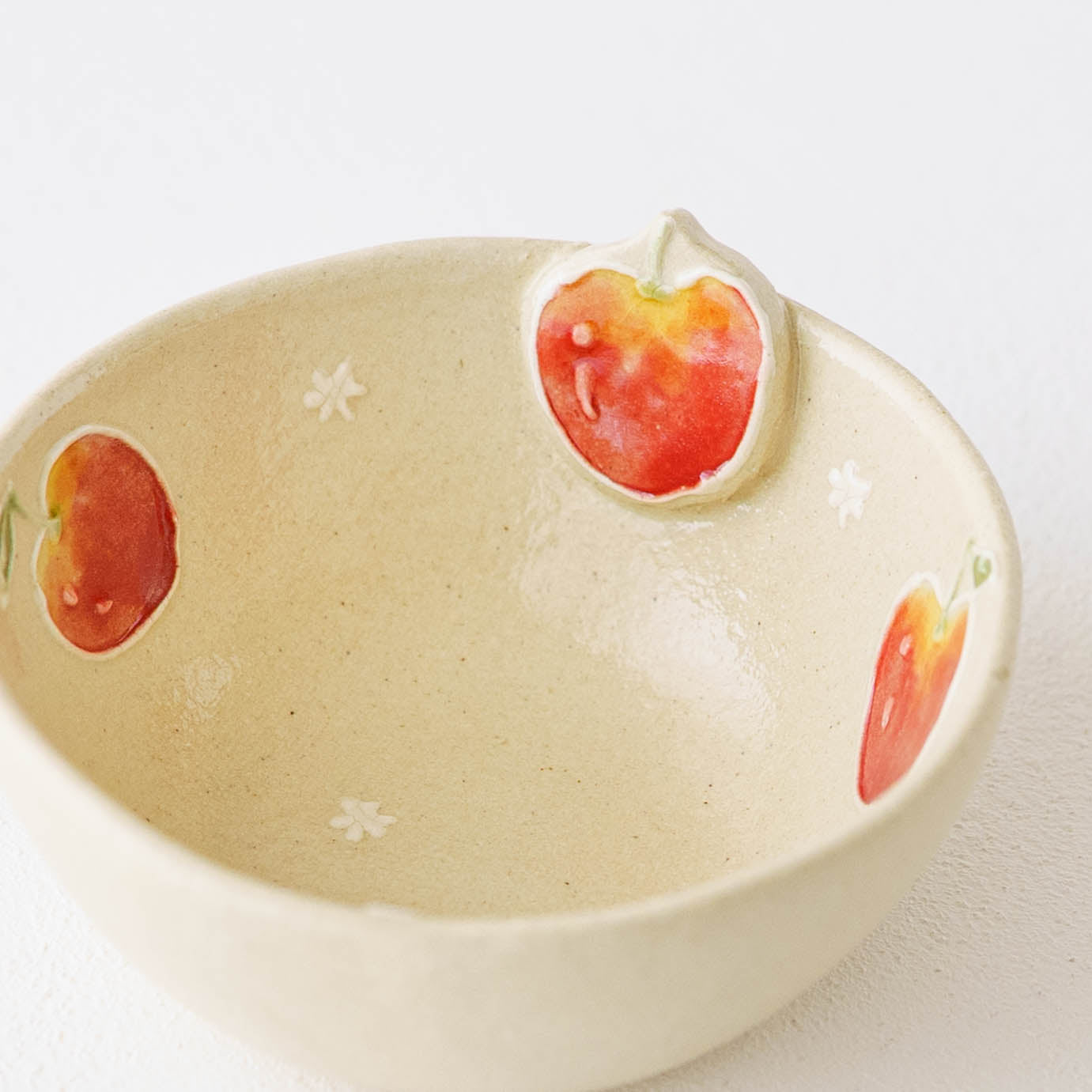 素地の上には、繊細さの中にも遊び心が感じられる絵柄がイッチン技法で描かれています。白泥で描いて素焼きをし、その後模様に色釉を施し本焼きをします。スイーツやフルーツの色彩と造形は、思わず本物かしら?と思うほど。精巧さの中にある愛らしさとどこか品のある表情が魅力です。