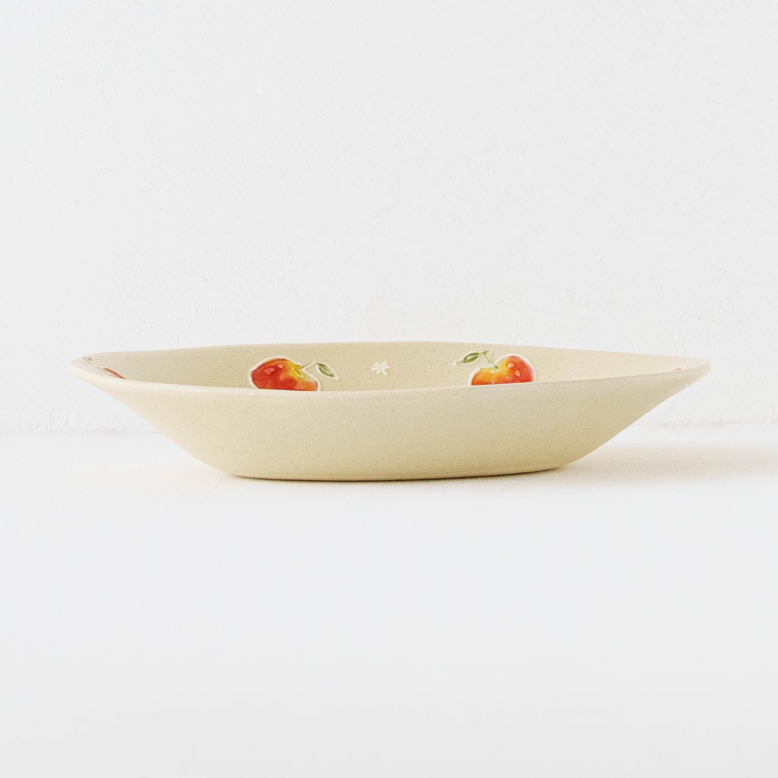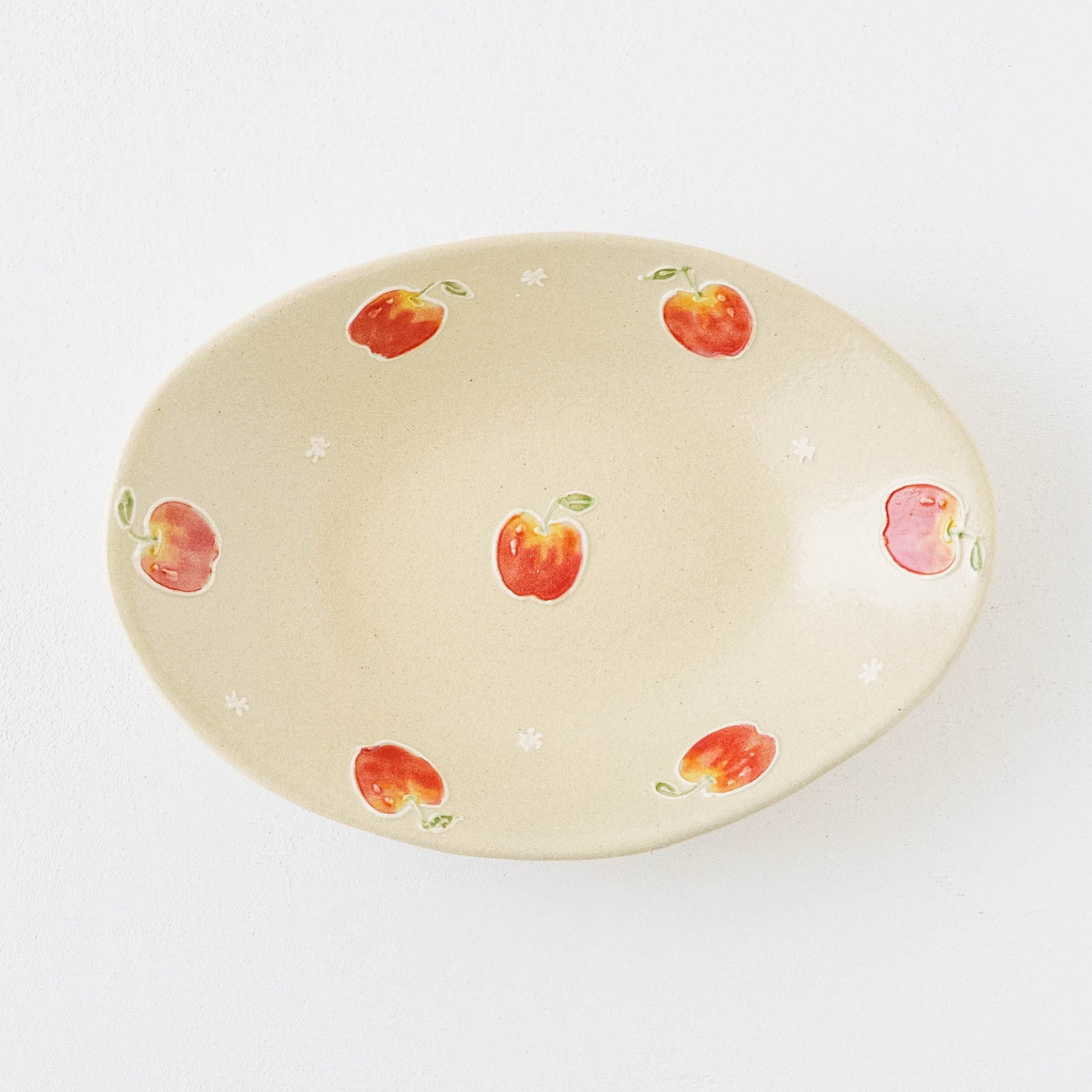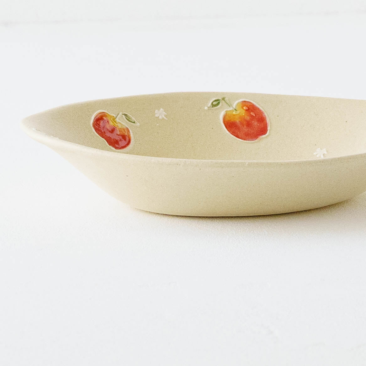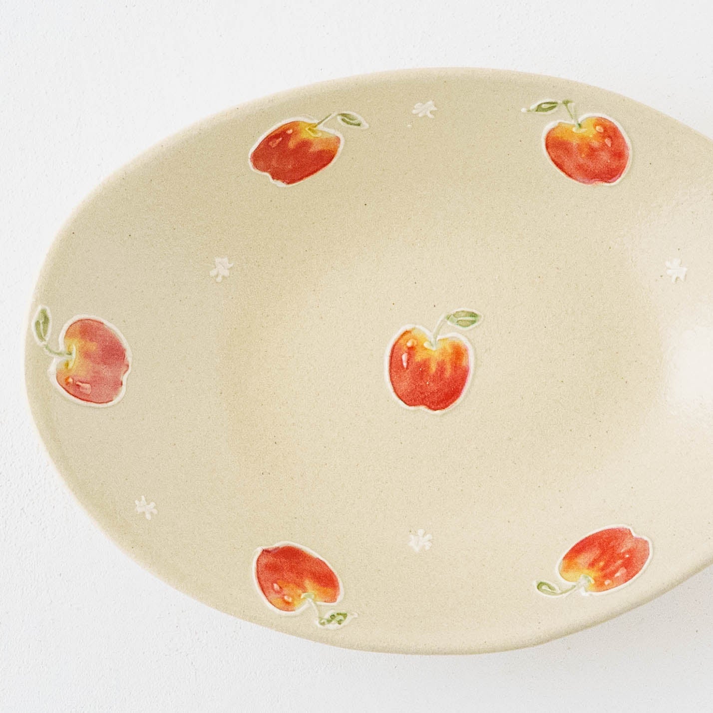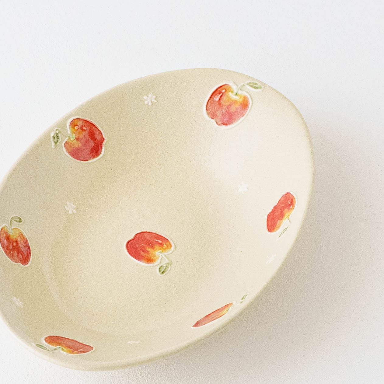 素地の上には、繊細さの中にも遊び心が感じられる絵柄がイッチン技法で描かれています。白泥で描いて素焼きをし、その後模様に色釉を施し本焼きをします。スイーツやフルーツの色彩と造形は、思わず本物かしら?と思うほど。精巧さの中にある愛らしさとどこか品のある表情が魅力です。