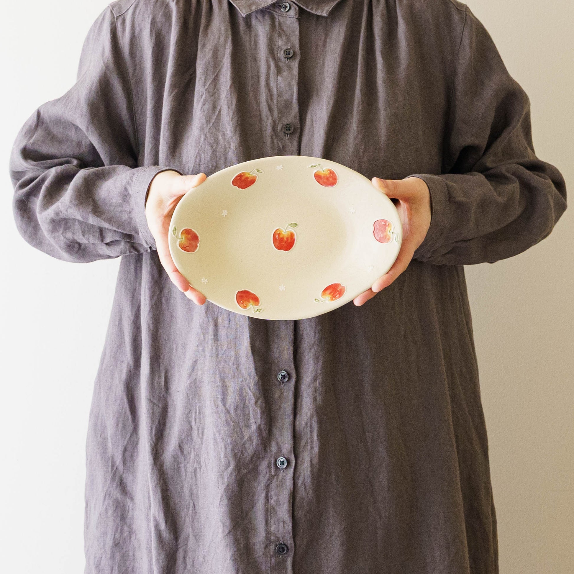 やわらかな土のぬくもりに、そっと忍ばせた可憐な気配。ロクロで成形された器は、無駄のないシンプルなかたちながら、愛くるしい絵柄に自然と笑顔になってしまいます。手に取ると自然と馴染み、使うほどに日常の風景に溶け込んでいく。そんな“ちょうどよさ”を大切に生み出されています。