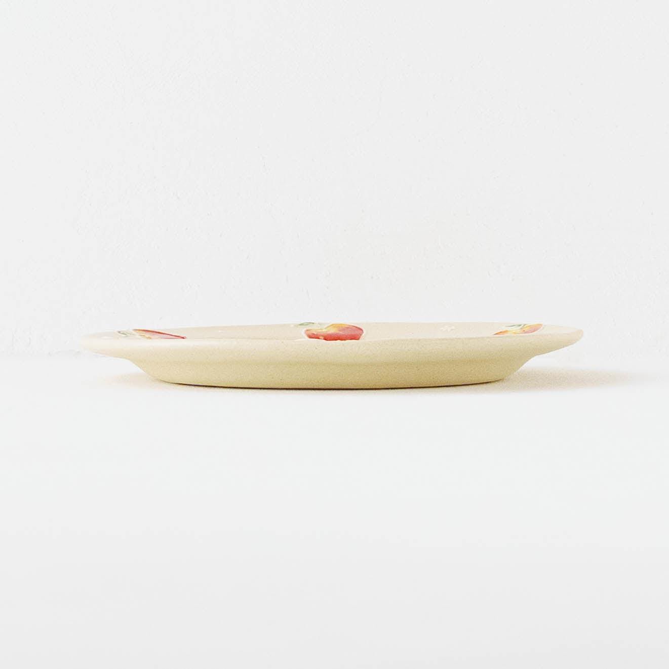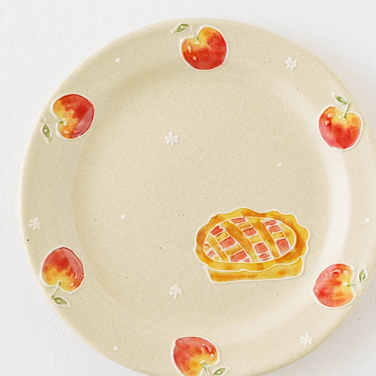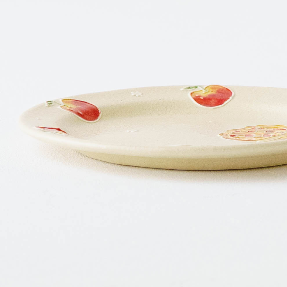 素地の上には、繊細さの中にも遊び心が感じられる絵柄がイッチン技法で描かれています。白泥で描いて素焼きをし、その後模様に色釉を施し本焼きをします。スイーツやフルーツの色彩と造形は、思わず本物かしら?と思うほど。精巧さの中にある愛らしさとどこか品のある表情が魅力です。