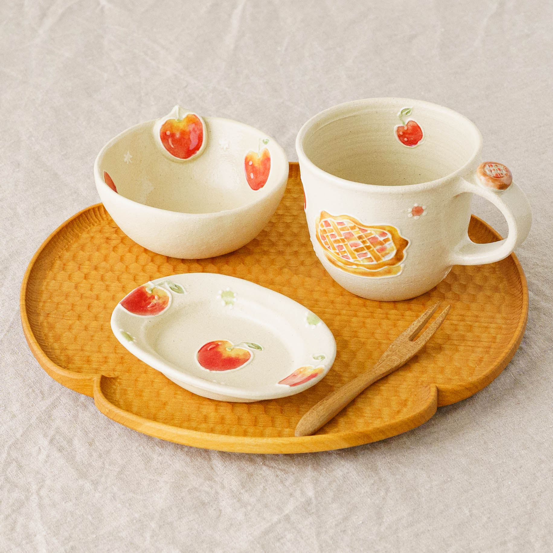 「この器に何をのせようかしら」と考える時間さえも楽しくなる。いつものおやつが小さなご褒美に変わったり、何気ない食卓が少しだけ特別なものになったり。美味しさと一緒に心がほどけるような時間。そんな小さなときめきを重ねられる、かわいいがたっぷり詰まったうつわです。