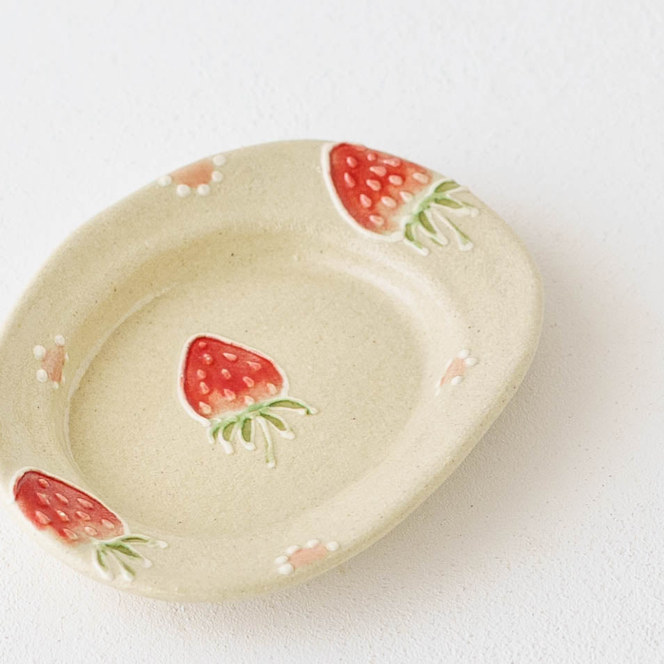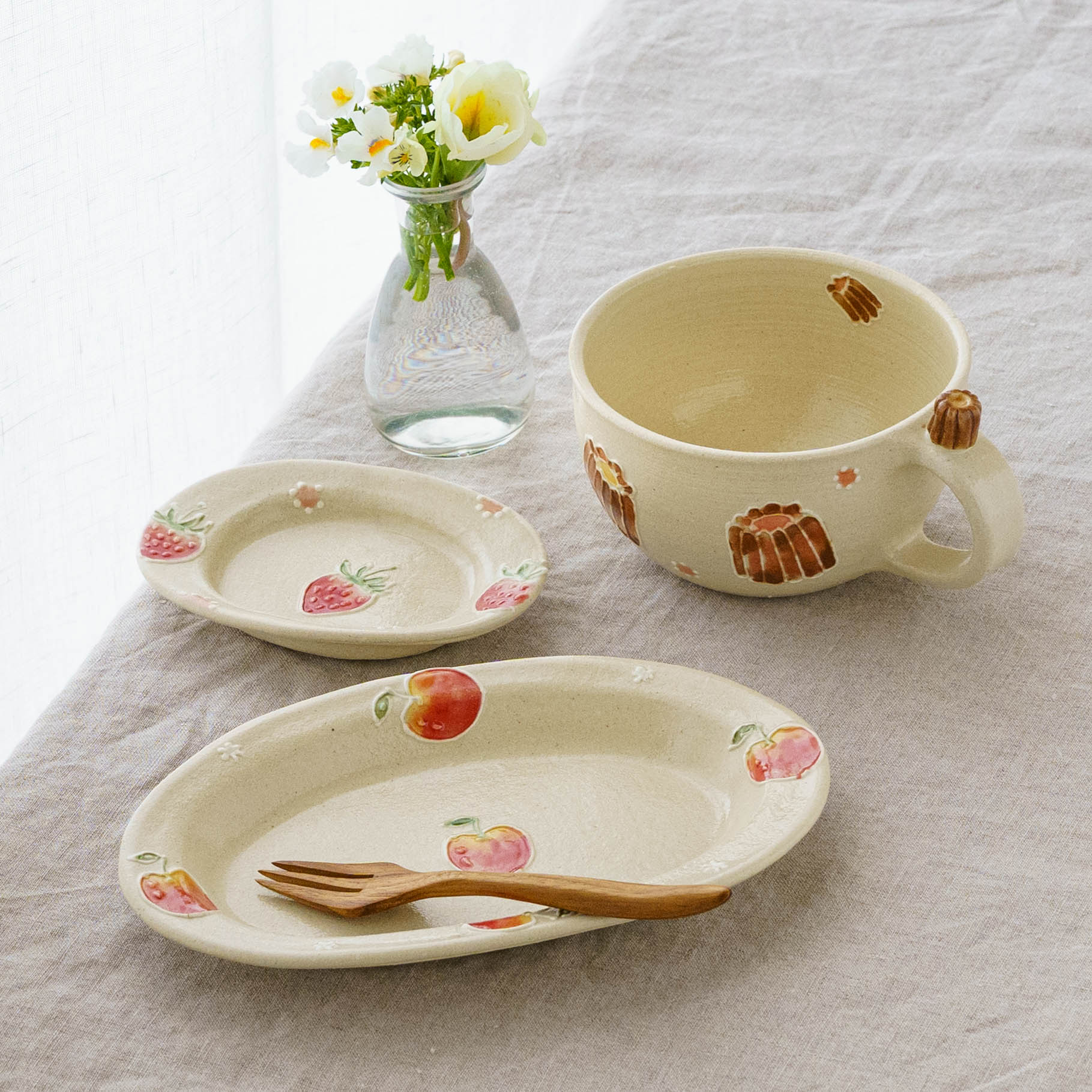 「この器に何をのせようかしら」と考える時間さえも楽しくなる。いつものおやつが小さなご褒美に変わったり、何気ない食卓が少しだけ特別なものになったり。美味しさと一緒に心がほどけるような時間。そんな小さなときめきを重ねられる、かわいいがたっぷり詰まったうつわです。