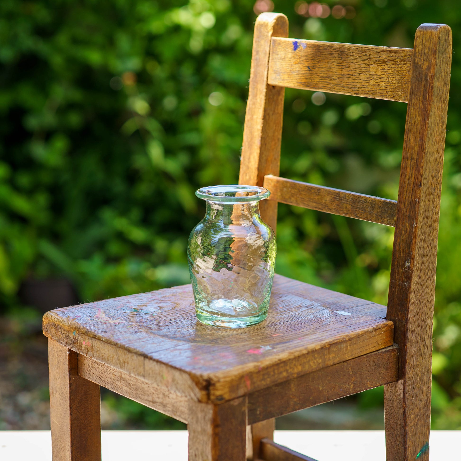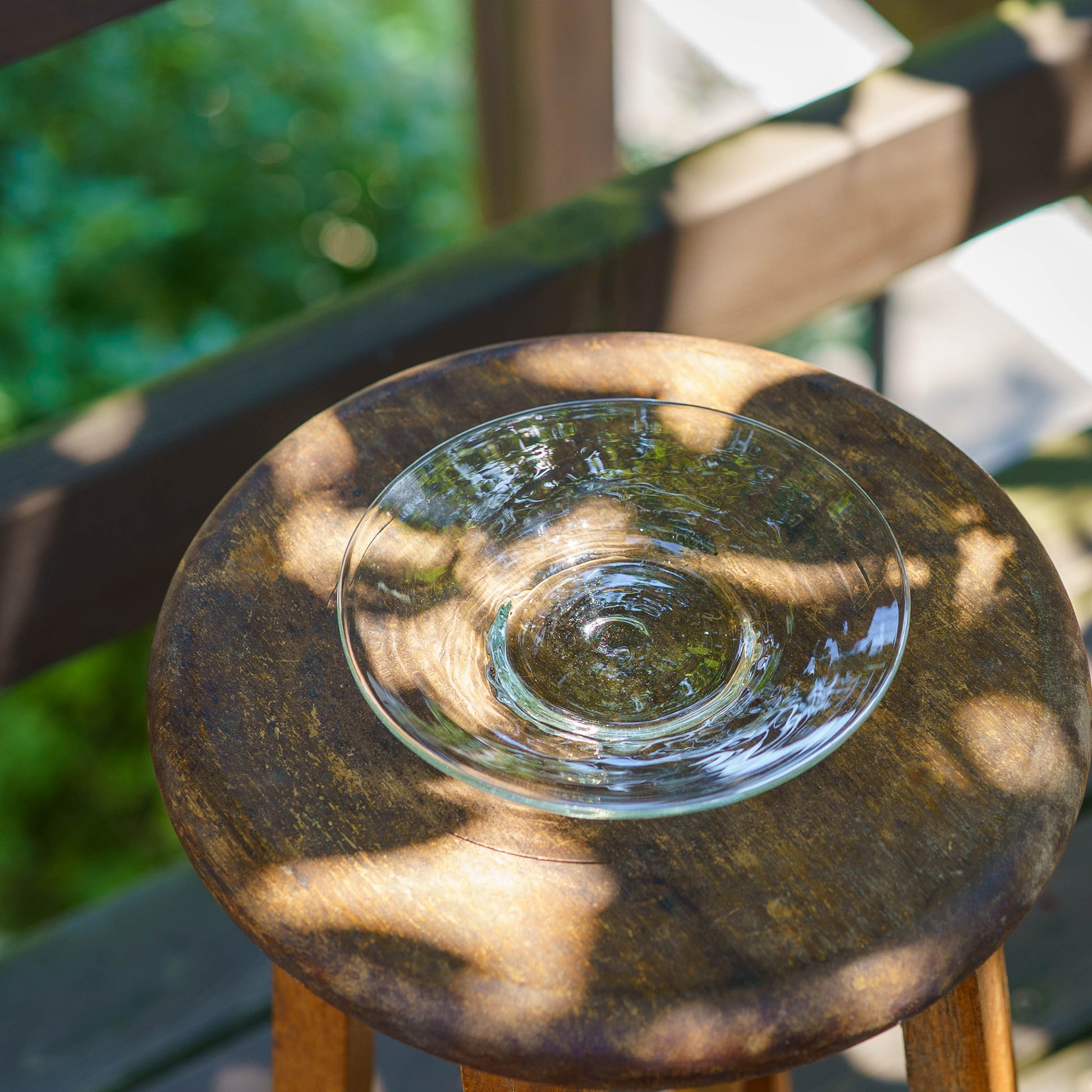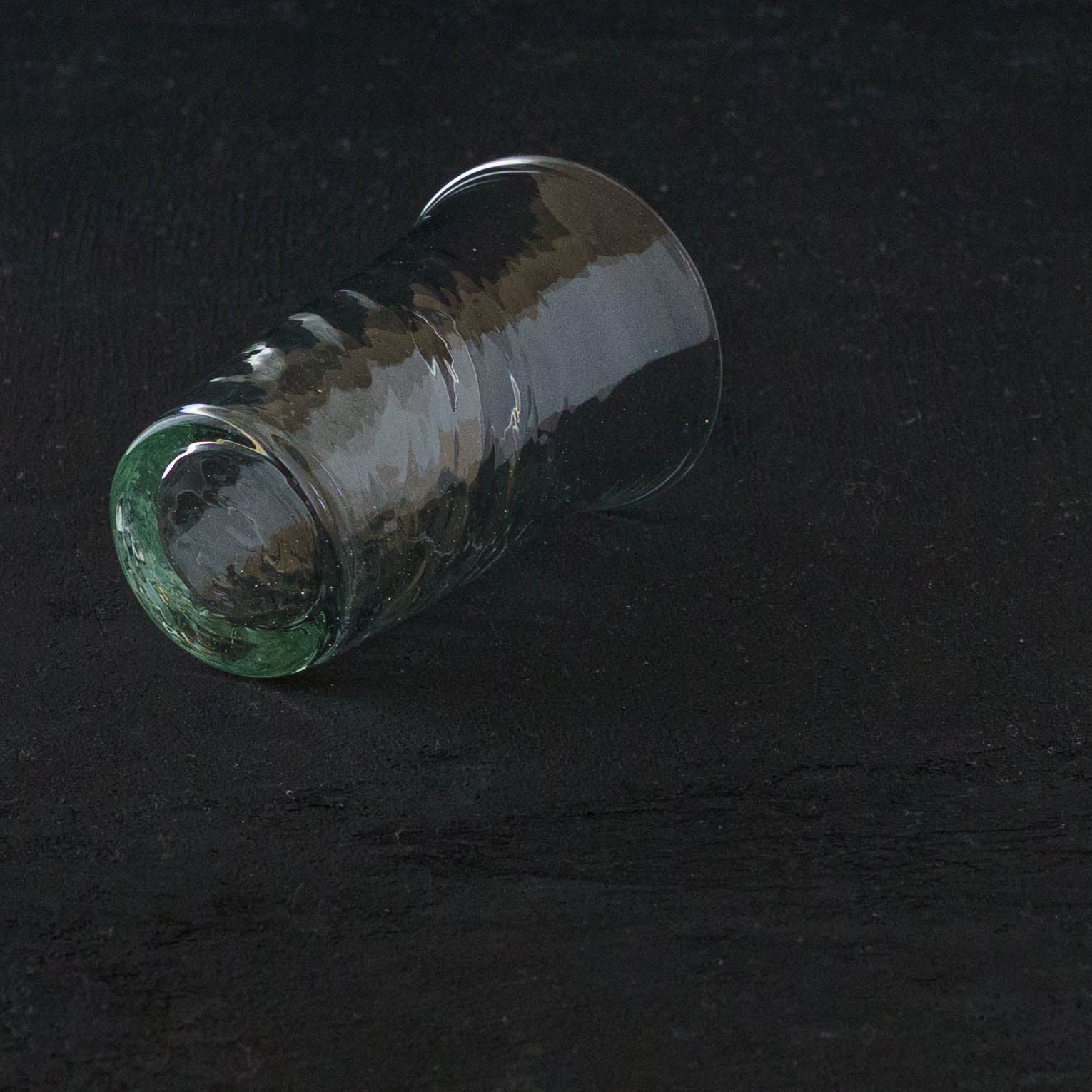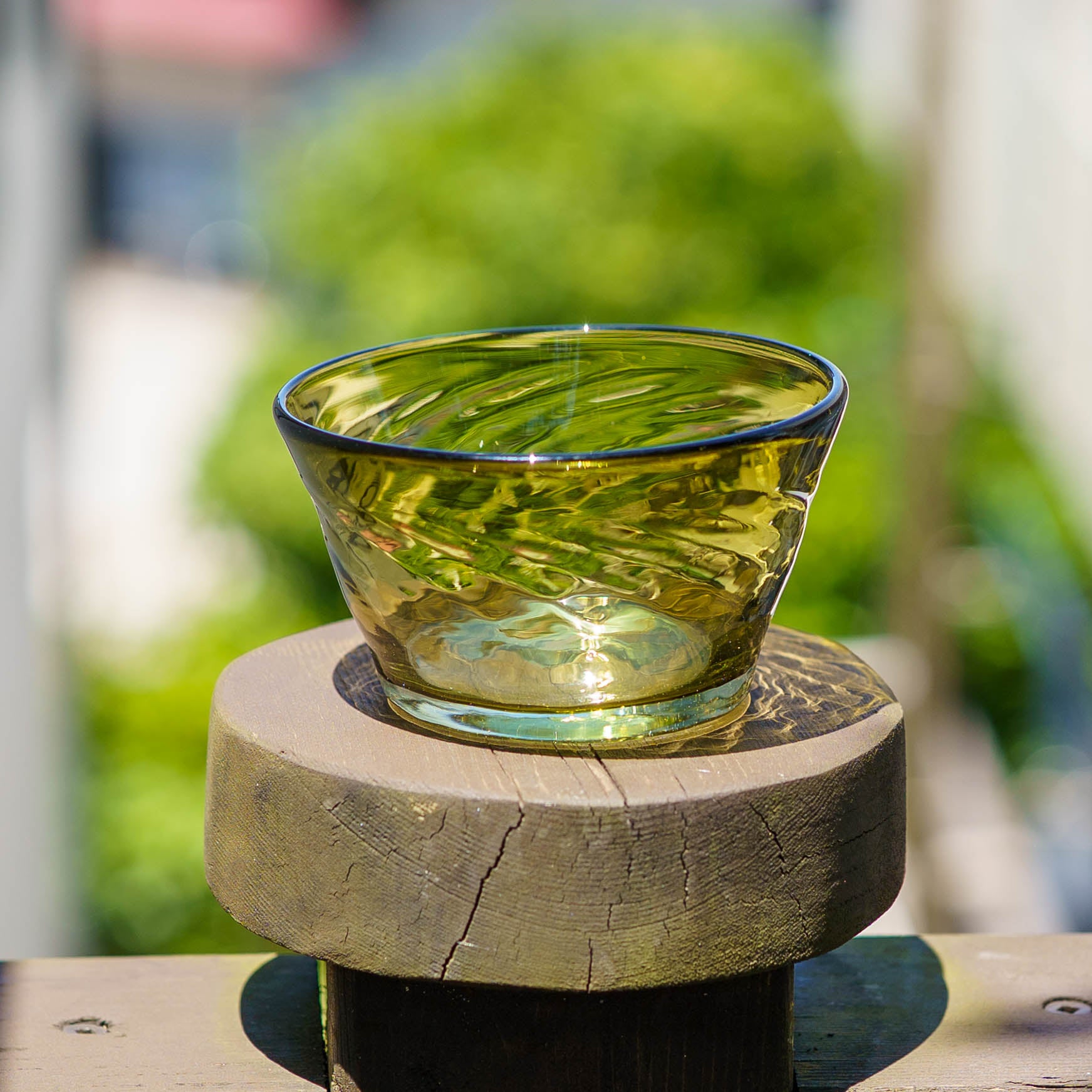 廃瓶や古いガラス窓などを材料に作られる再生ガラス。使い終わった酒瓶を丁寧に洗い、ラベルを剥がし炉で溶かす。ひとつひとつ、吹きガラス技法で紡ぎだすうつわたちは、淡くやさしい輝きをまといながら、ぬくもりを感じさせてくれるうつわへと生まれ変わります。