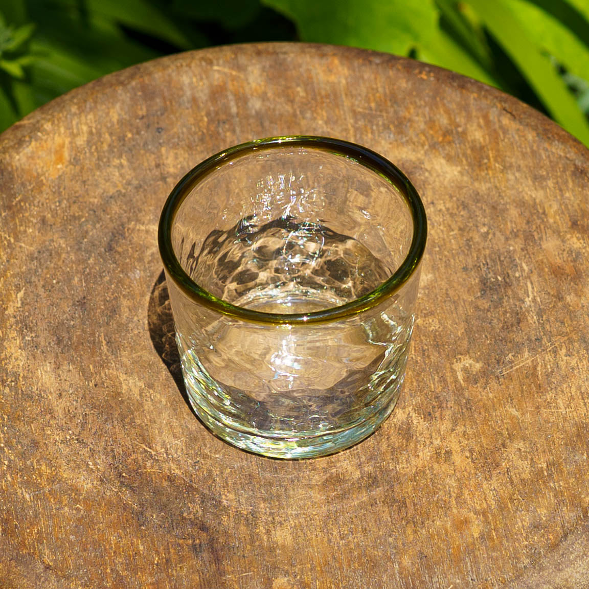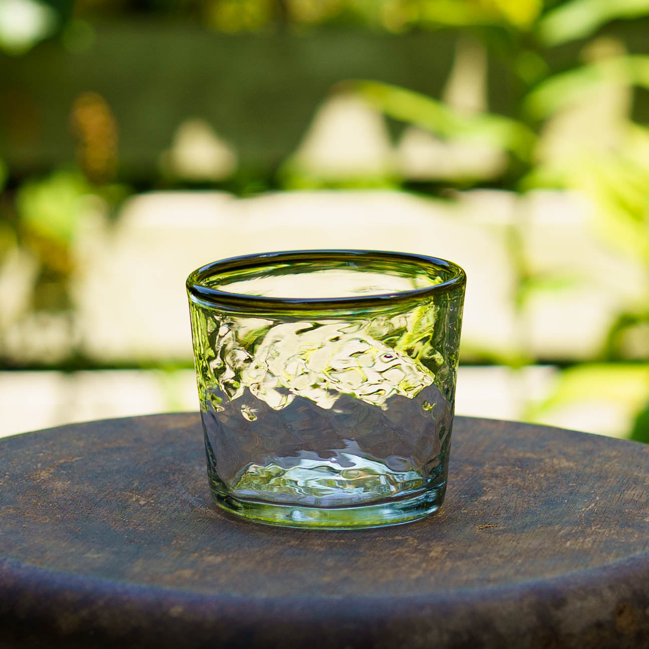 廃瓶や古いガラス窓などを材料に作られる再生ガラス。使い終わった酒瓶を丁寧に洗い、ラベルを剥がし炉で溶かす。ひとつひとつ、吹きガラス技法で紡ぎだすうつわたちは、淡くやさしい輝きをまといながら、ぬくもりを感じさせてくれるうつわへと生まれ変わります。