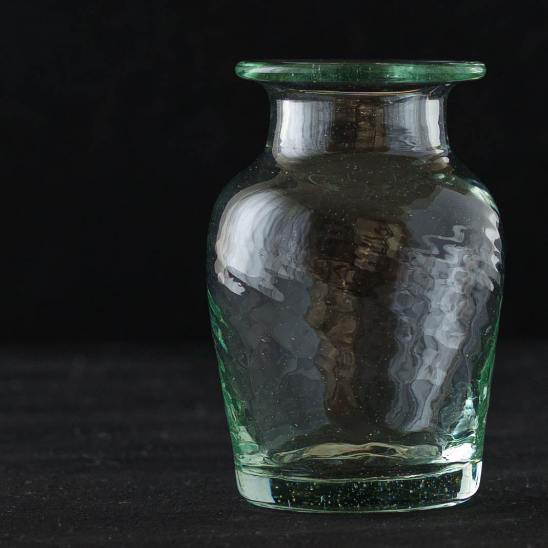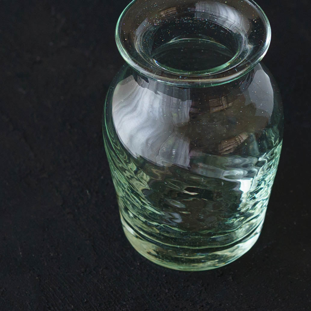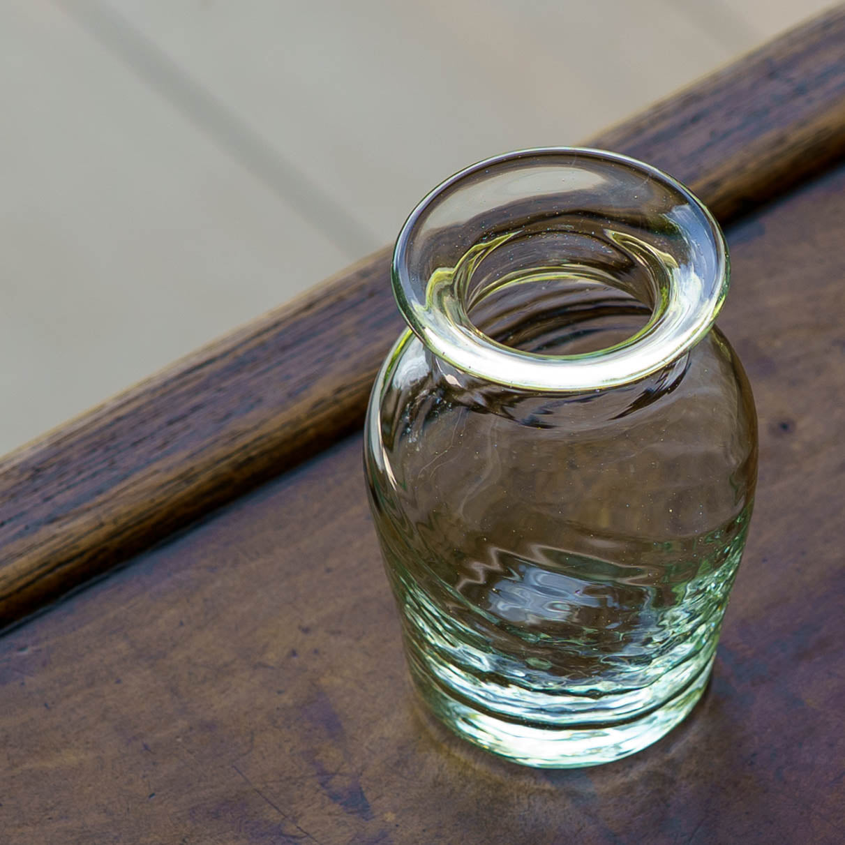 廃瓶や古いガラス窓などを材料に作られる再生ガラス。使い終わった酒瓶を丁寧に洗い、ラベルを剥がし炉で溶かす。ひとつひとつ、吹きガラス技法で紡ぎだすうつわたちは、淡くやさしい輝きをまといながら、ぬくもりを感じさせてくれるうつわへと生まれ変わります。